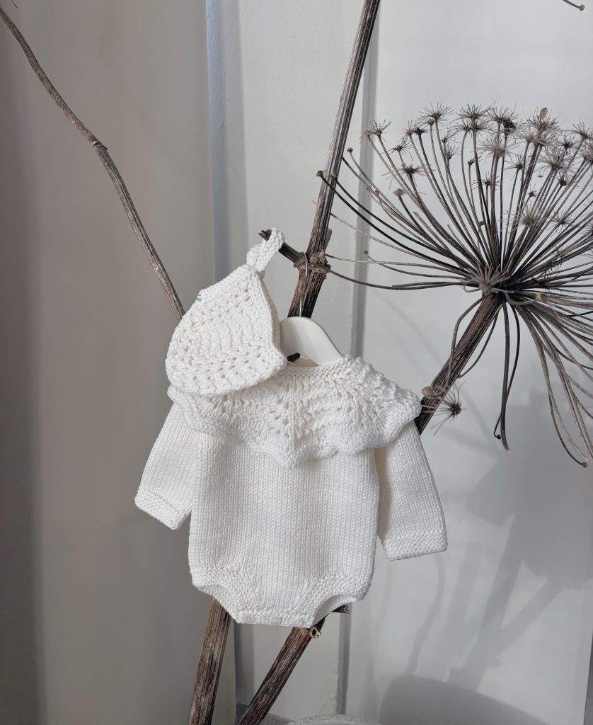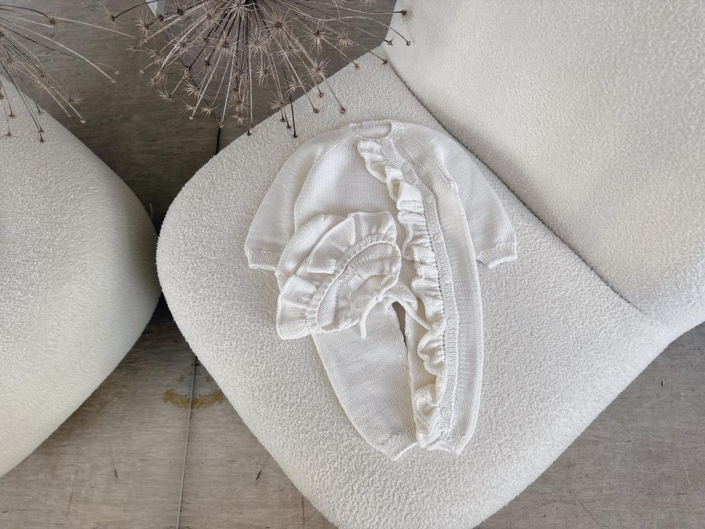 Merino Knit Baby Angel Outfit – Romper, Bonnet & Booties