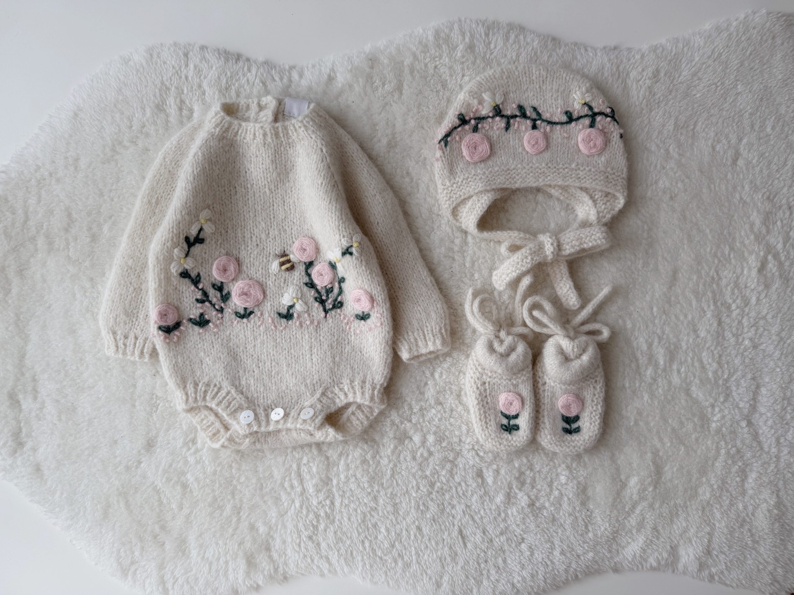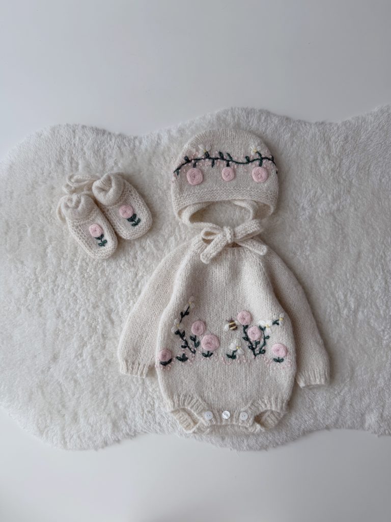 Alpaca Baby Romper and Bonnet Set – Floral Embroidery, Photo Prop