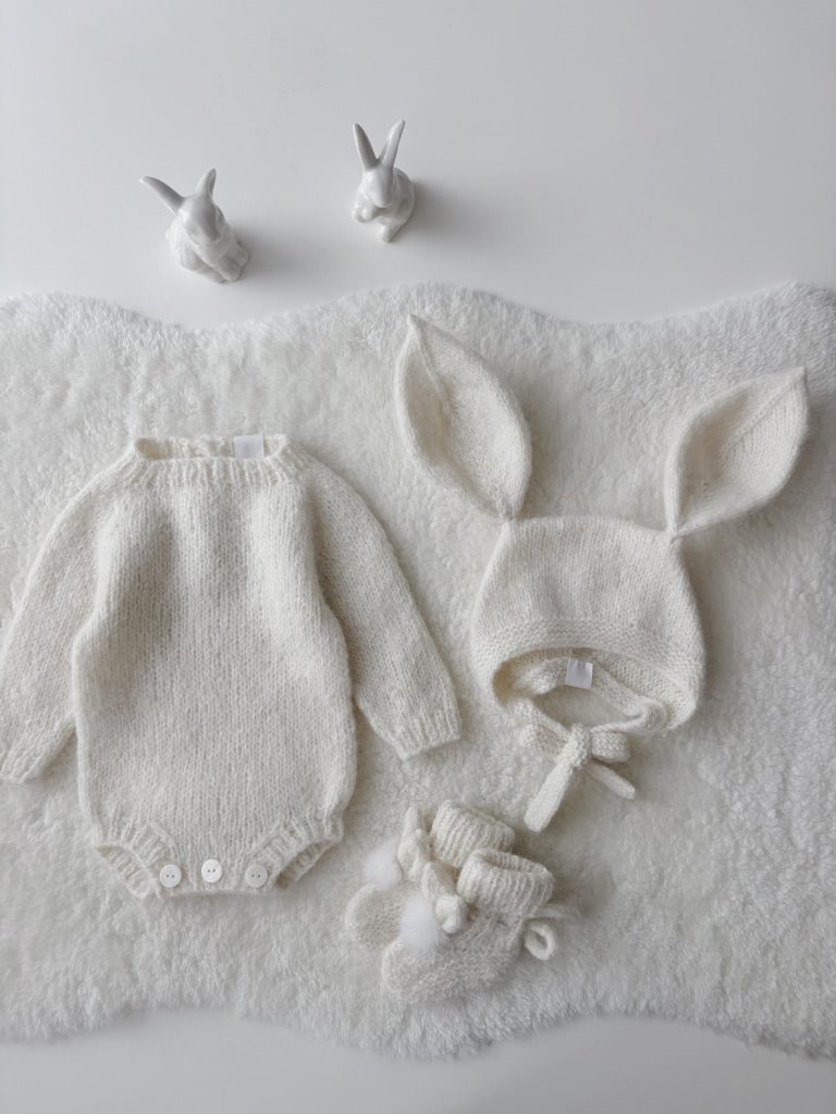 Cream Alpaca Knit Baby Romper and Bunny Bonnet Set