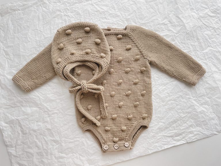 Hand Knitted Merino Baby Romper and Bonnet Set – Brown Photo Prop