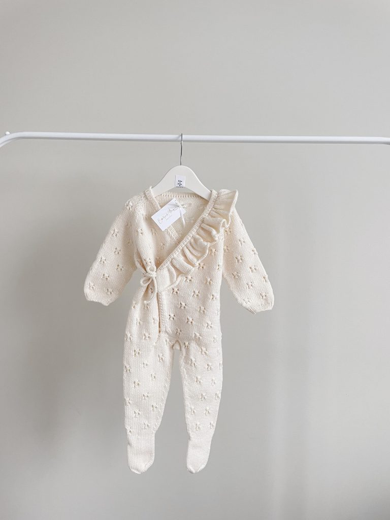 Merino Knit Baby Romper and Bonnet Set – Cream Ruffle Outfit