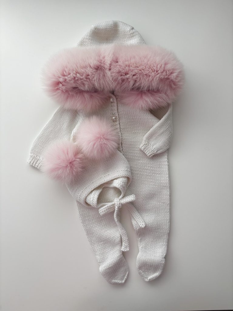 Merino Baby Romper with Fur Trim Hood & Bonnet