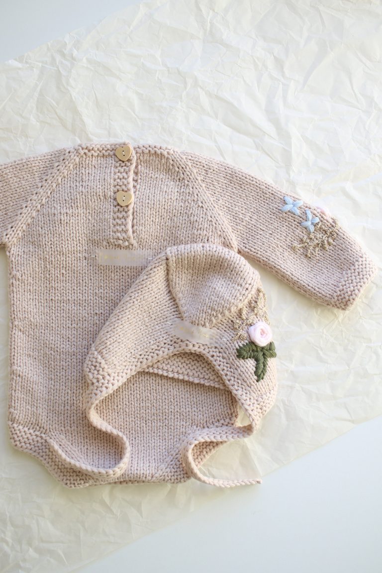 Hand Knitted Merino Baby Romper and Bonnet Set – Floral Photo Prop