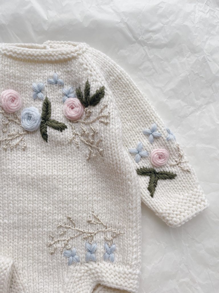 Hand Knitted Merino Baby Romper and Bonnet Set – Floral Embroidery, 3-6 Months