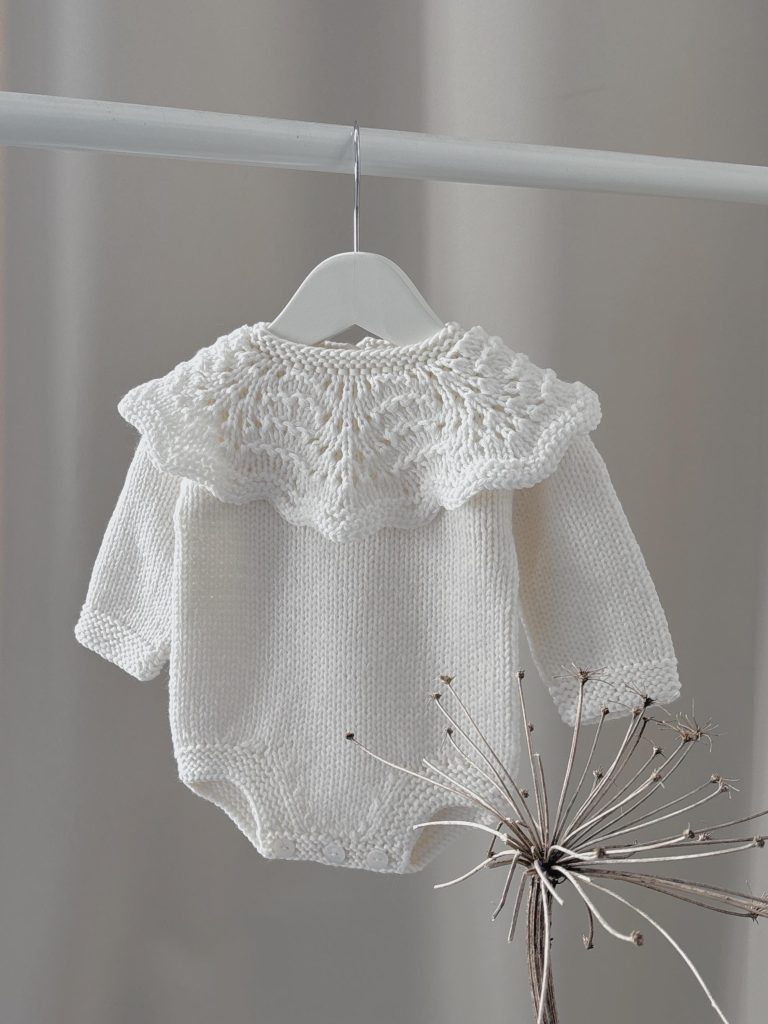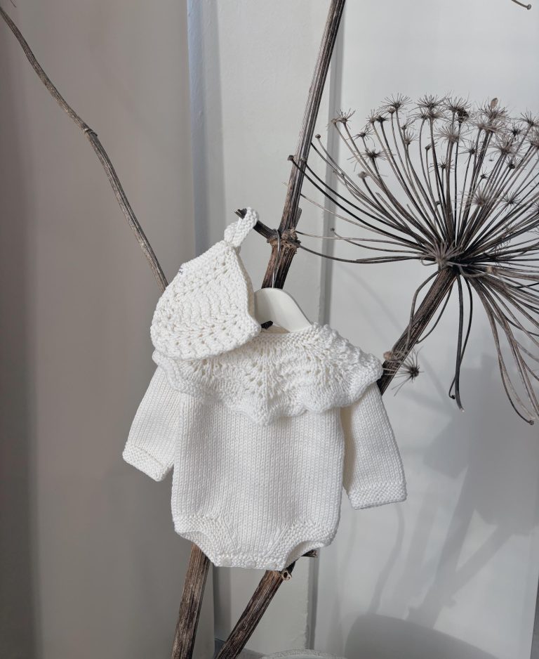 Hand Knitted Merino Baby Romper and Bonnet Set – White Photo Prop