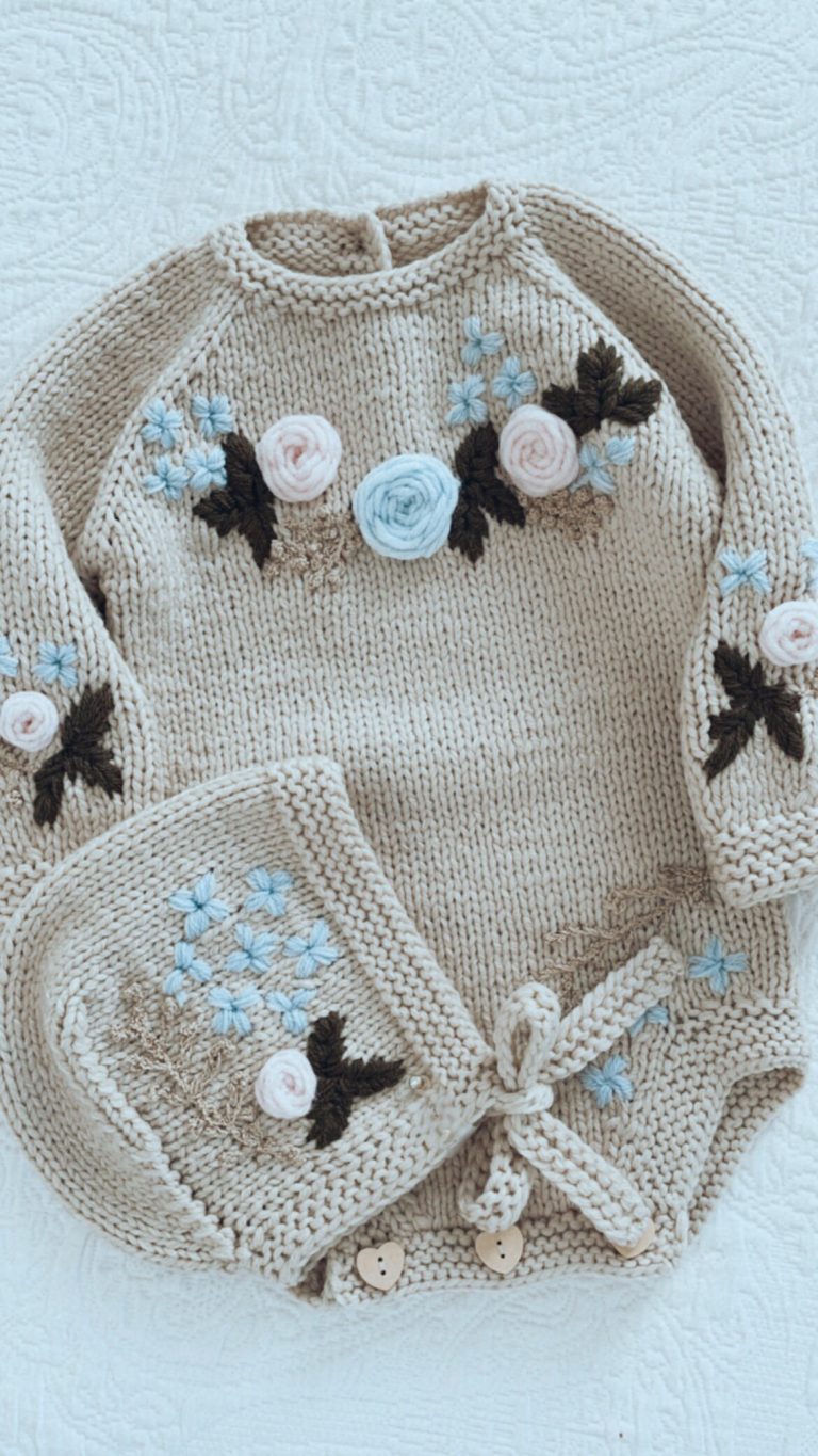 Hand-Knitted Merino Wool Baby Romper and Bonnet Set