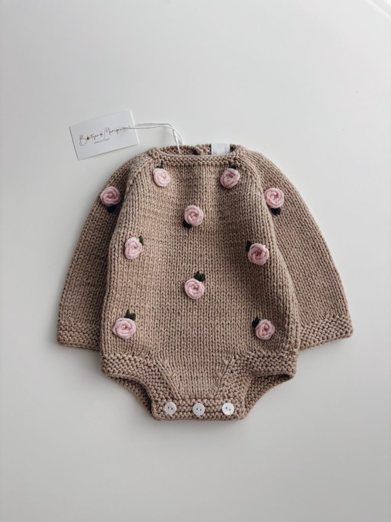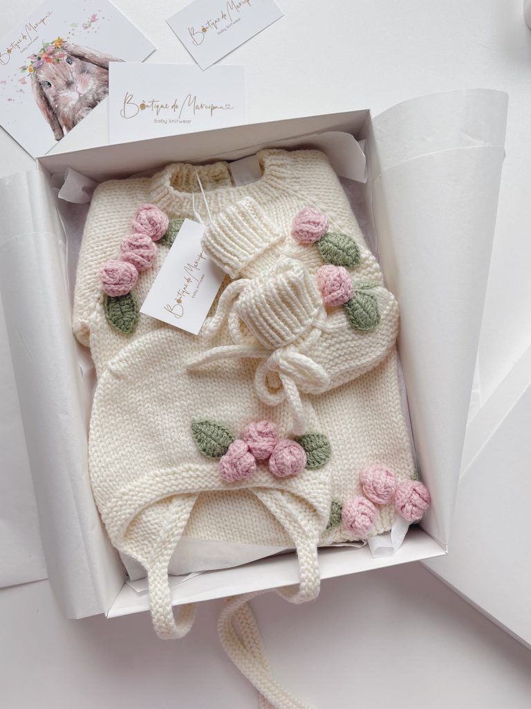 Baby girl romper bonnet and booties with roses – Set of 3 – Photo pros