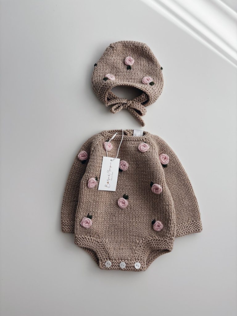 Baby girl romper and bonnet with roses embroidery – Set of 2 – Photography props