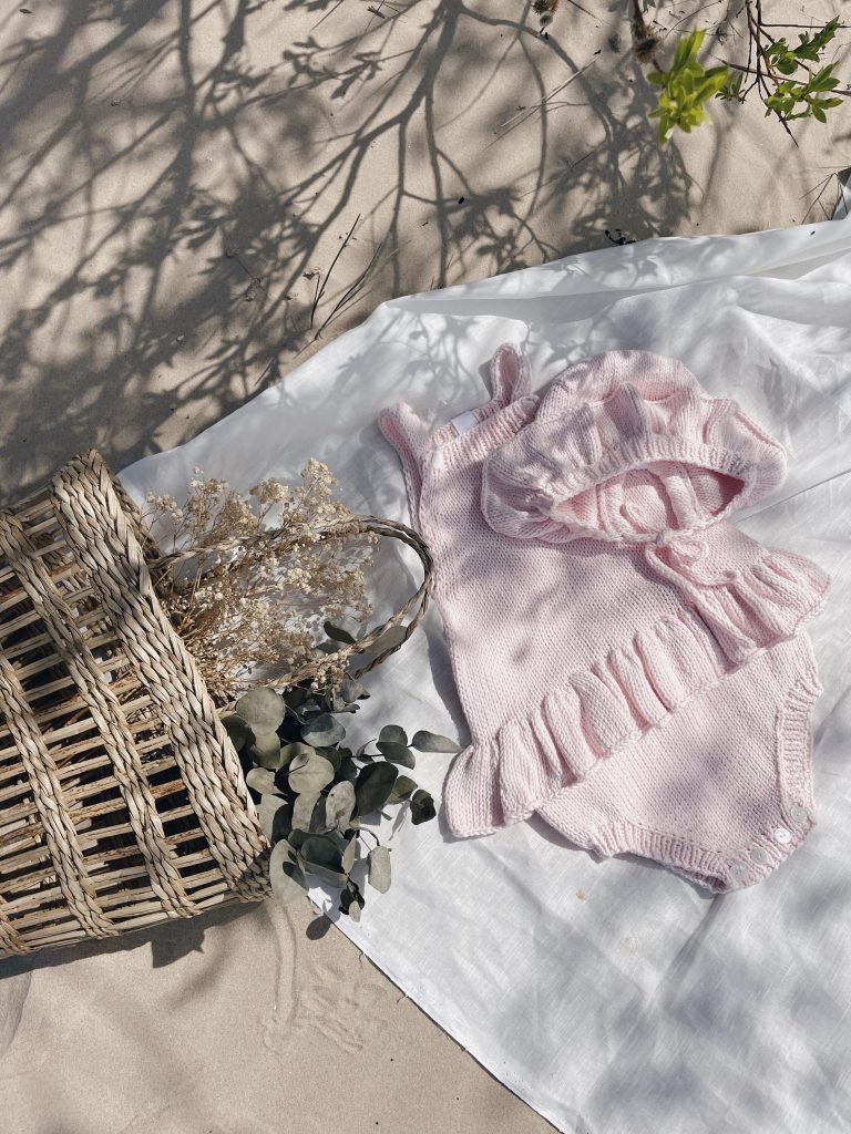 Cotton Baby Romper Set – Pale Pink Ruffle Outfit with Bonnet