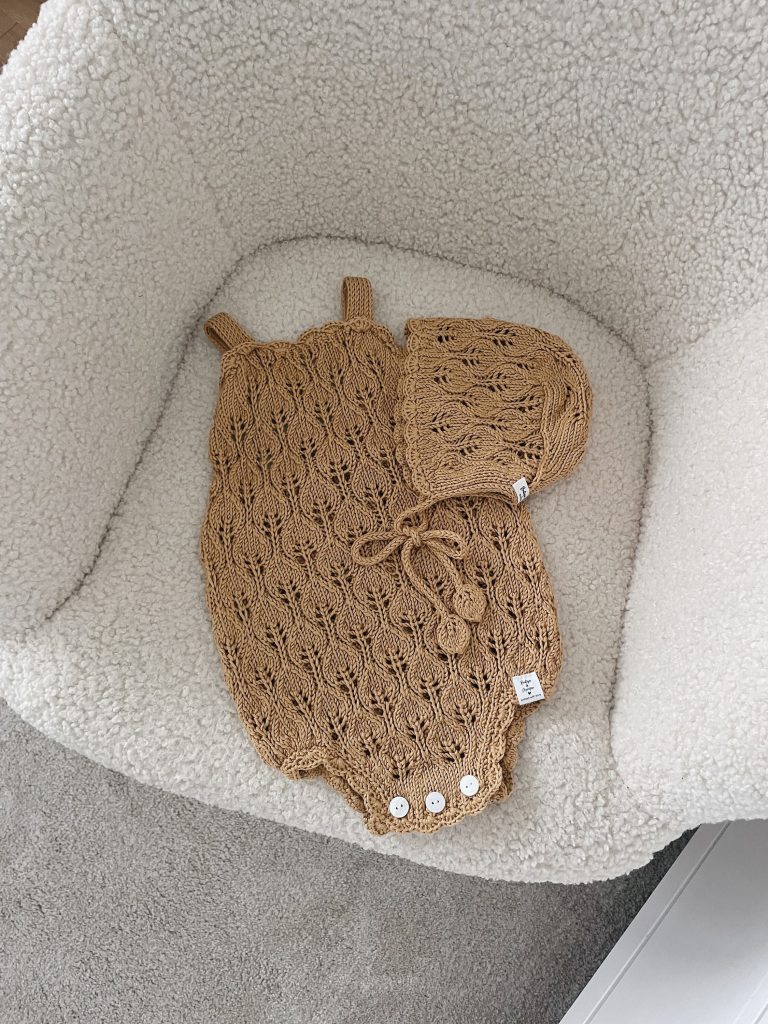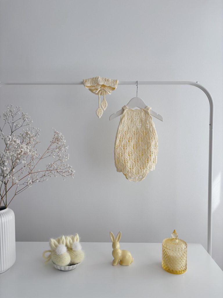 Cotton Baby Romper Set – Popcorn Knit Outfit with Bonnet & Booties