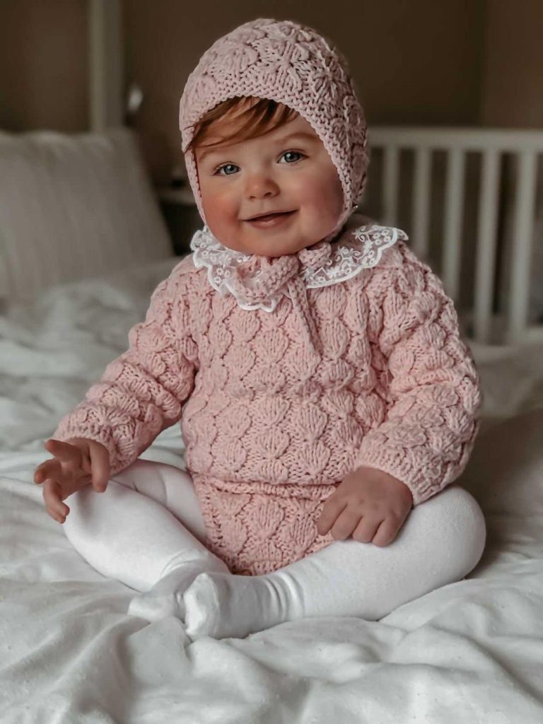 Hand Knit Baby Romper and Bonnet Set – Pale Pink Merino Wool
