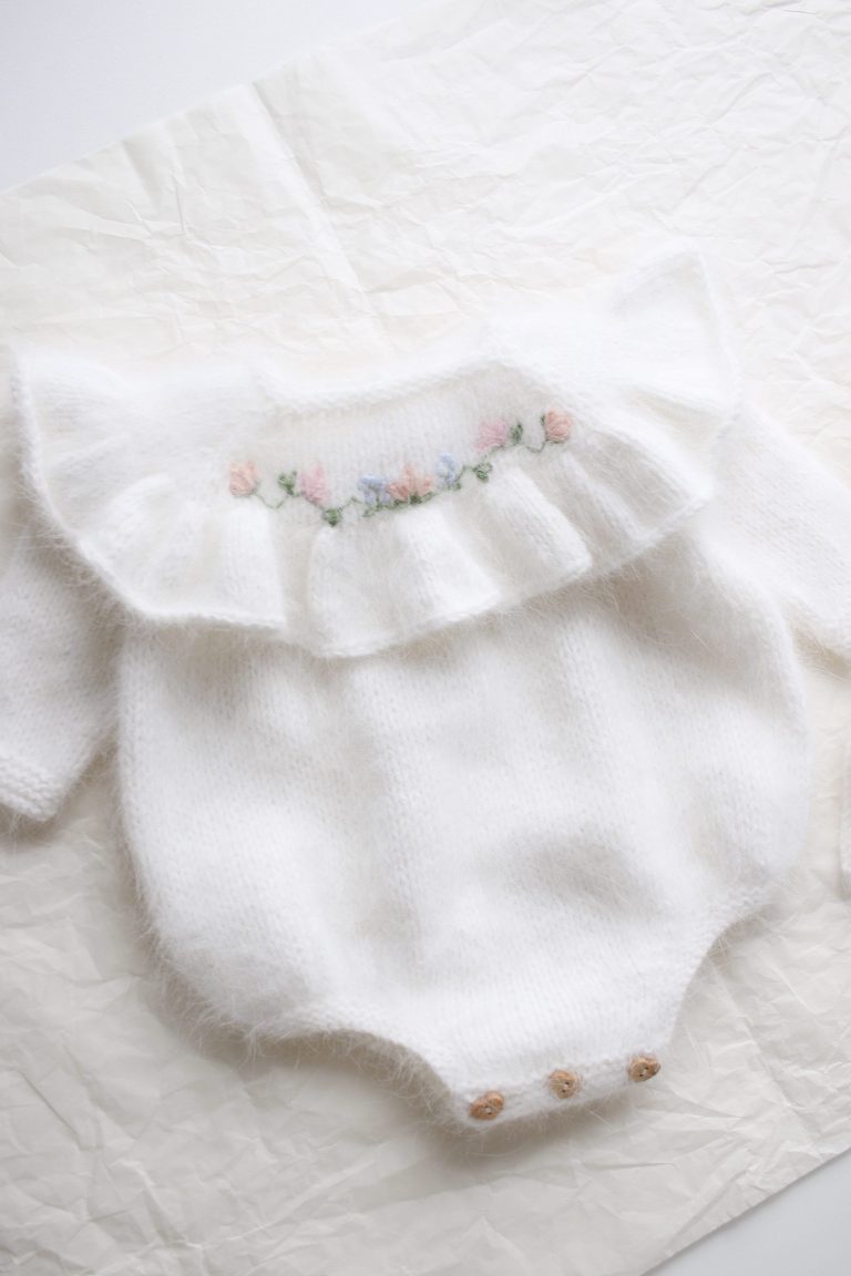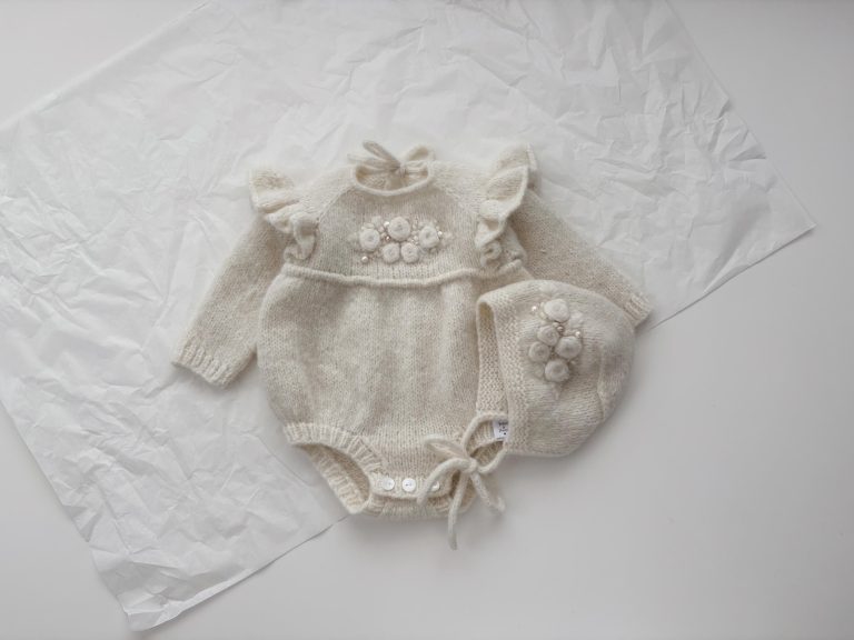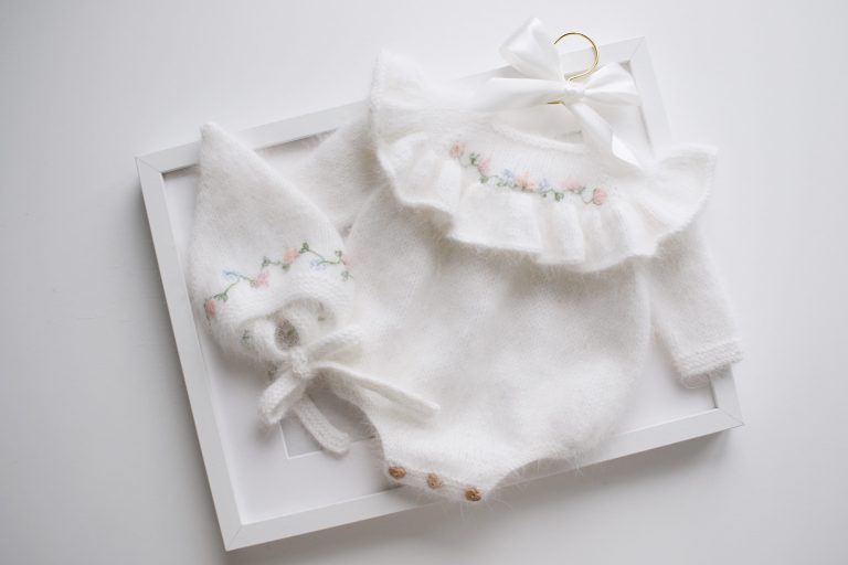 Embroidered Merino Baby Romper and Bonnet Set – Knitted Photo Prop
