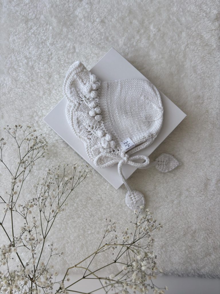 Hand Knit Merino Baby Bonnet – White Leaf Design