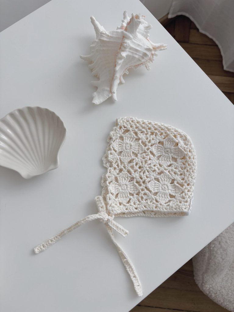 Hand Crochet Baby Bonnet – Cream Flower, Merino Wool