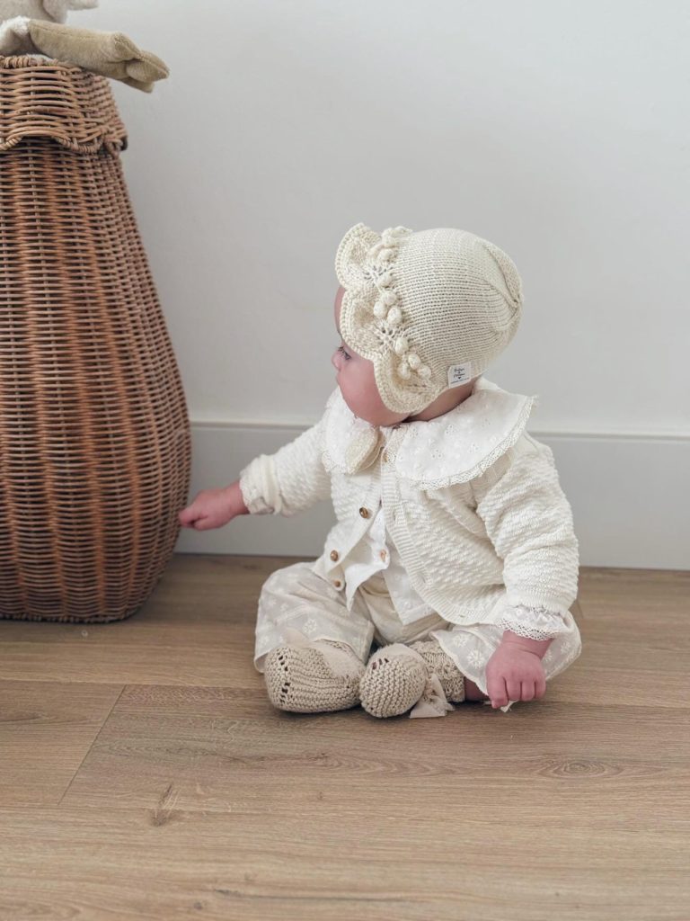 Hand Knitted Baby Girl Bonnet – Cream Merino Wool, Newborn Prop
