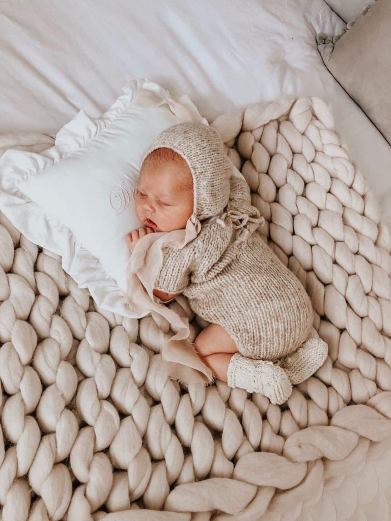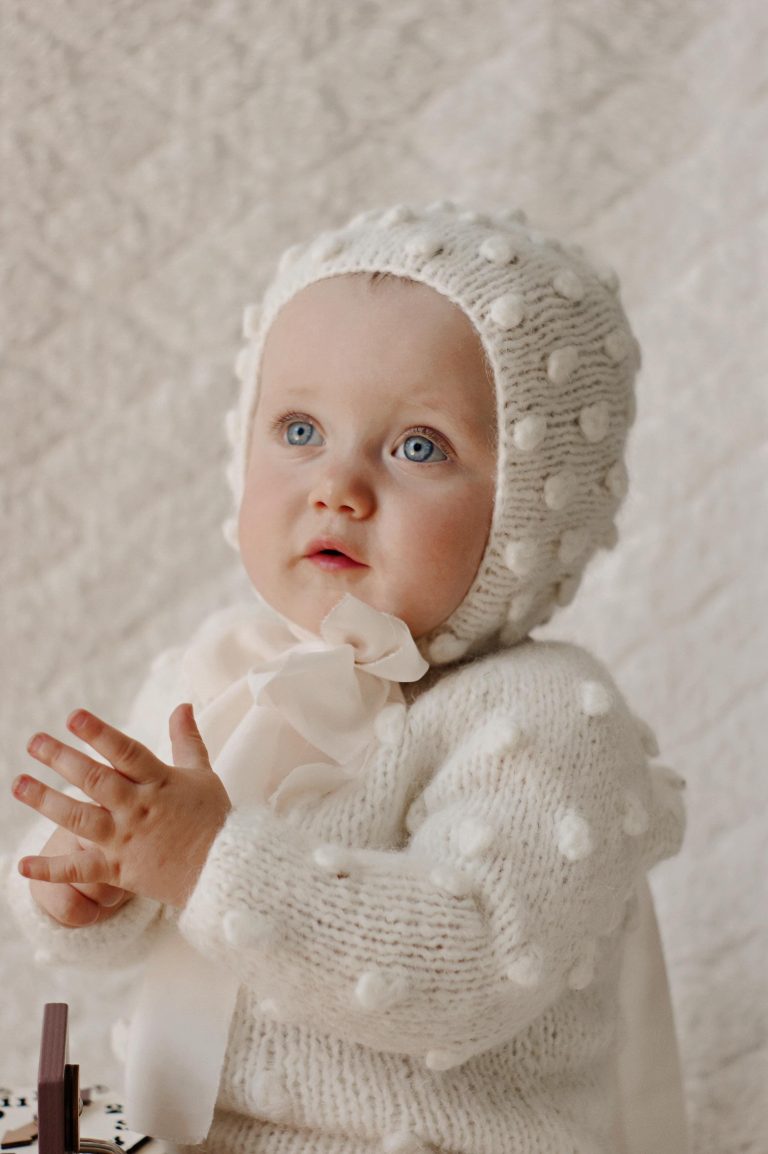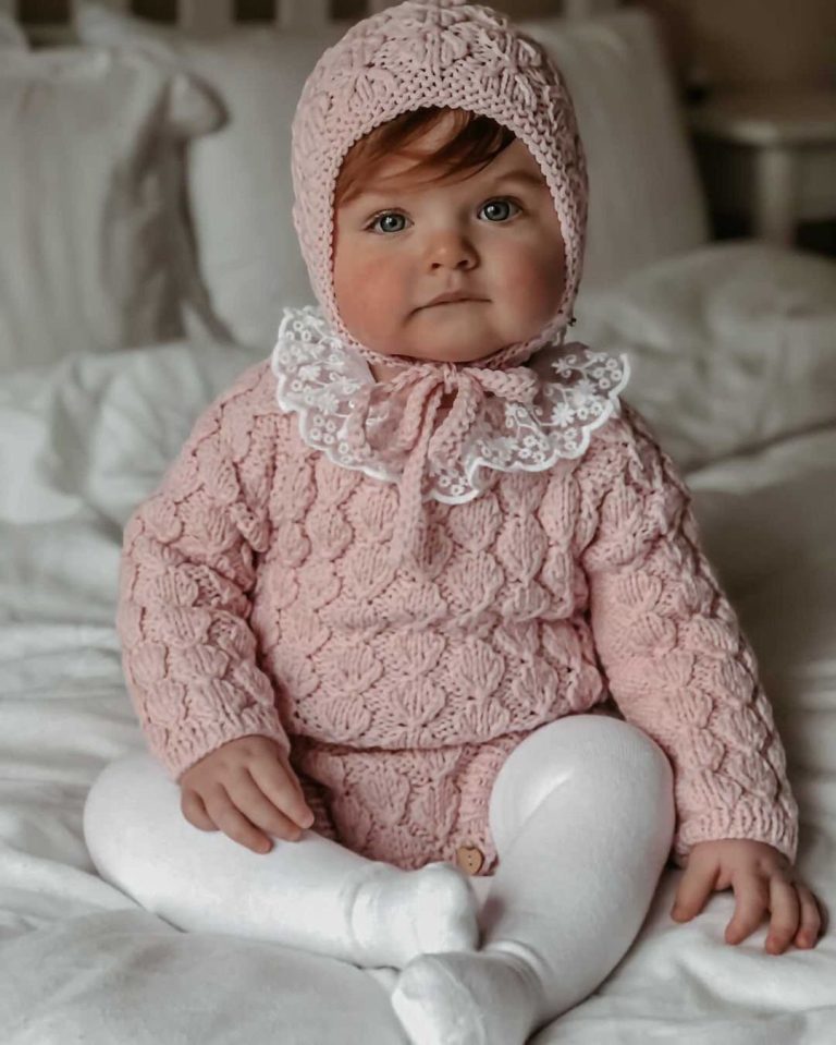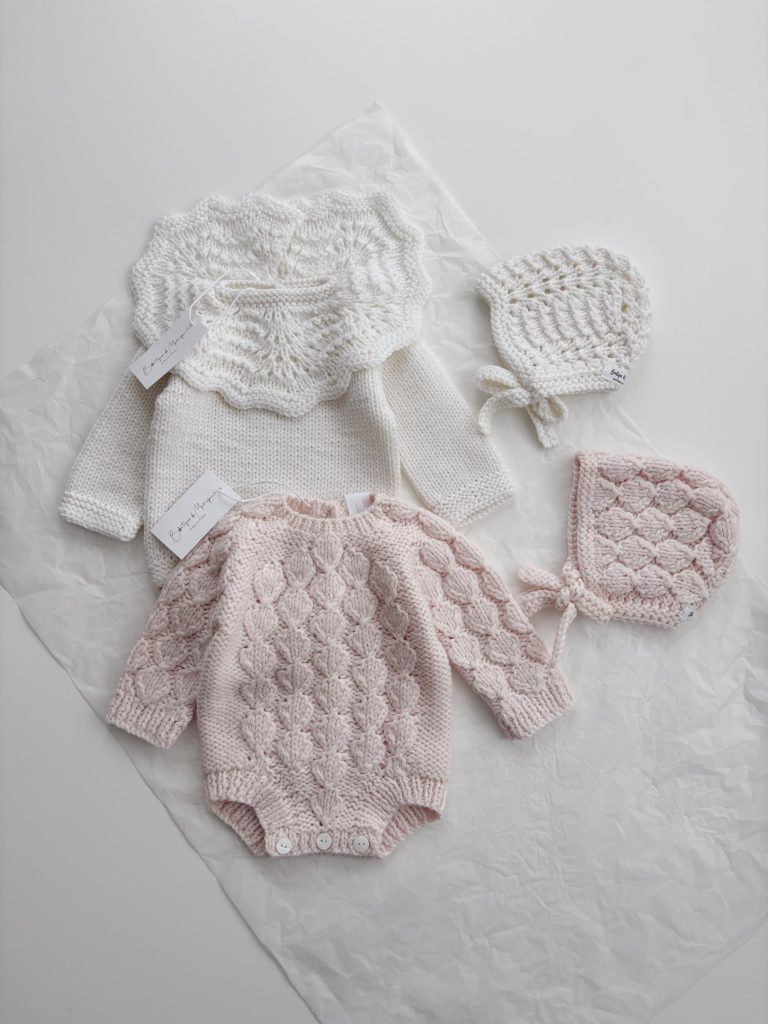 Hand Knitted Merino Baby Romper and Bonnet Set – Floral Embroidery, 3-6 Months