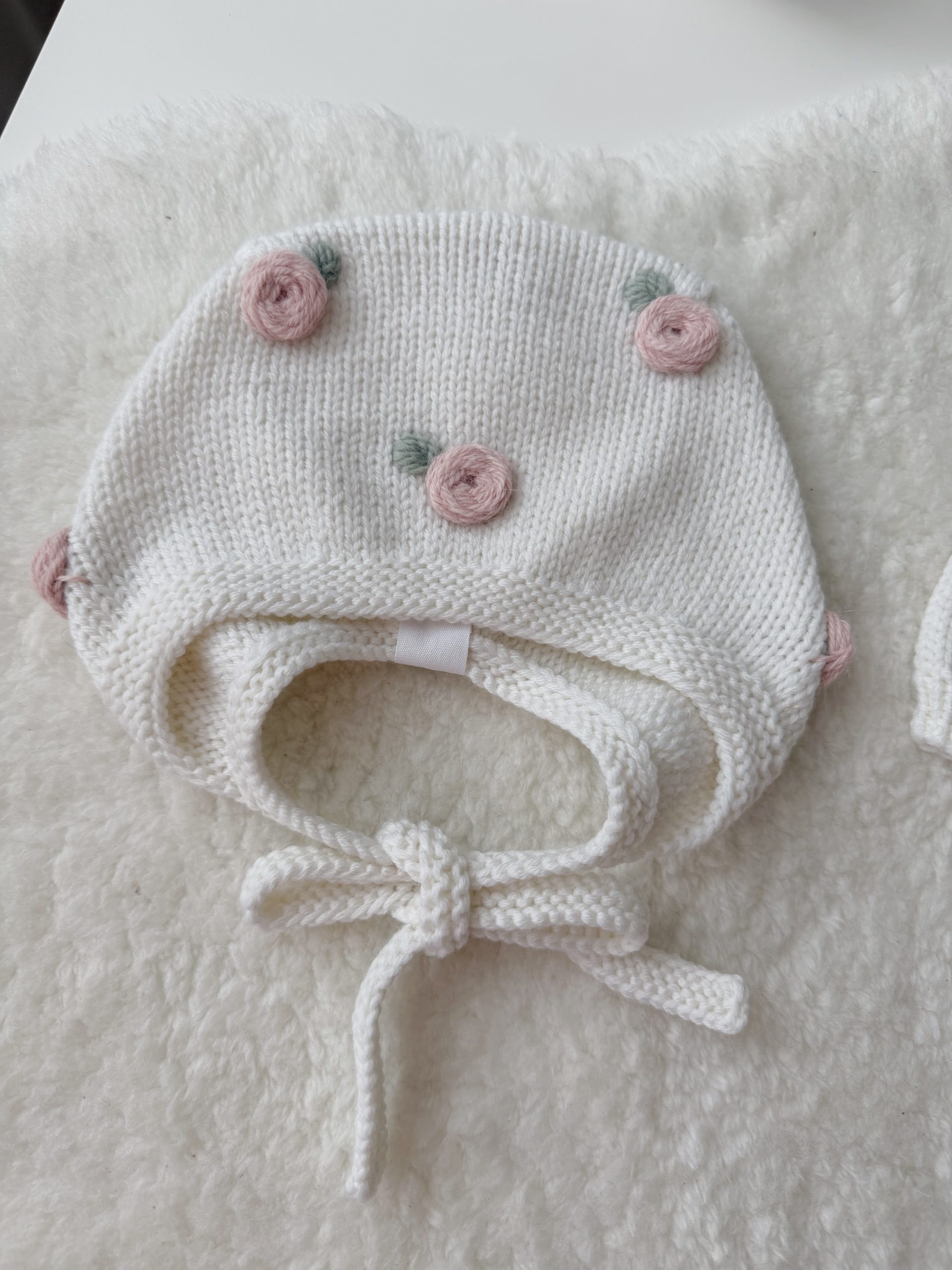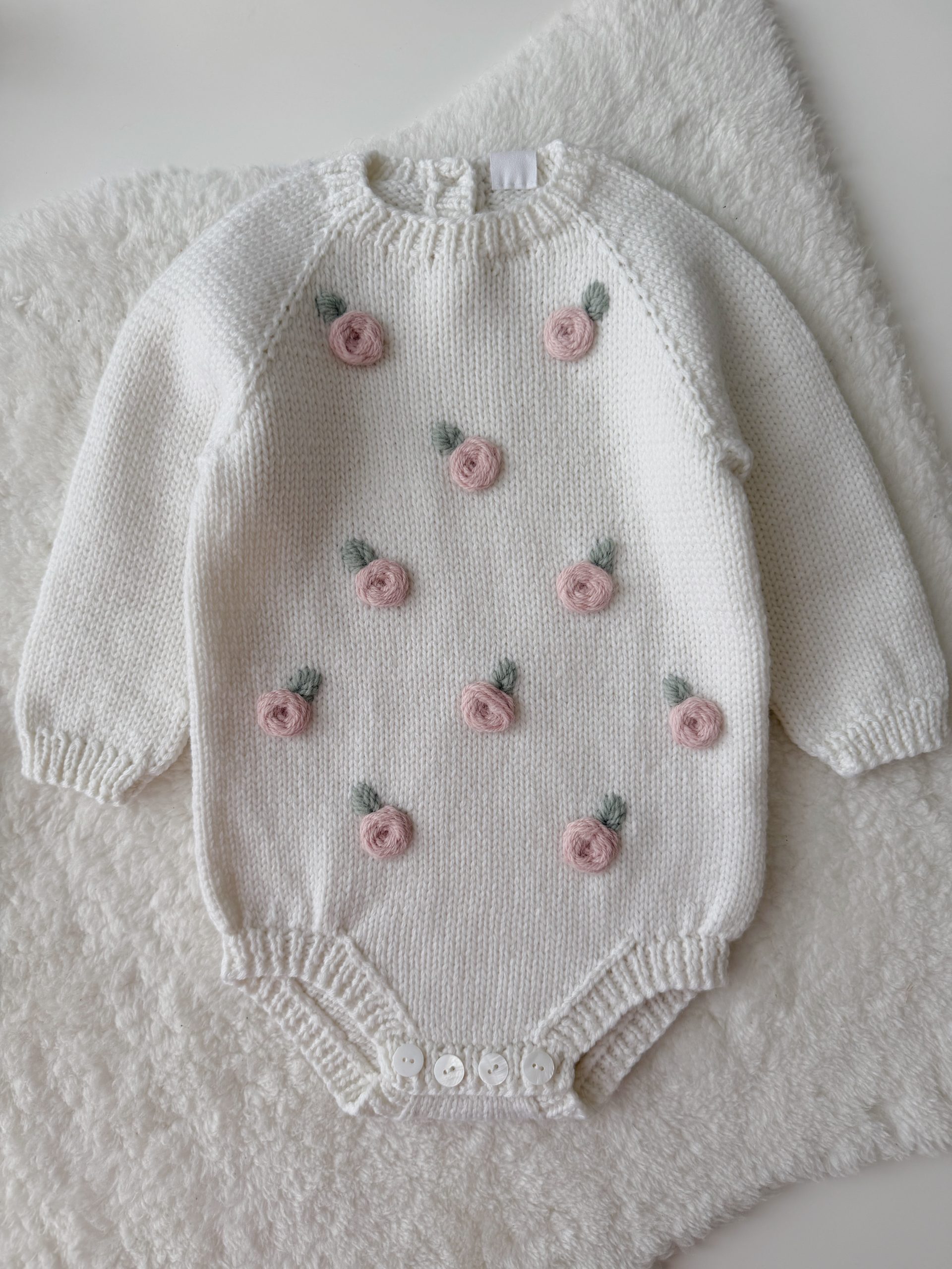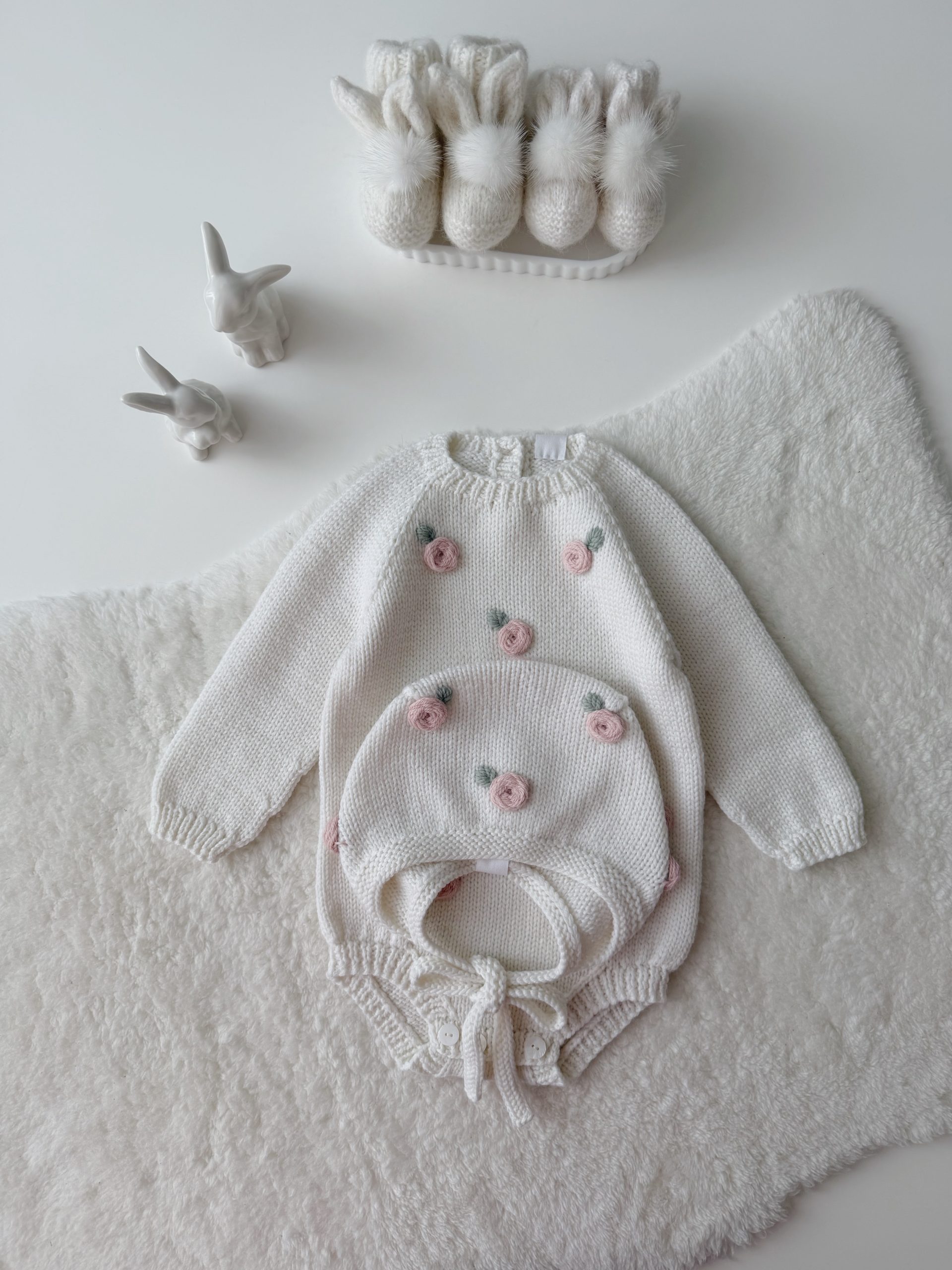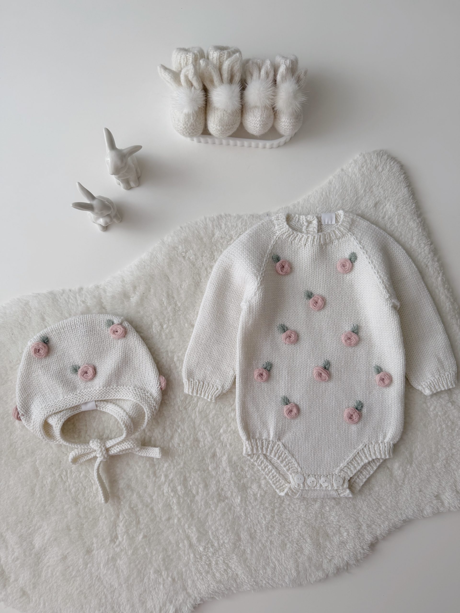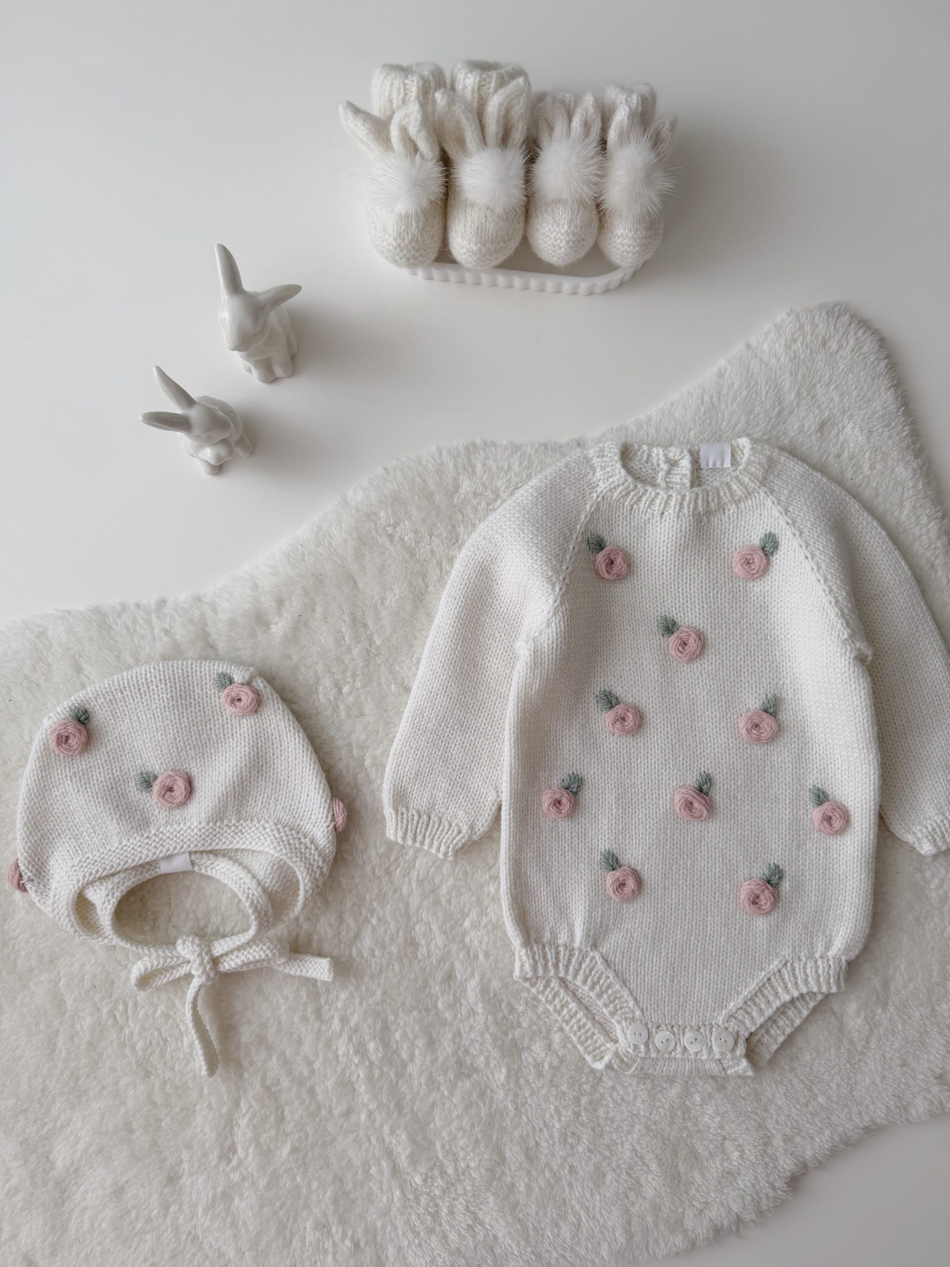 Hand Knit Merino Baby Romper and Bonnet Set – Embroidery
