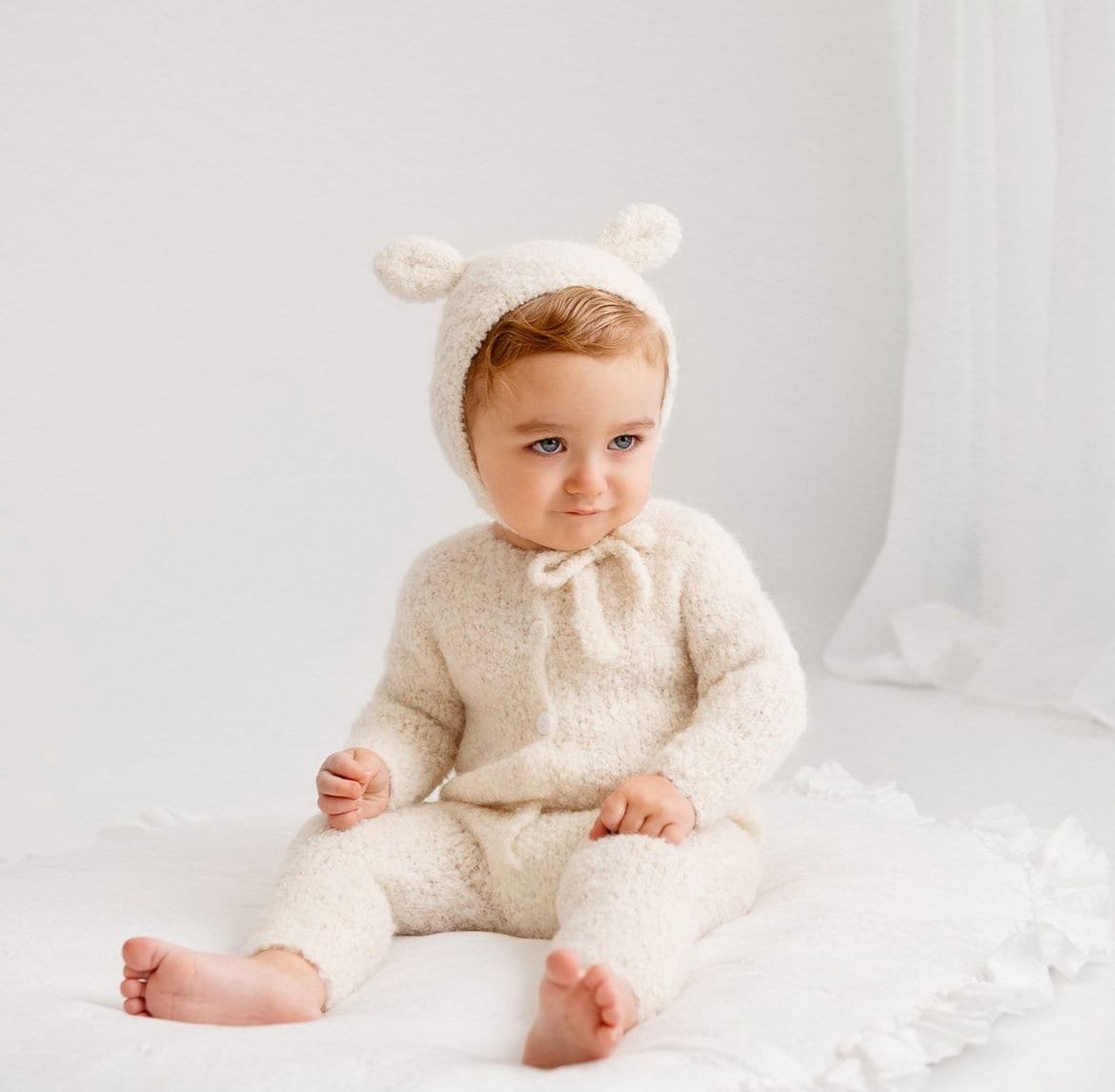 Knit Baby Romper Set – Alpaca Bonnet and Socks, Cream Photo Prop