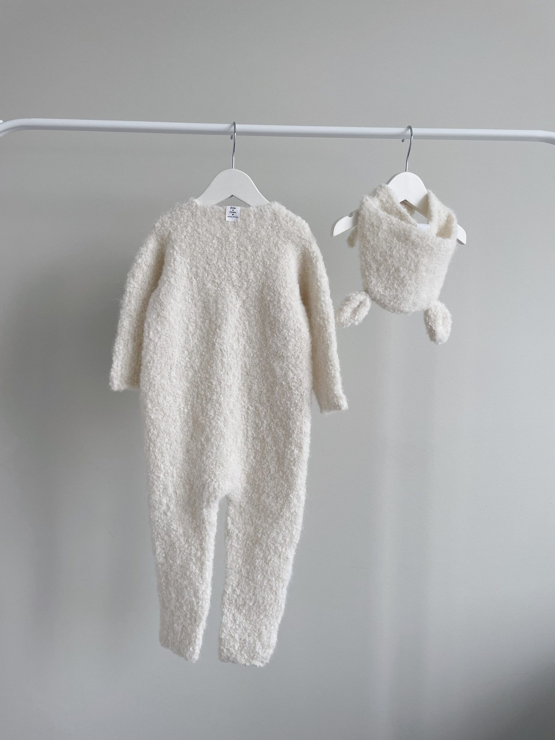 Embroidered Angora Baby Romper & Bonnet Set – Milky White Outfit