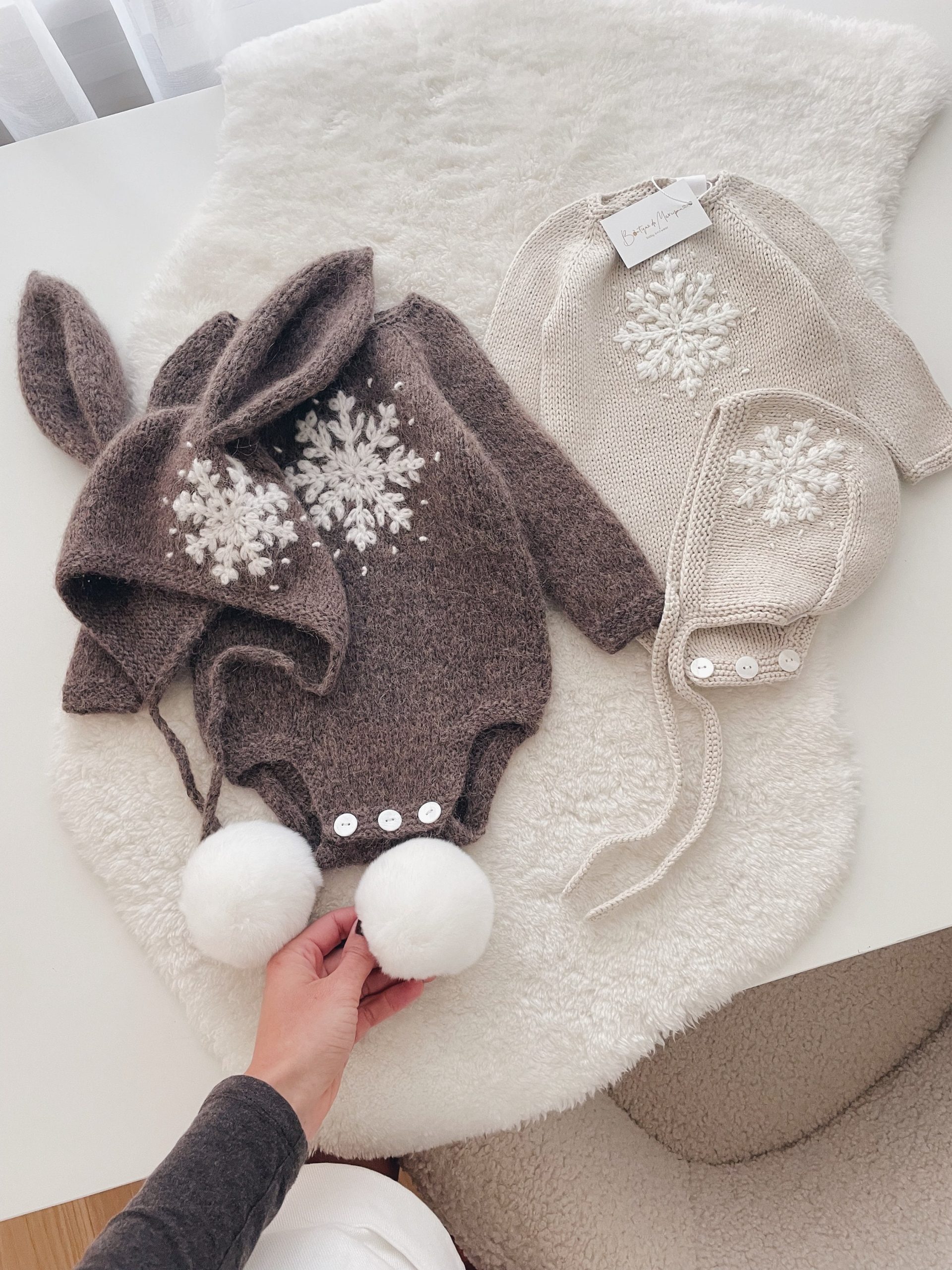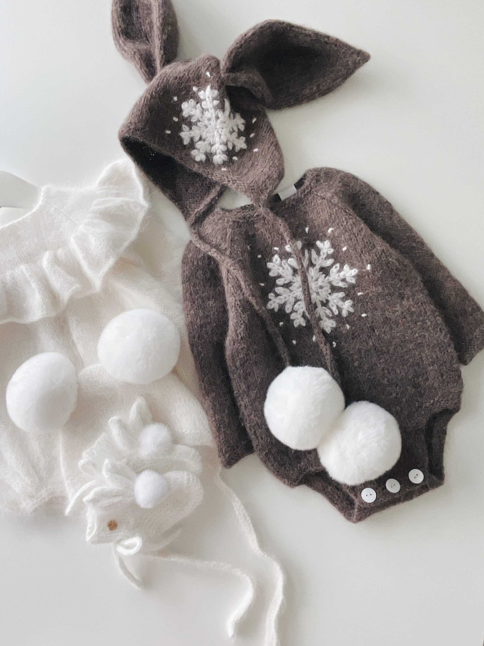 Long sleeve romper, bonnet and socks with snowflake embroidery – Set of 3 – Photo prop