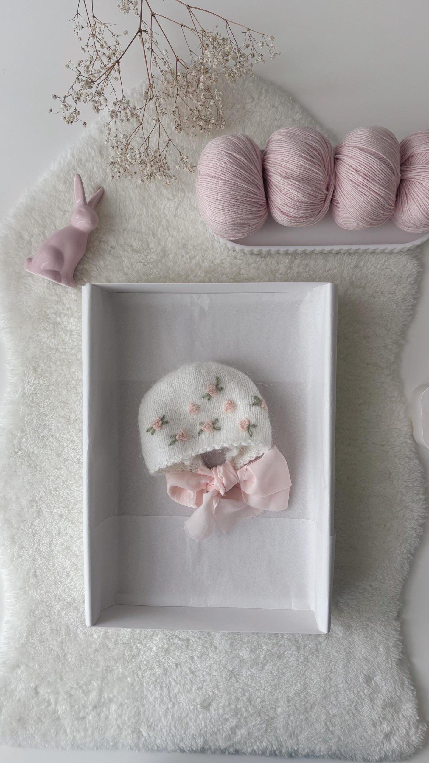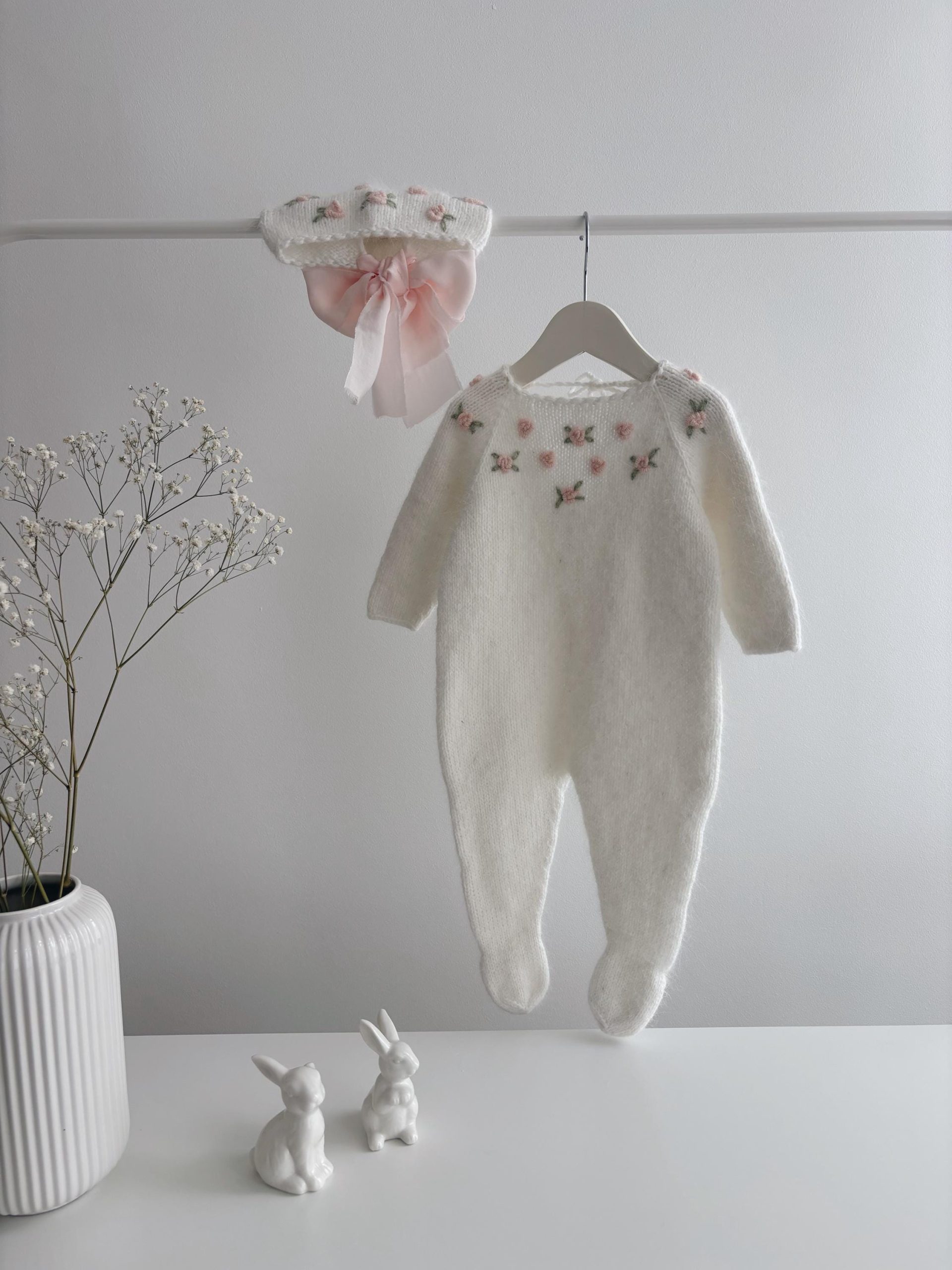 Embroidered Angora Baby Romper & Bonnet Set – Milky White Outfit