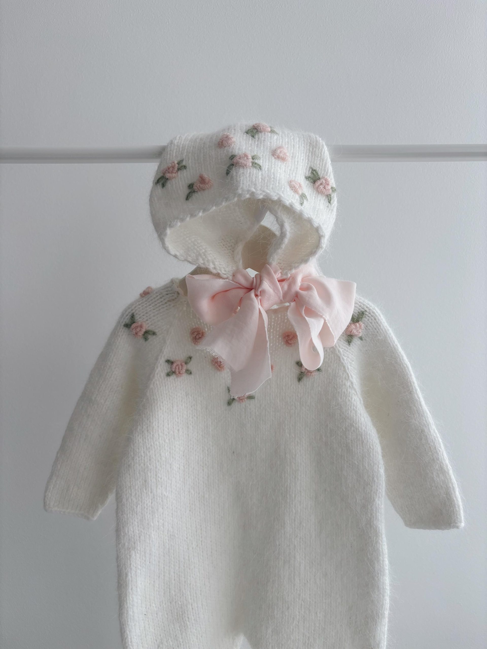 Merino Knit Baby Angel Outfit – Romper, Bonnet & Booties
