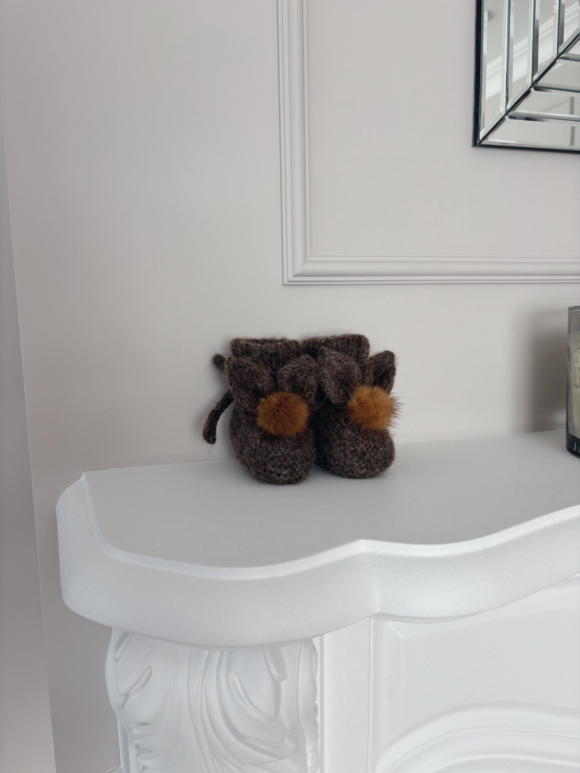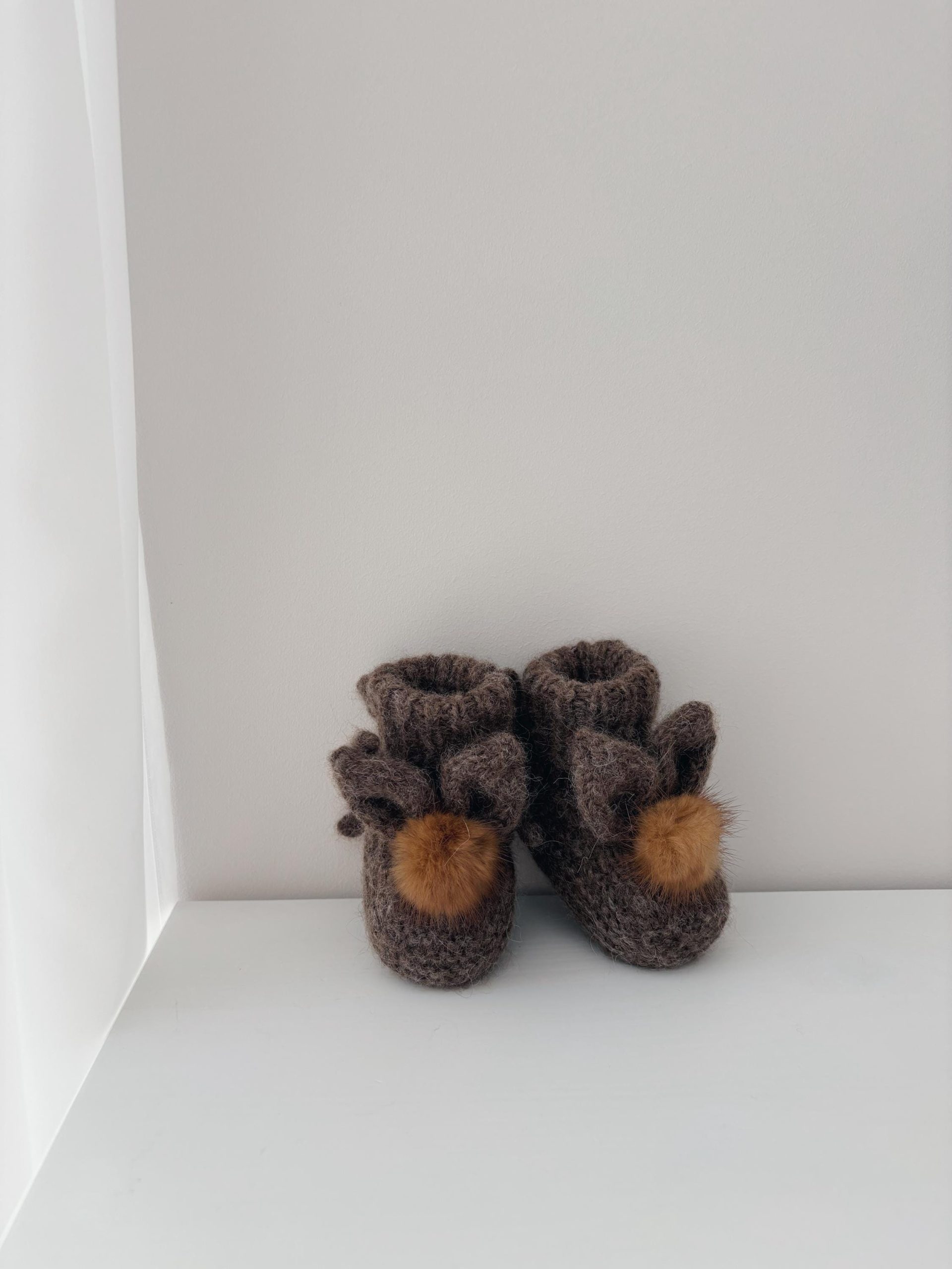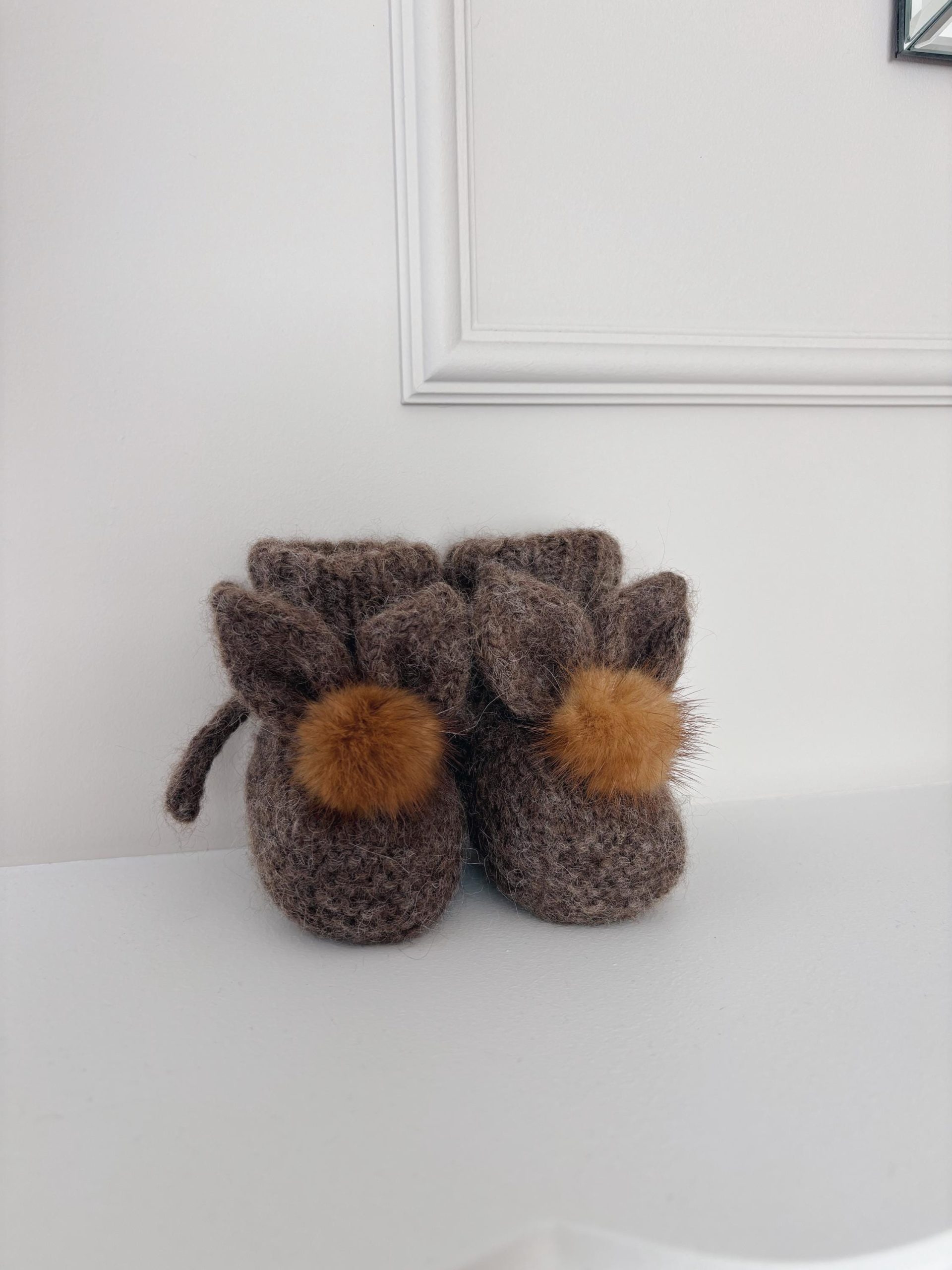 Angora Bunny Booties (0-3 Months) – Baby Alpaca Knit, Genuine Fur Pom Poms