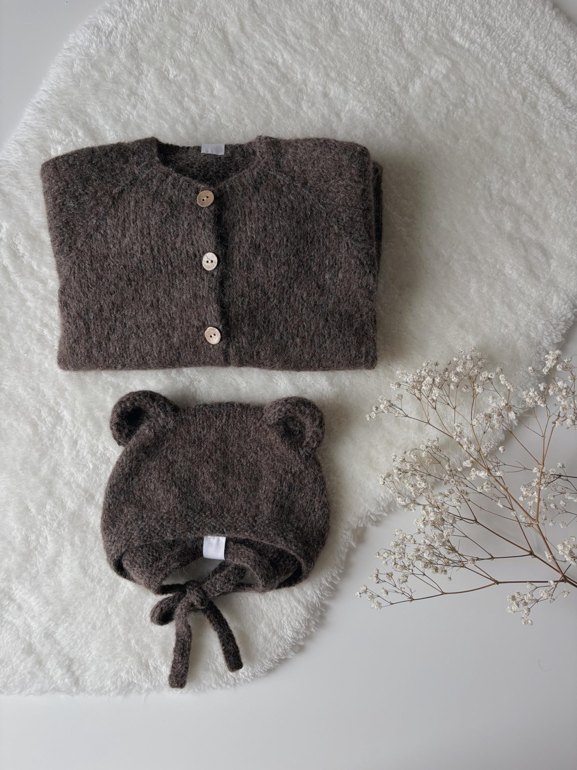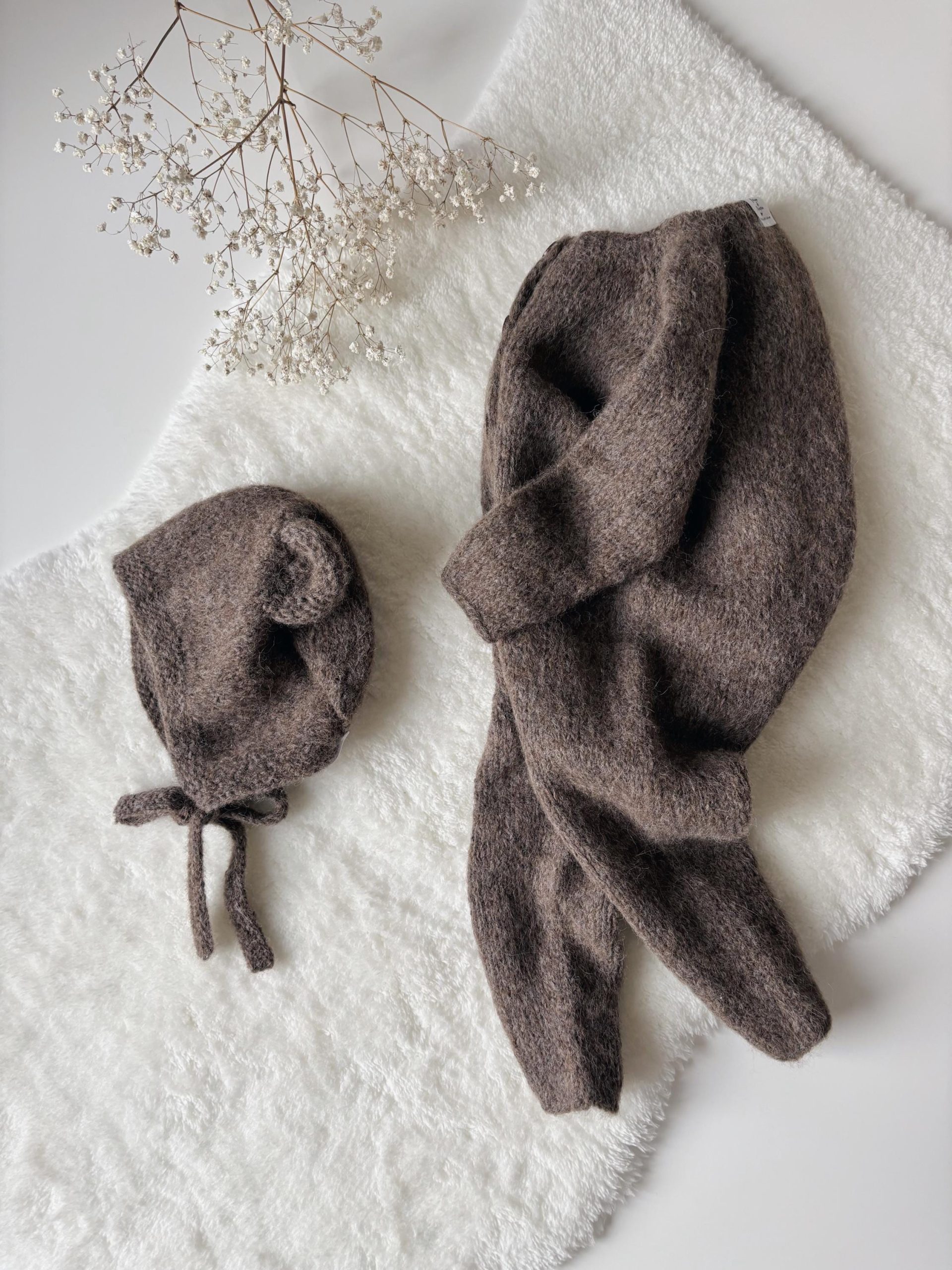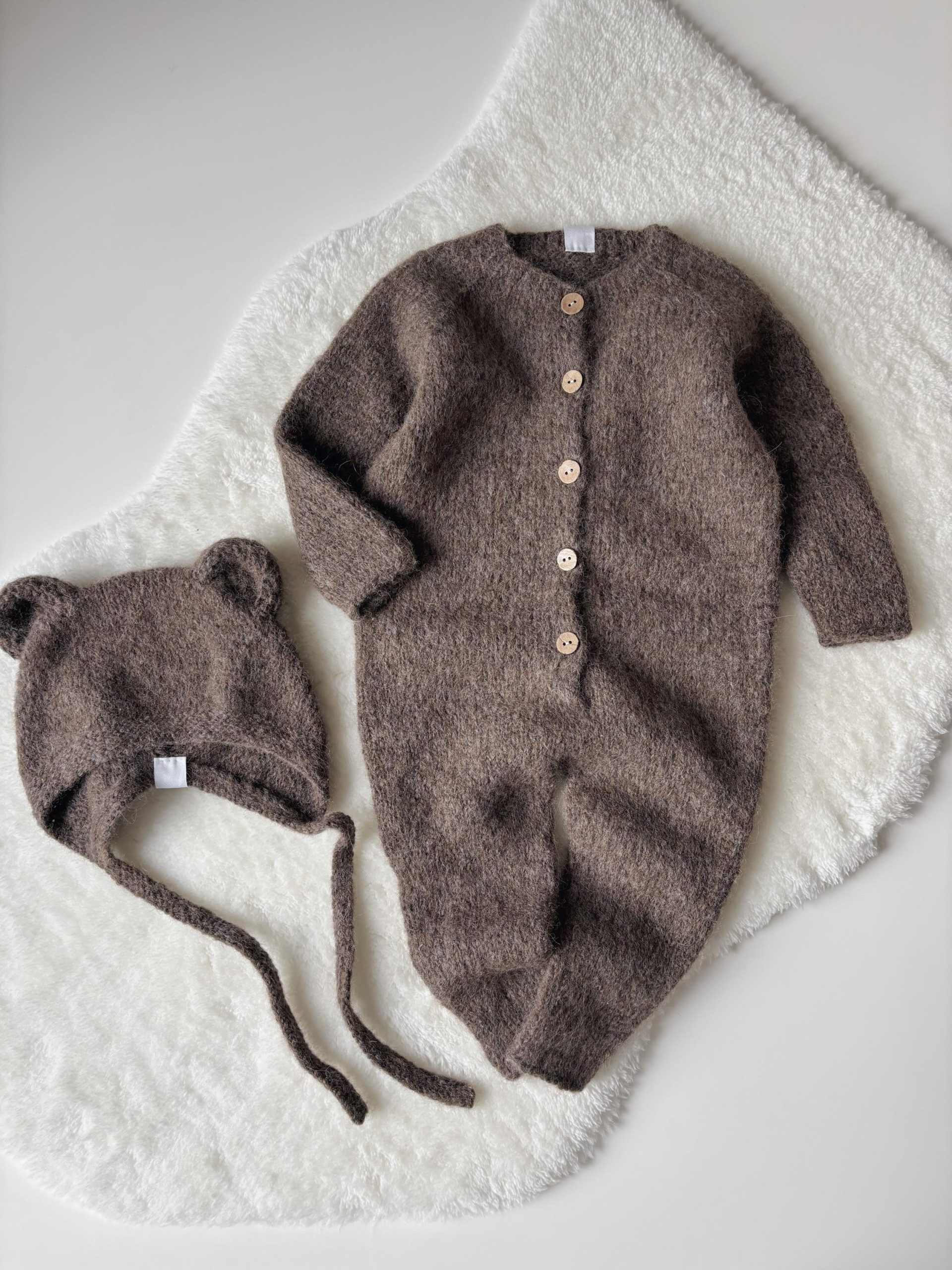 Baby Alpaca Knit Bear Bonnet & Romper Set – Brown