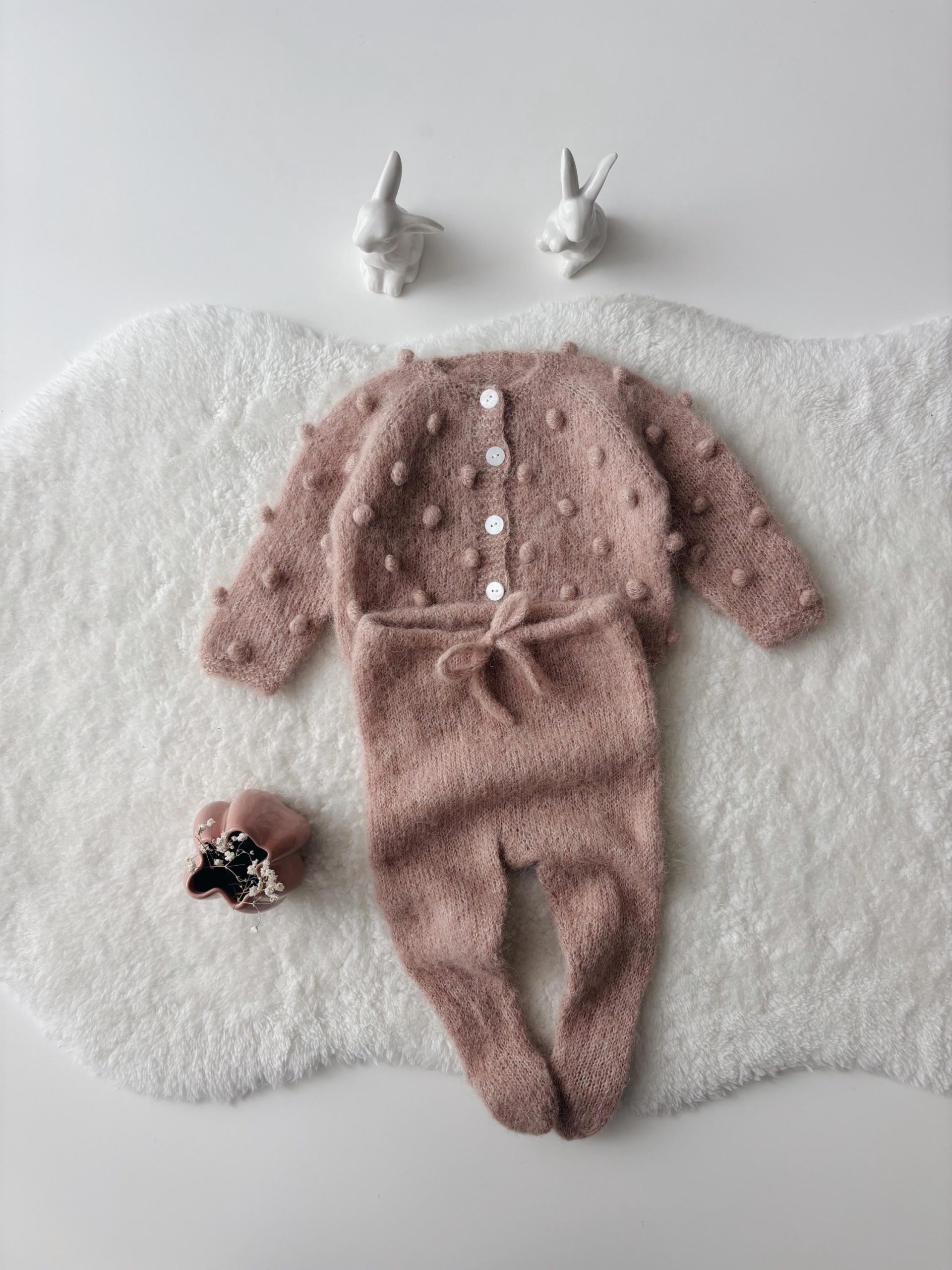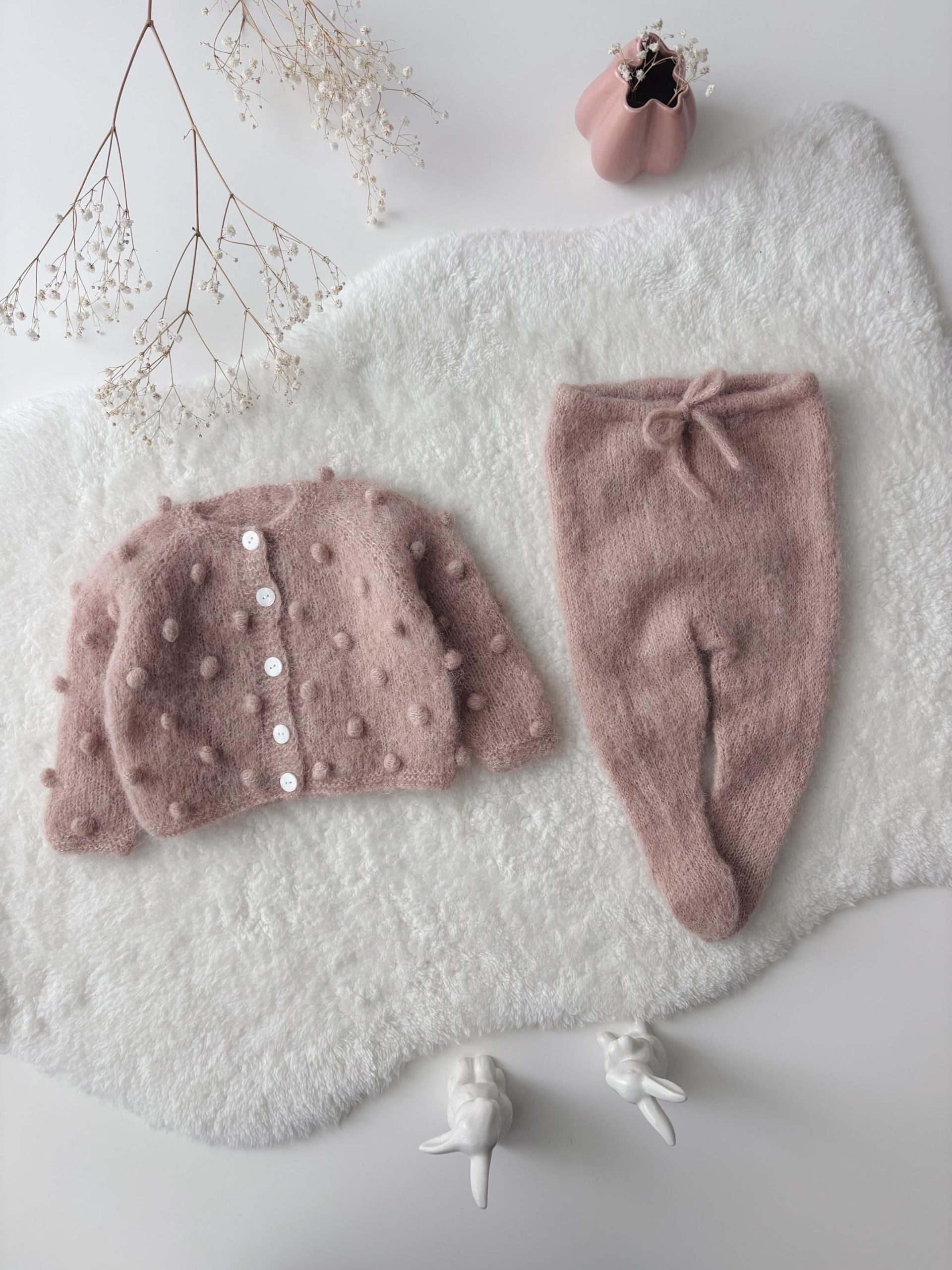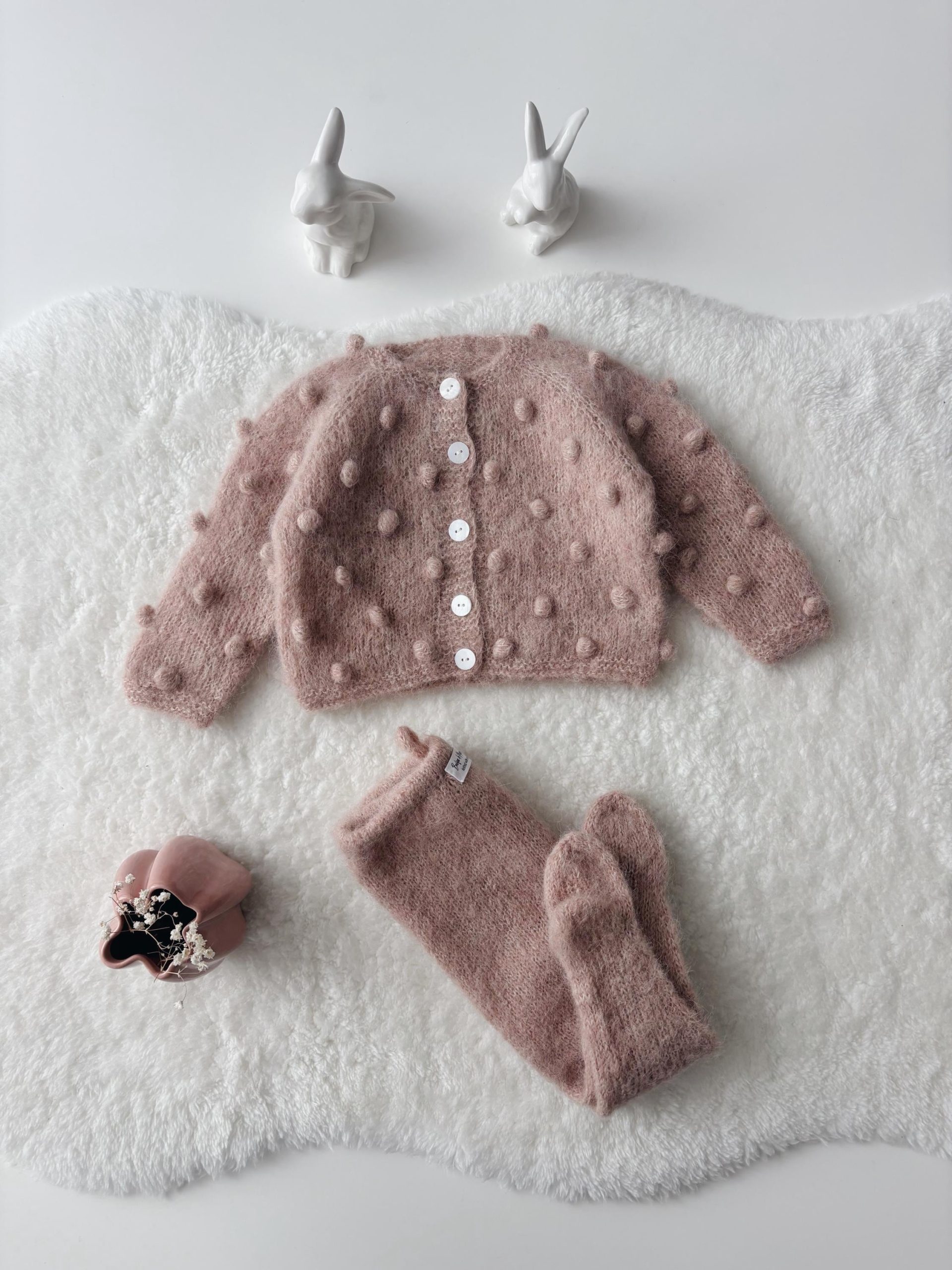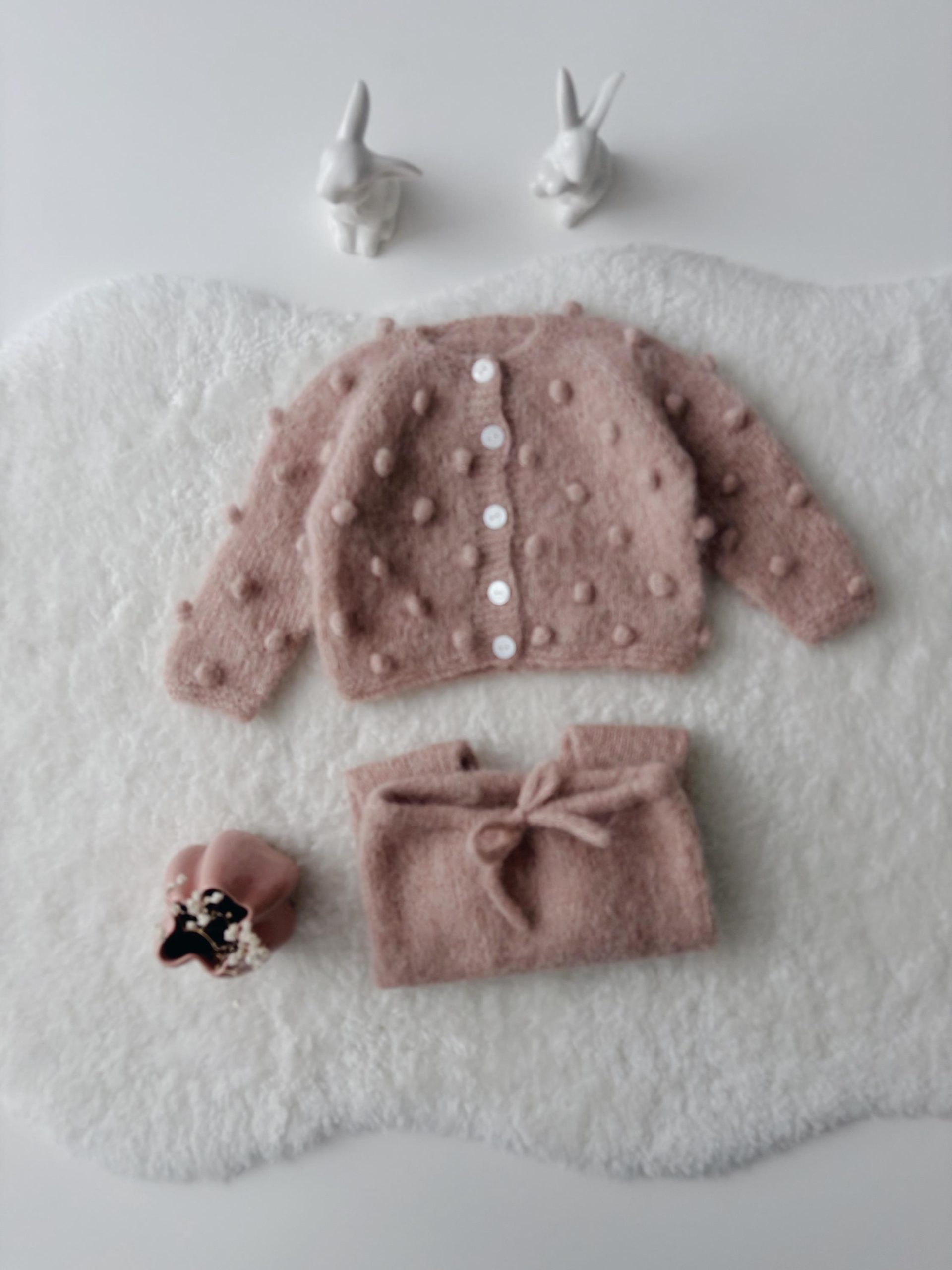 I have knitted this popcorn cardigan and panties from wonderfully dusty pink color alpaca silk yarn. This listing is for cute popcorn cardigan with white shell buttons. This is a must have for your prop collection.