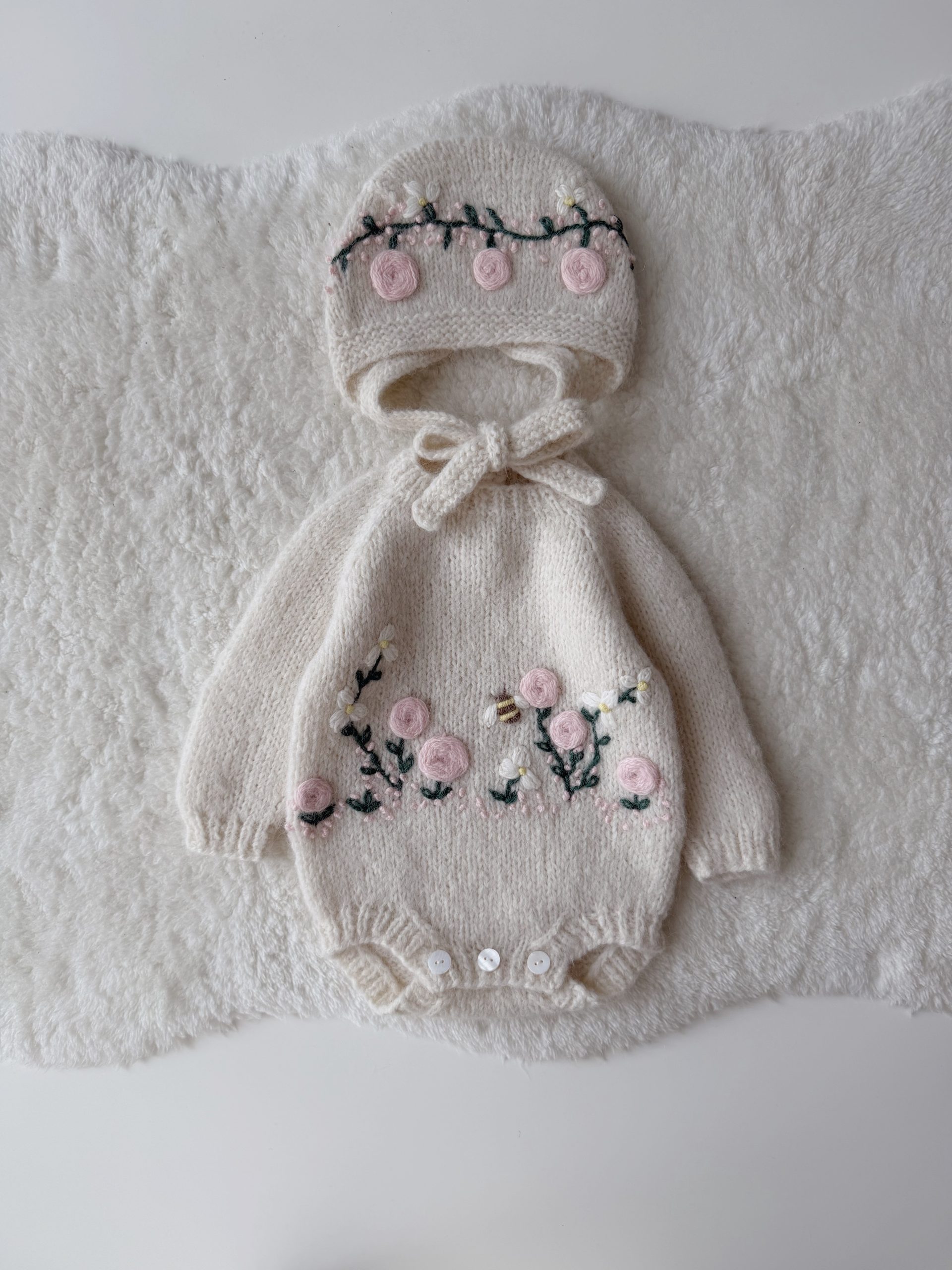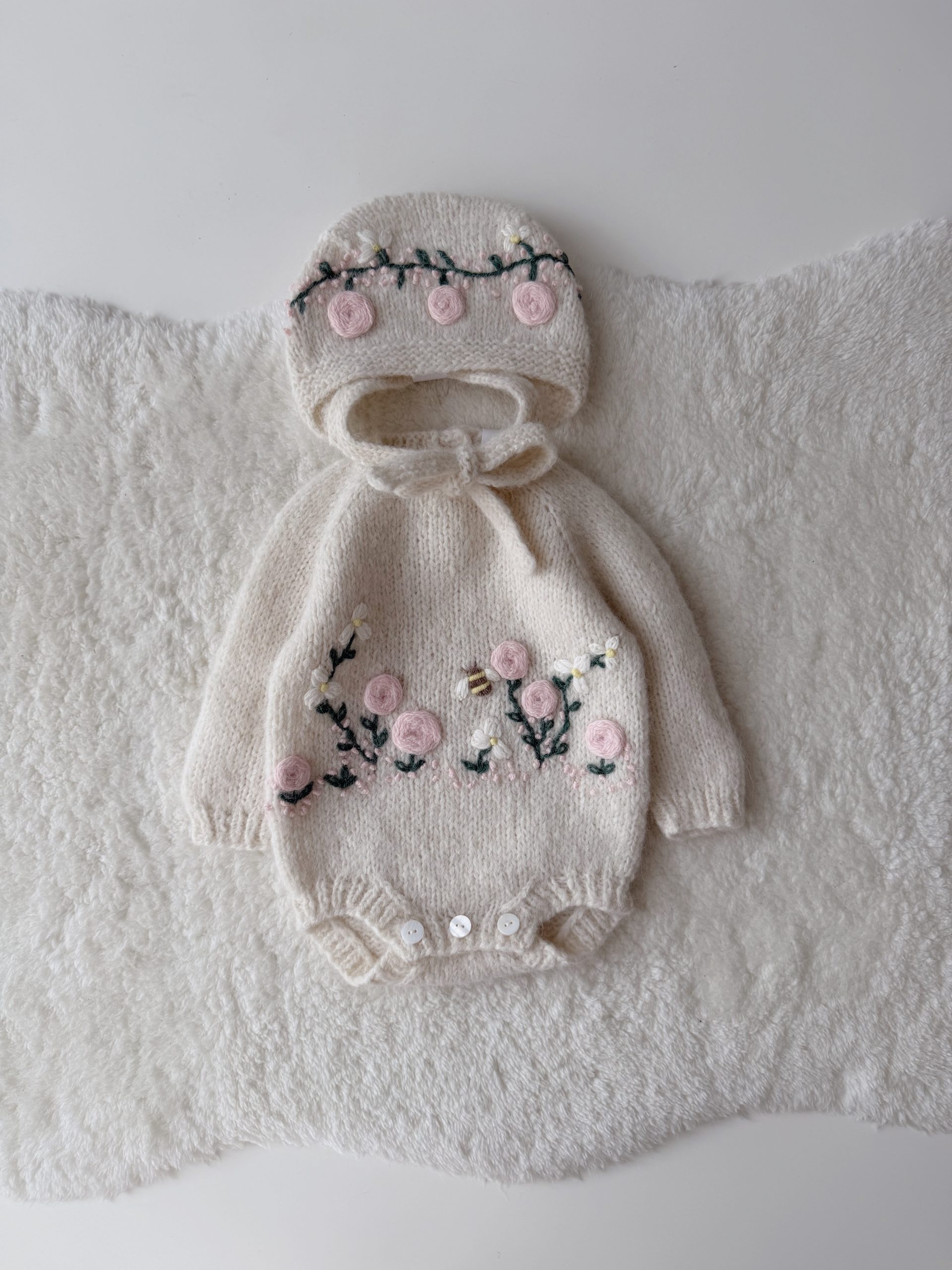 Hand Knit Merino Baby Romper and Bonnet Set – Photo Prop