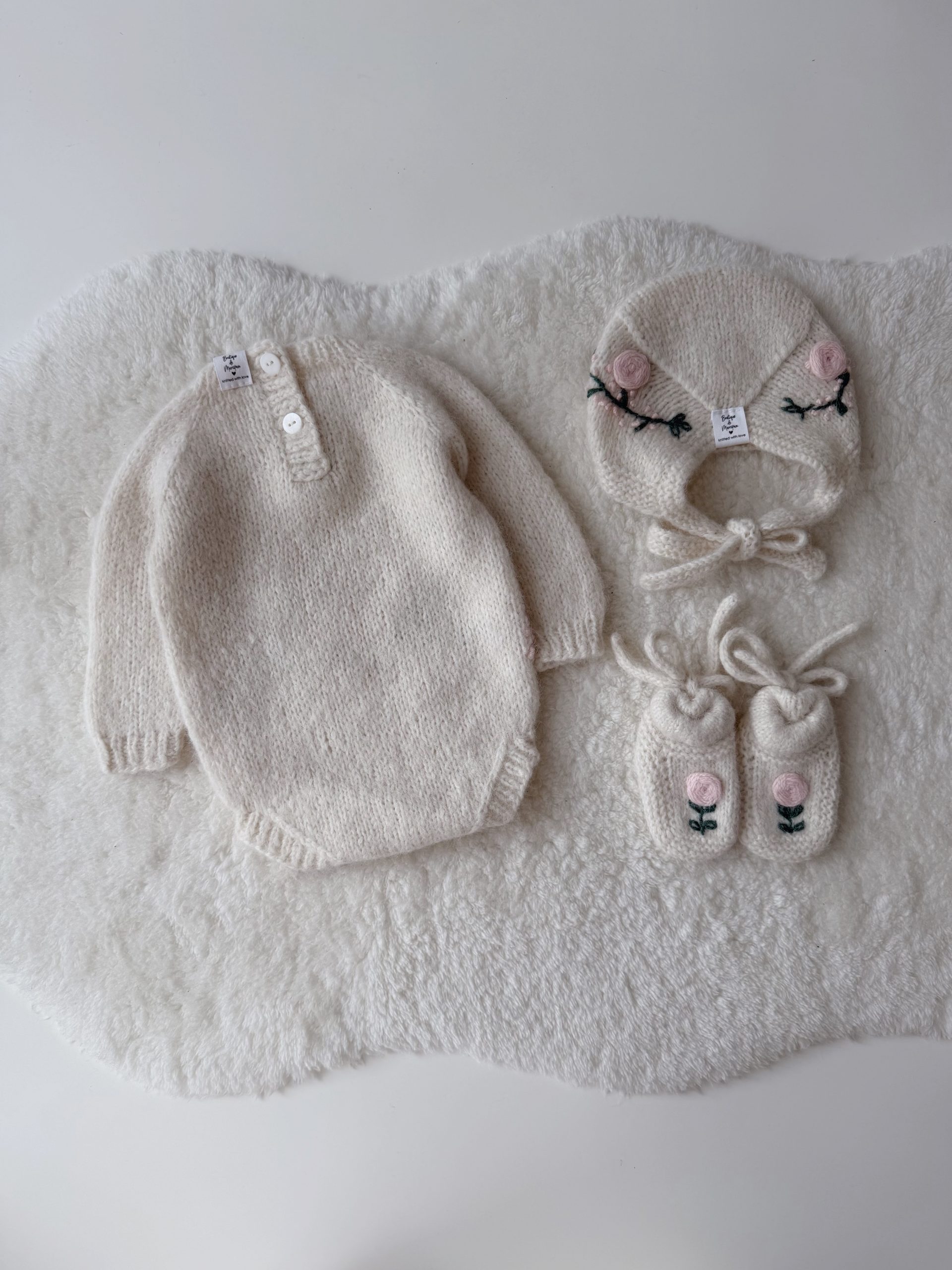 Knit Baby Romper Set – Alpaca Bonnet and Socks, Cream Photo Prop