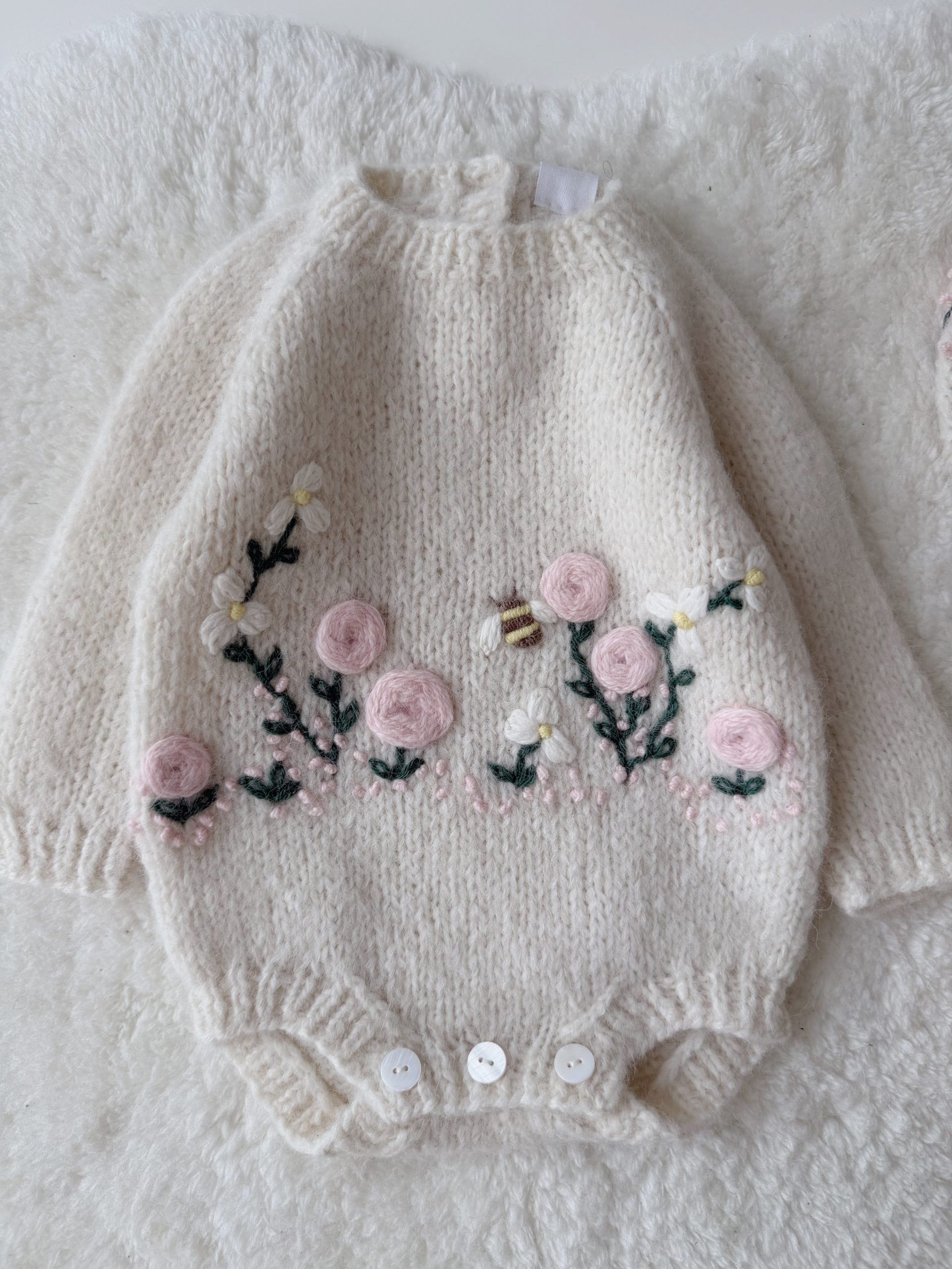 Merino Wool Baby Romper Set – Pink Popcorn Knit Outfit