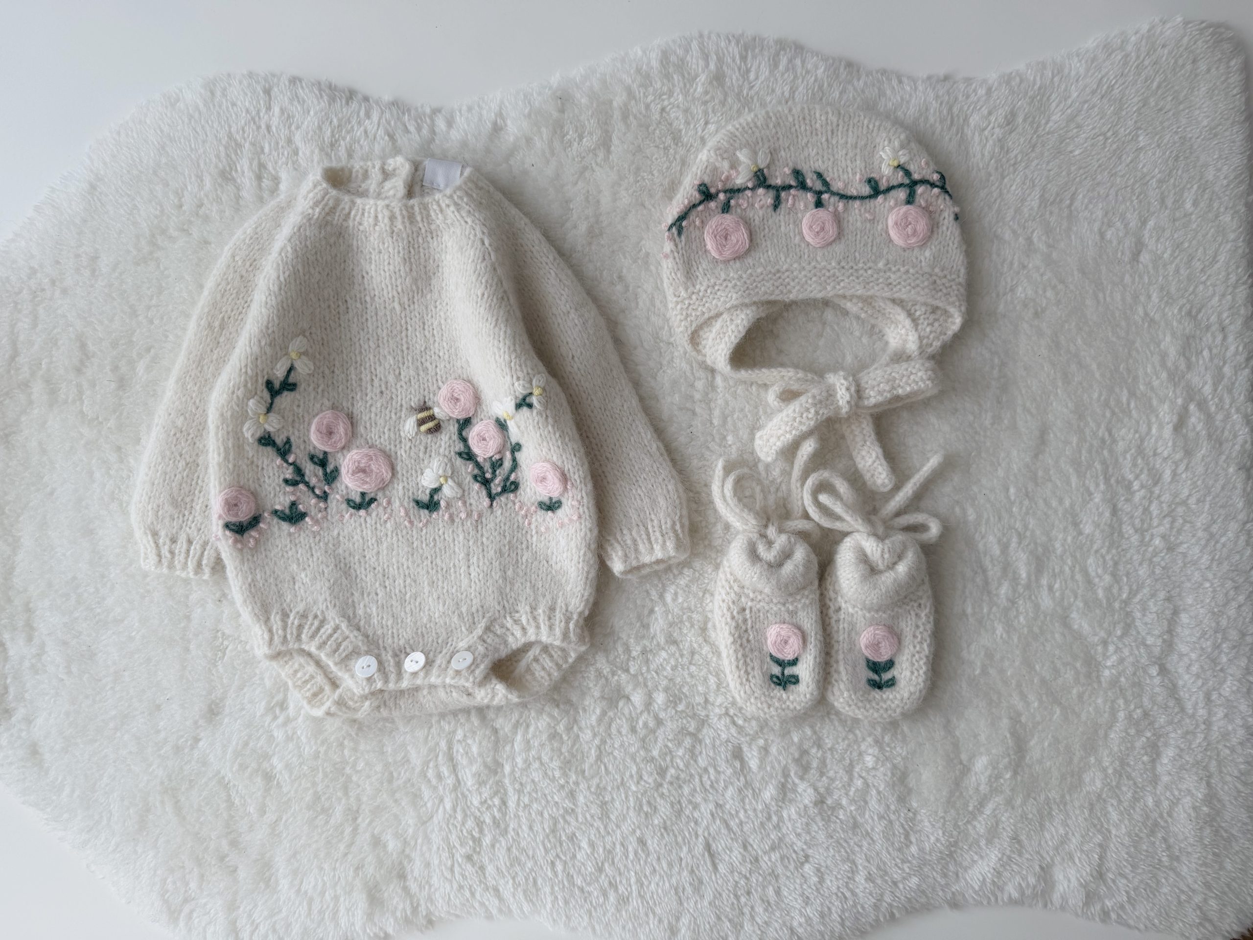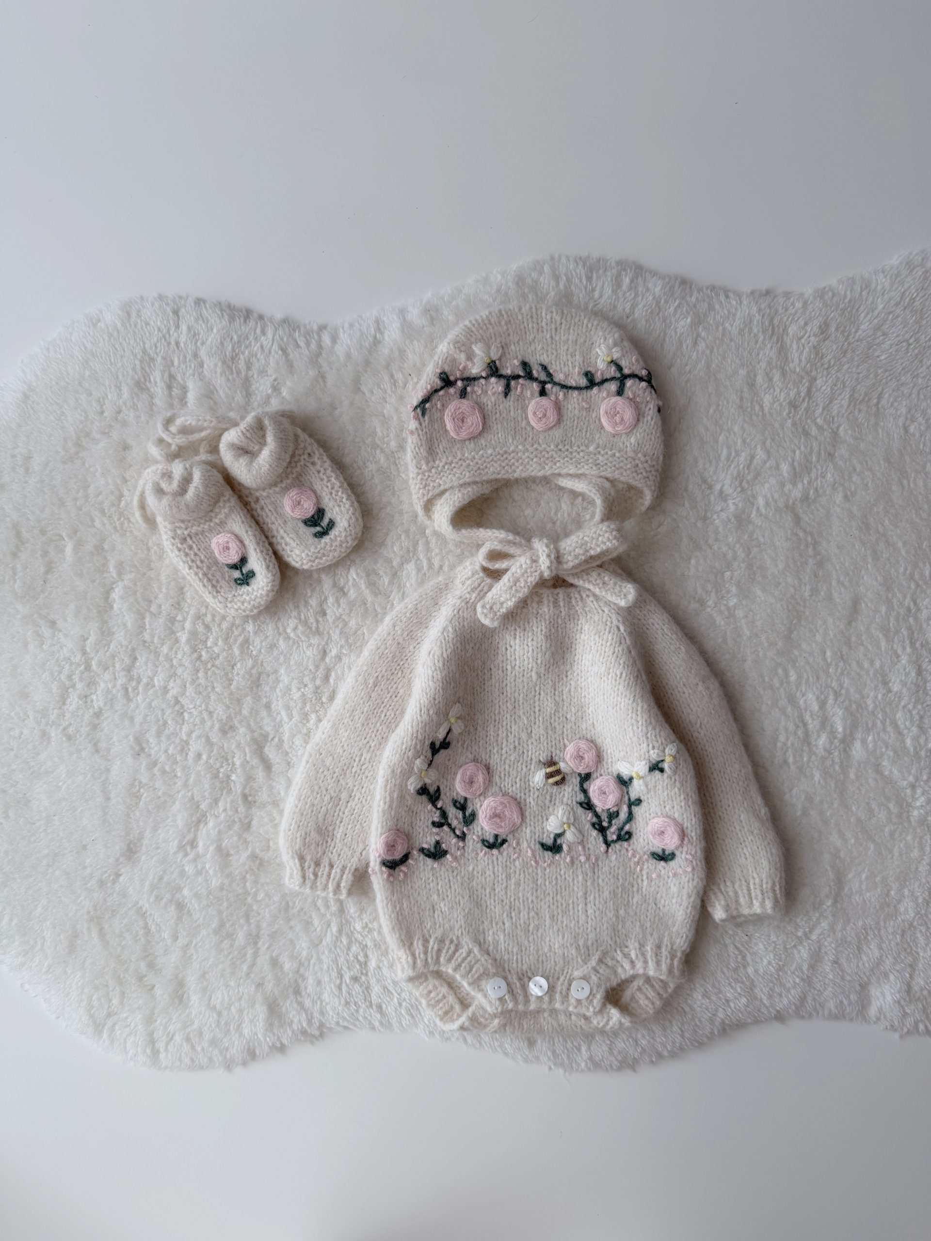 Merino Knit Baby Angel Outfit – Romper, Bonnet & Booties