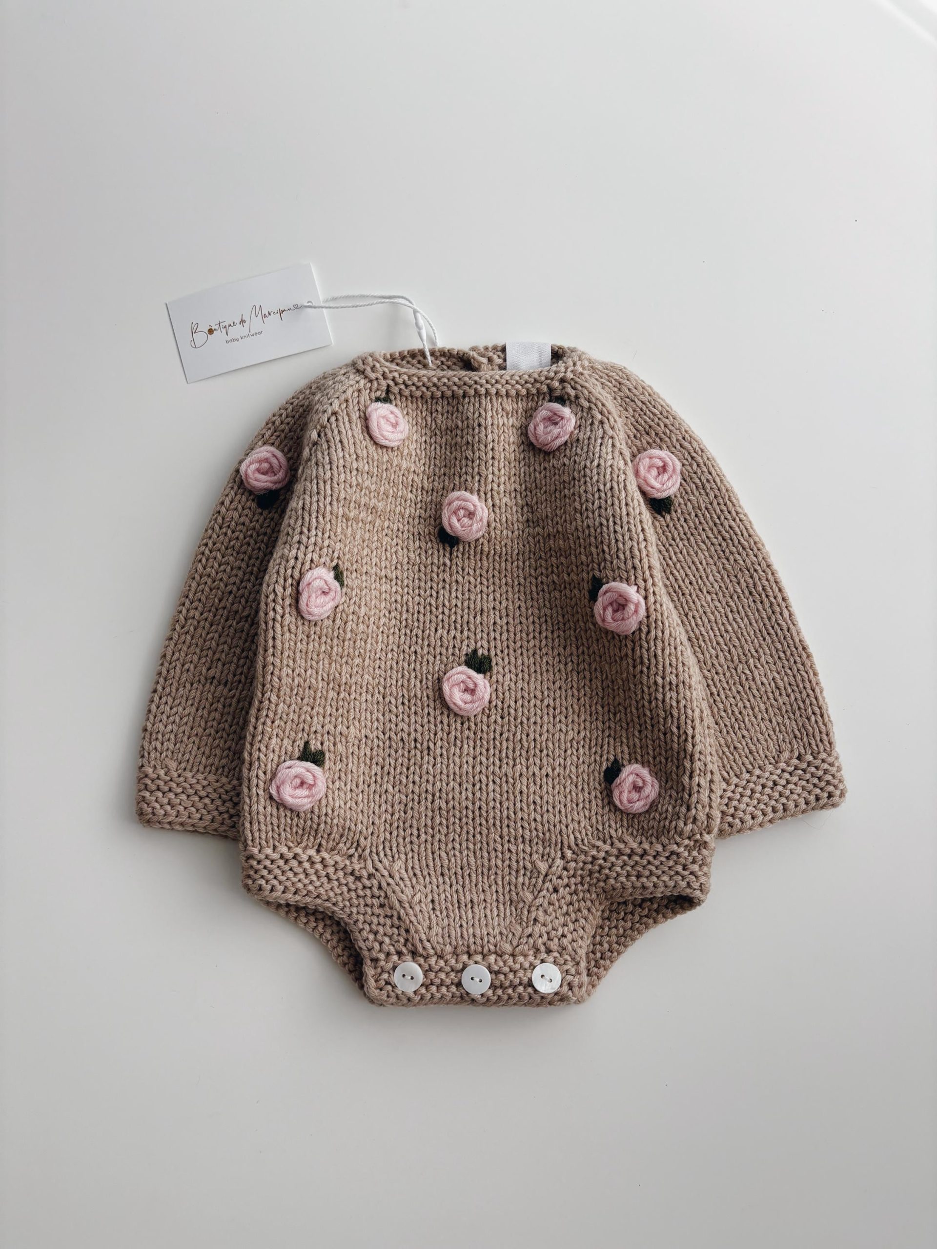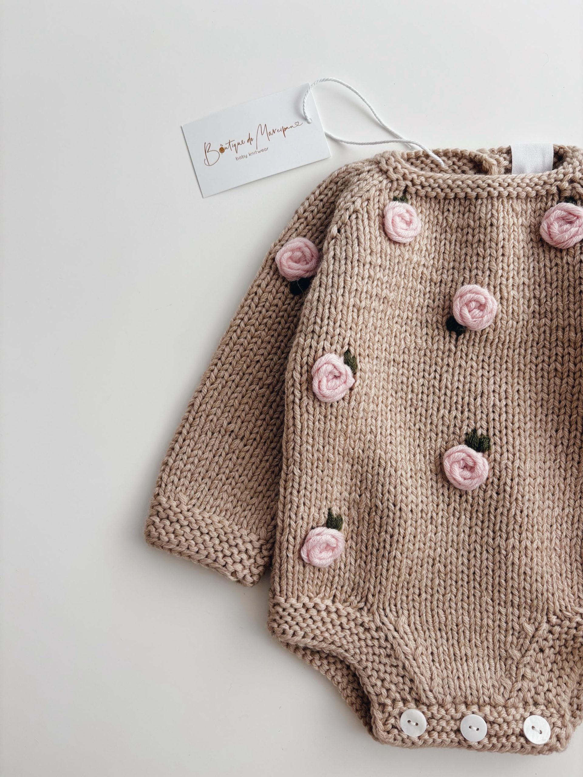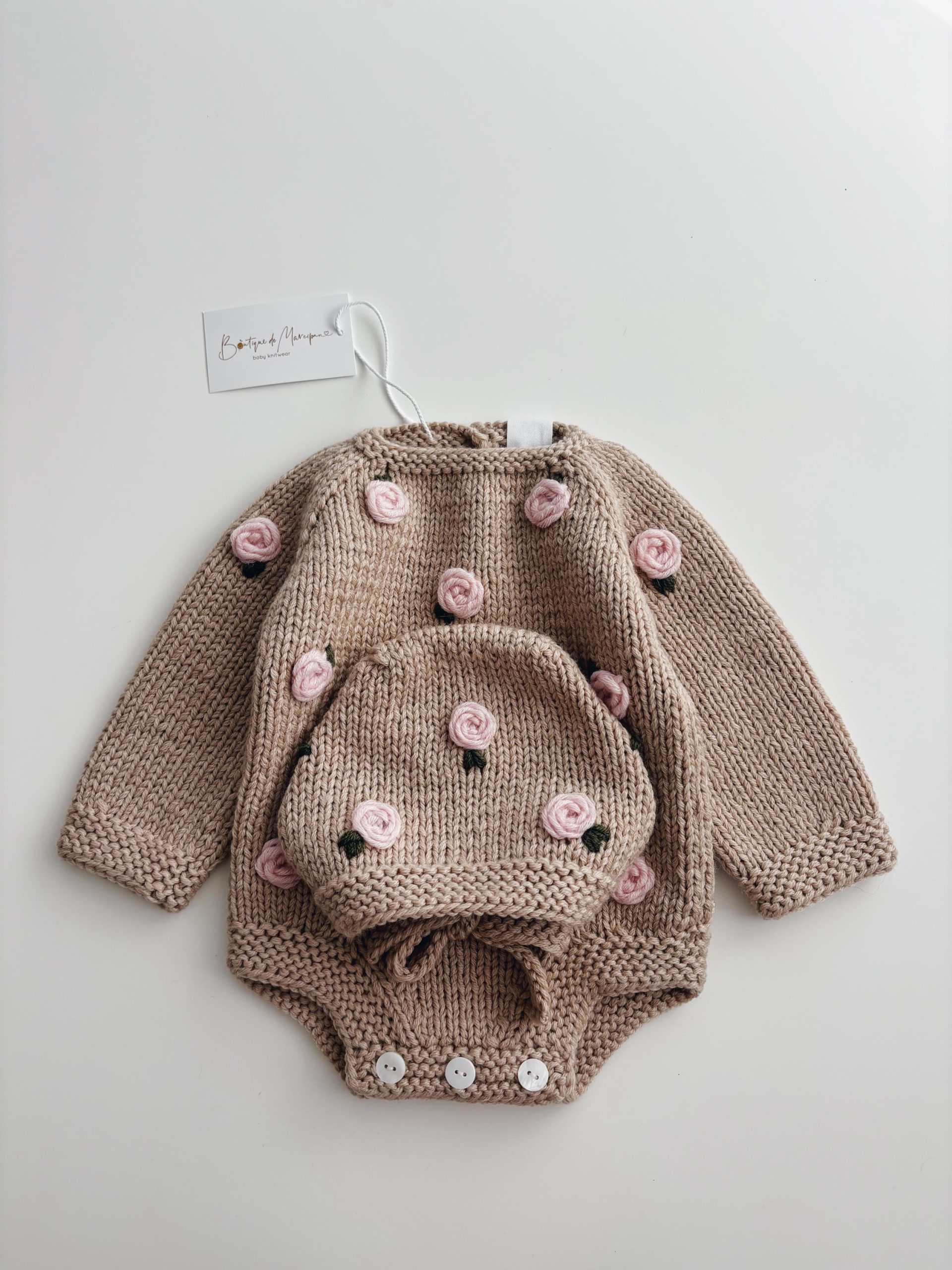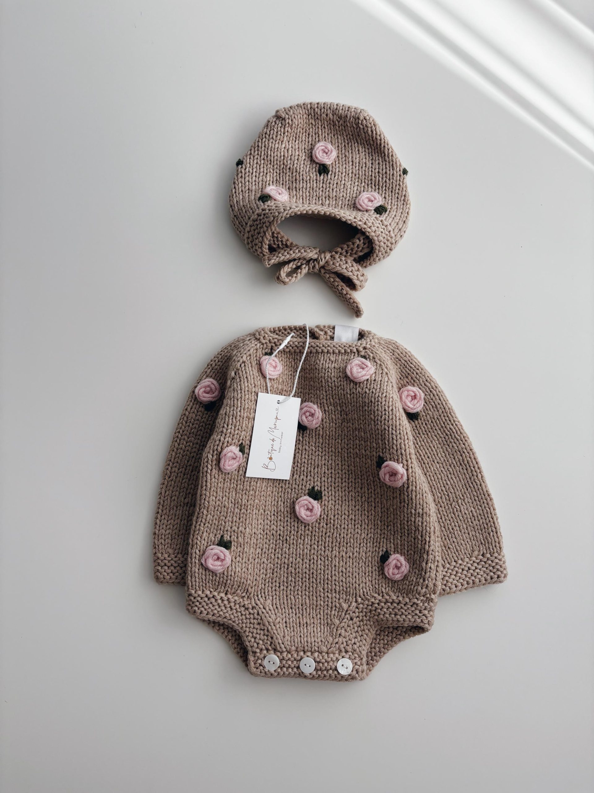 Embroidered Merino Baby Romper and Bonnet Set – Knitted Photo Prop