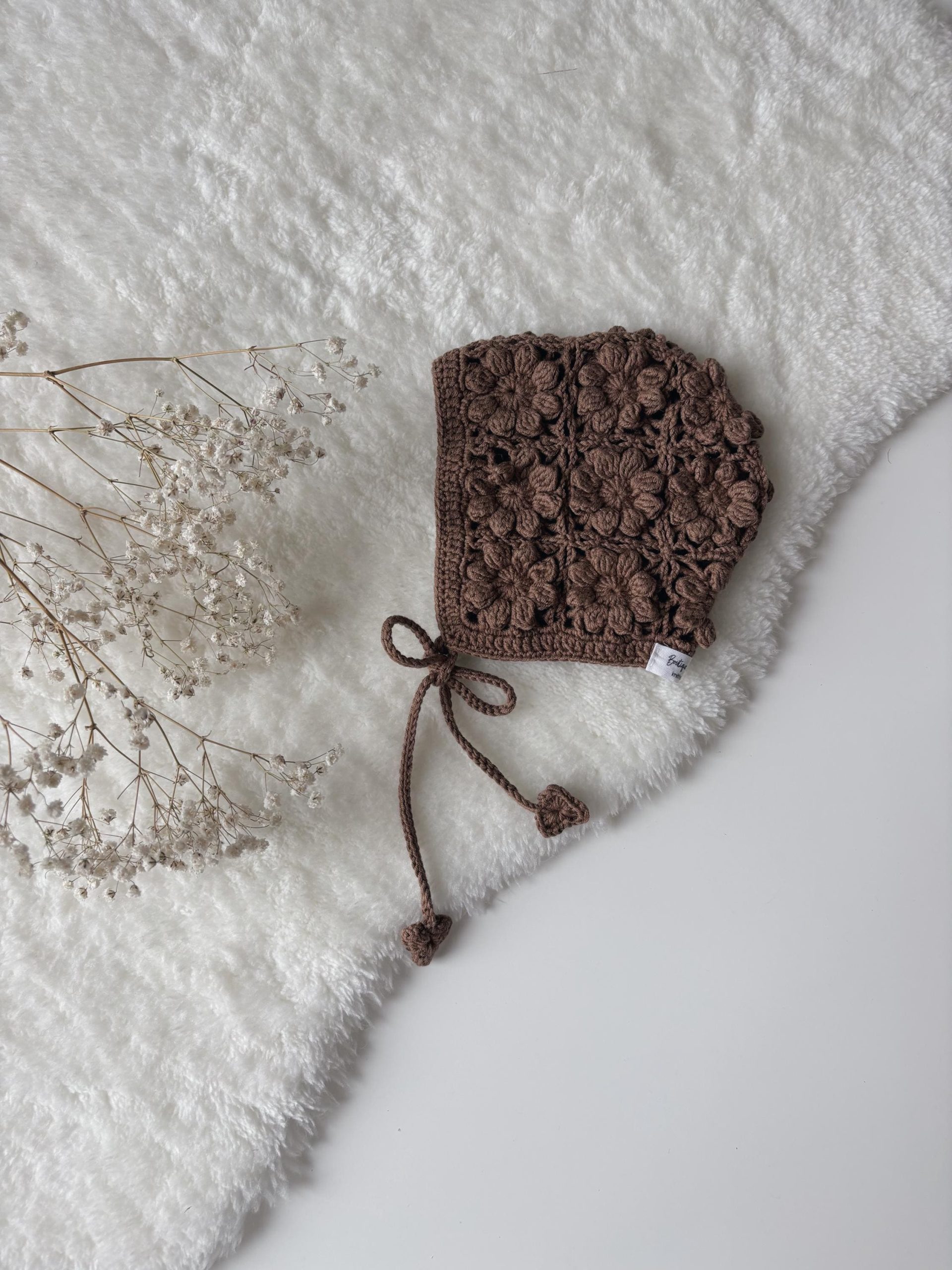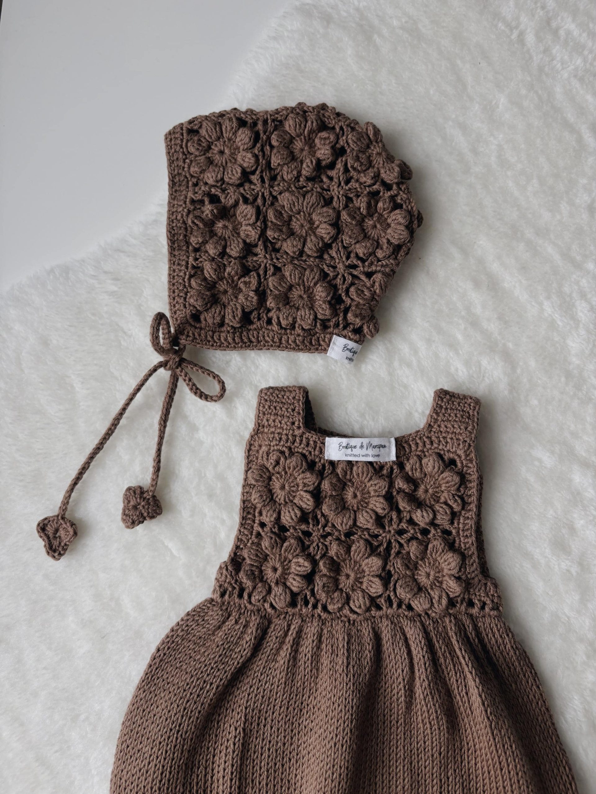 Set of 2 – Long sleeve popcorn romper and bonnet with fabric ties