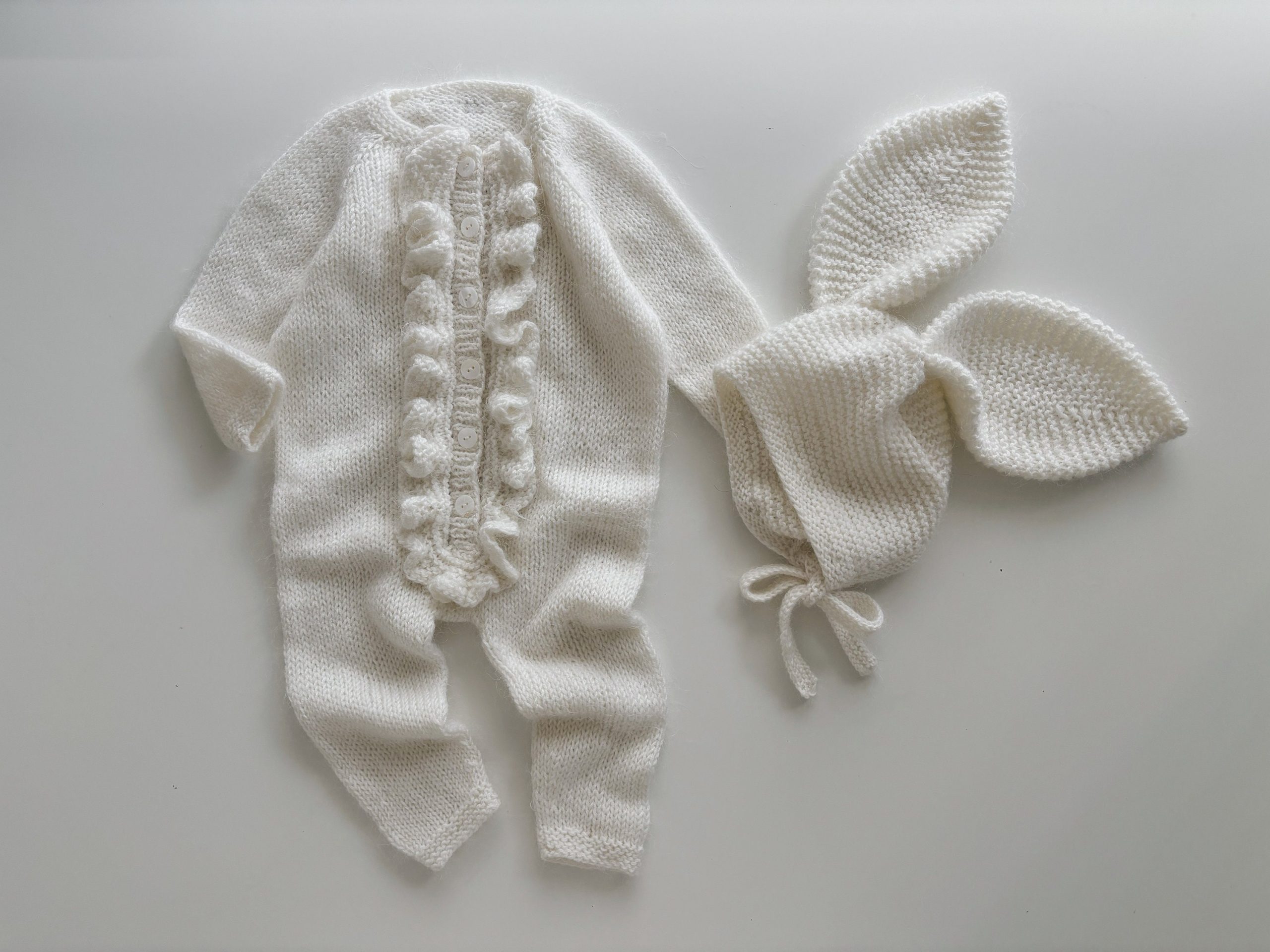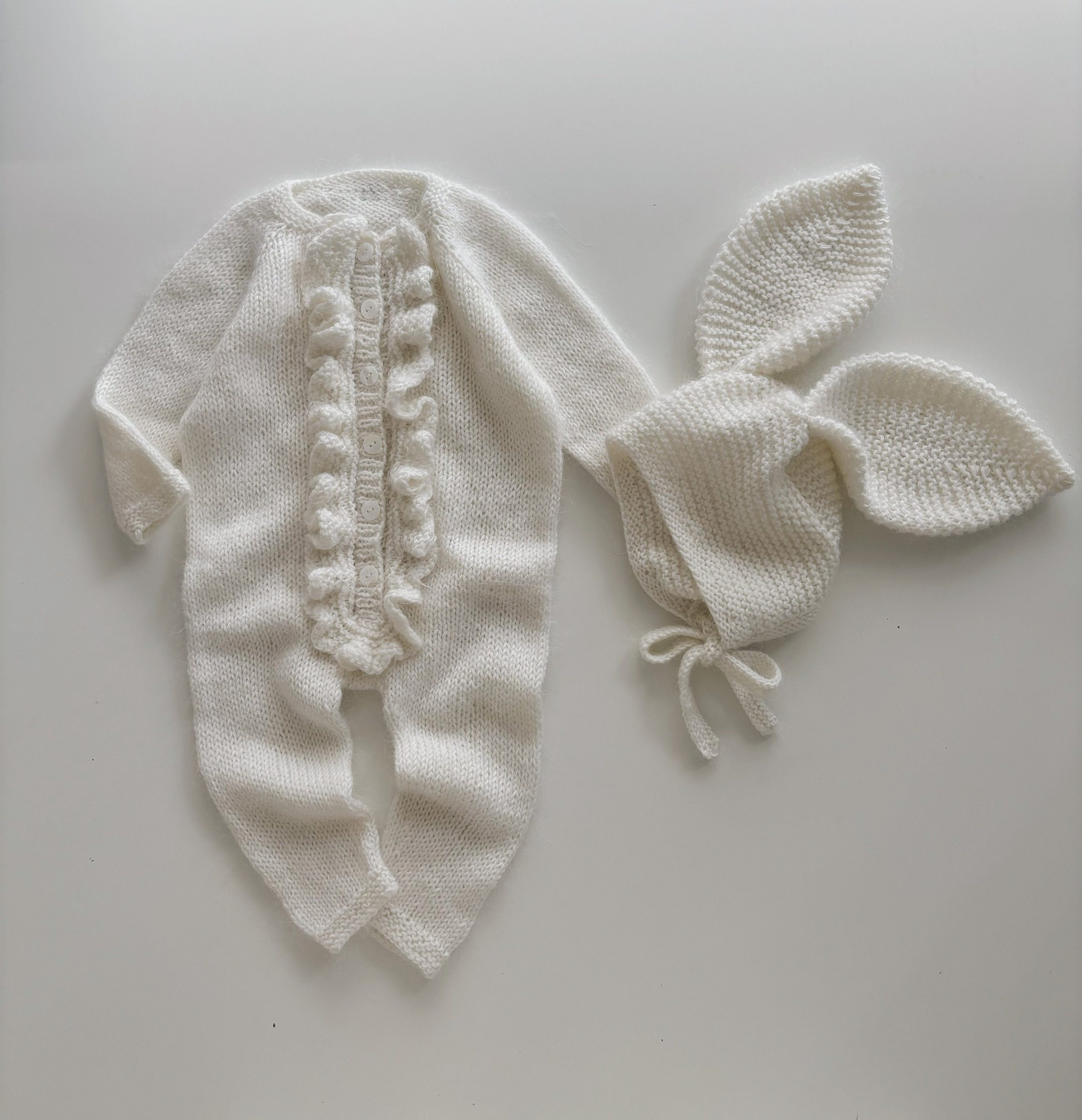 Baby Romper and Bunny Bonnet Set – Merino Mohair Knit Outfit