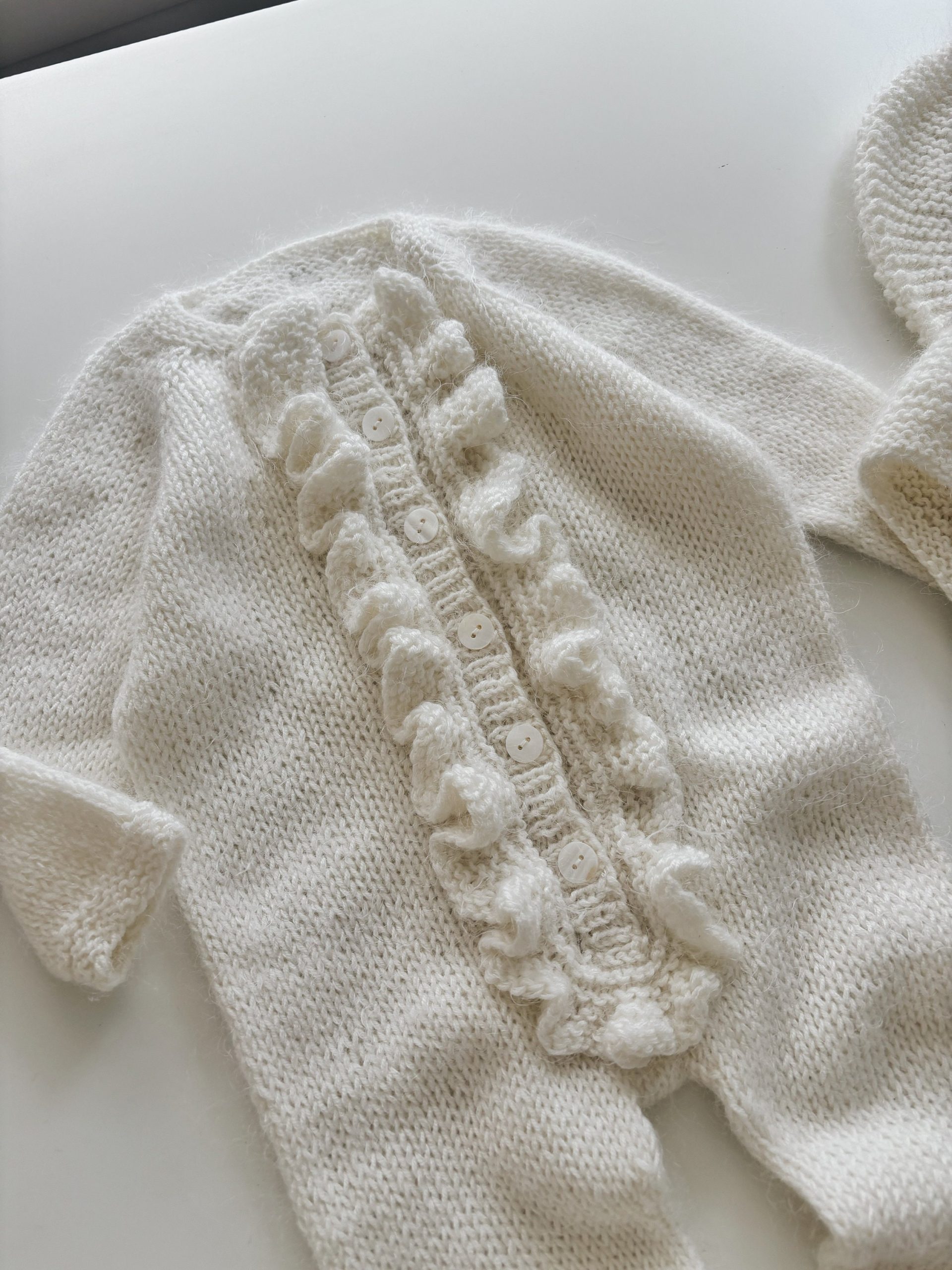 Merino Knit Baby Romper and Bonnet Set - Cream Ruffle Outfit