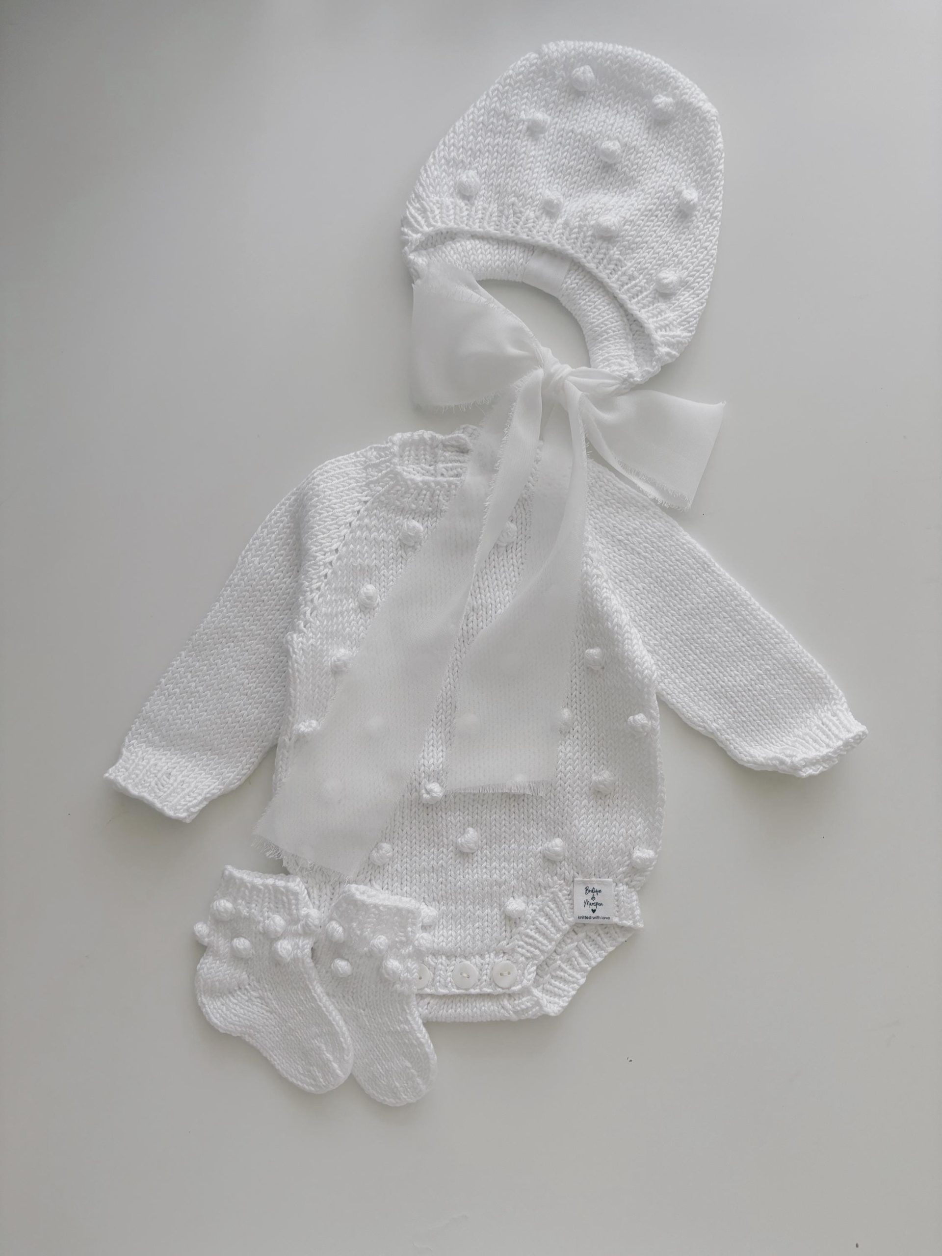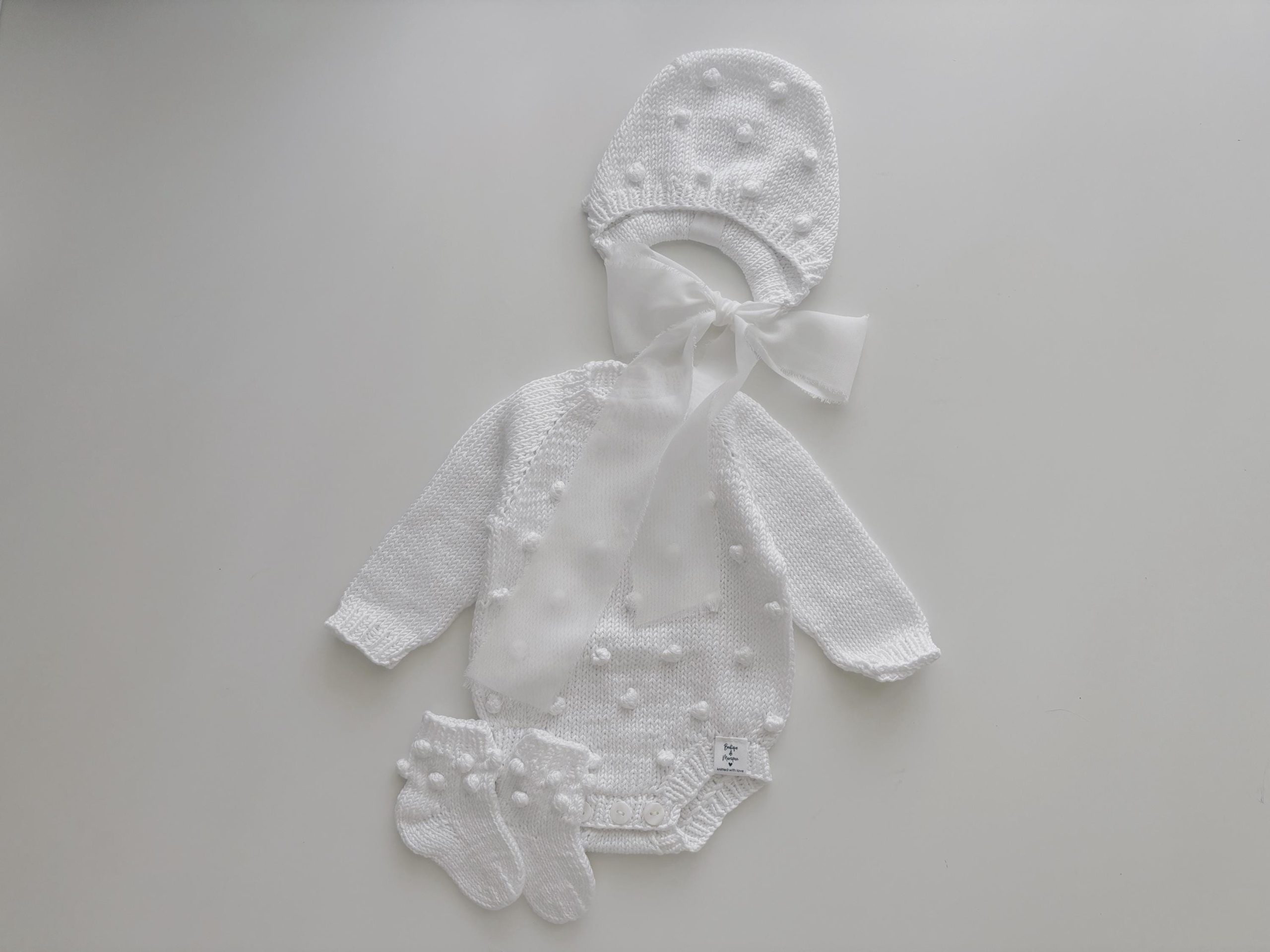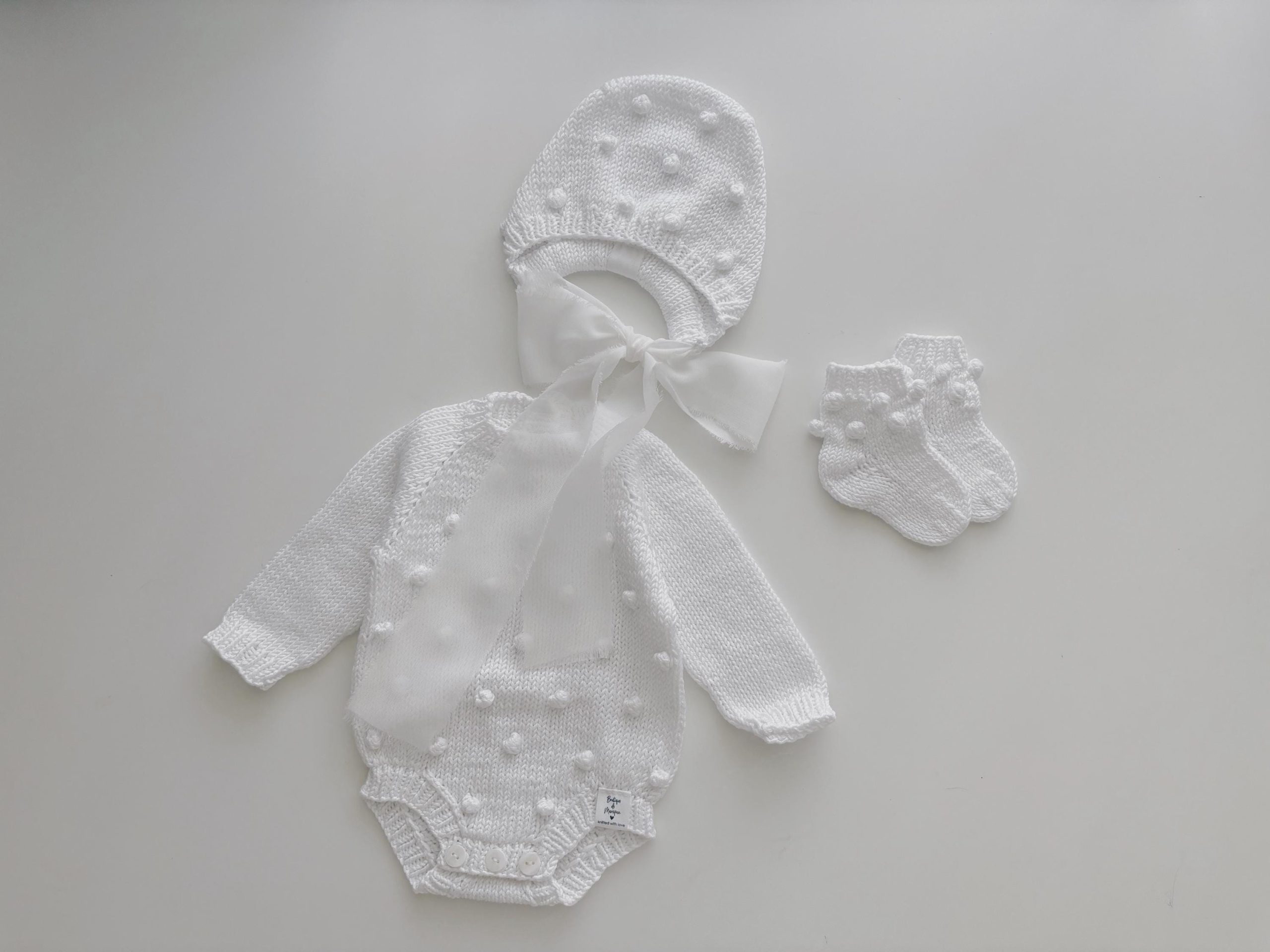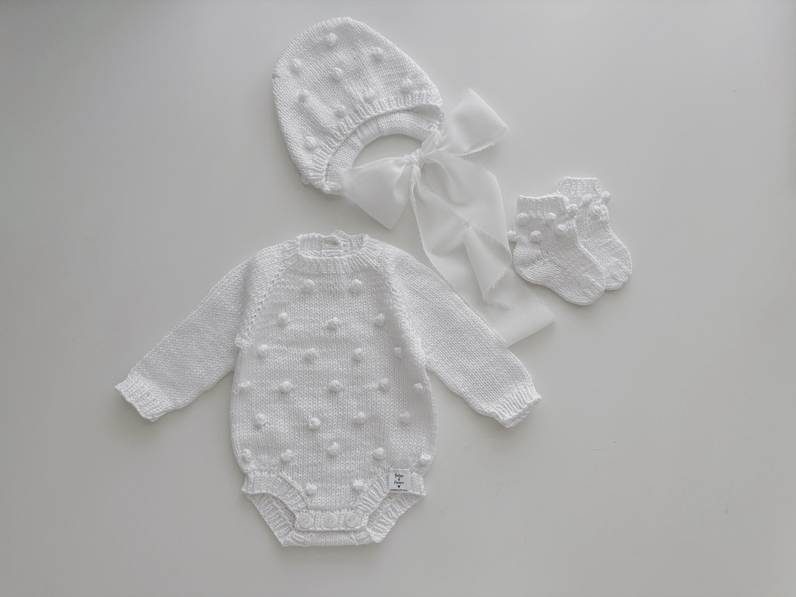 Merino Baby Romper and Bonnet Set – White Knit Photo Prop