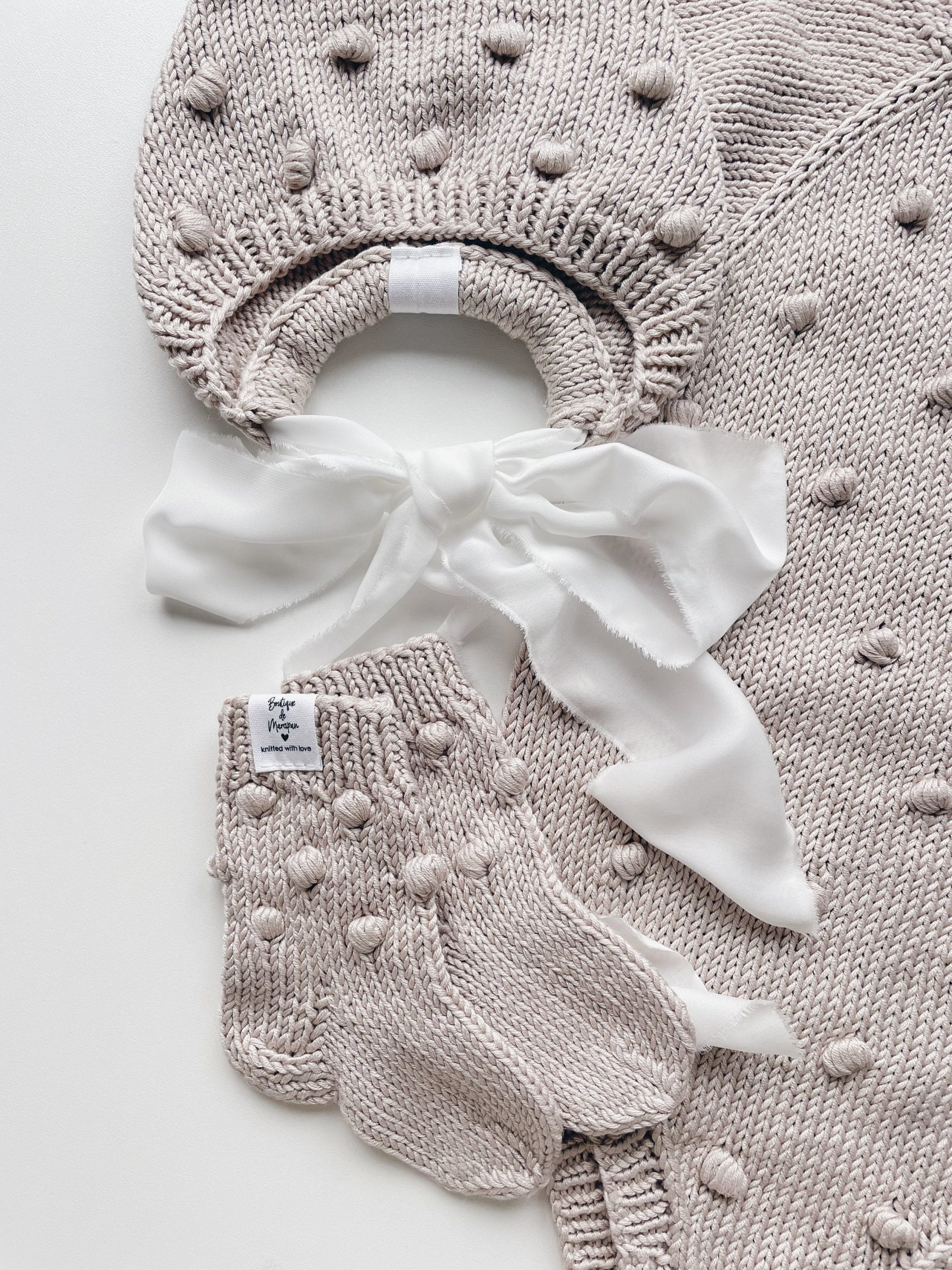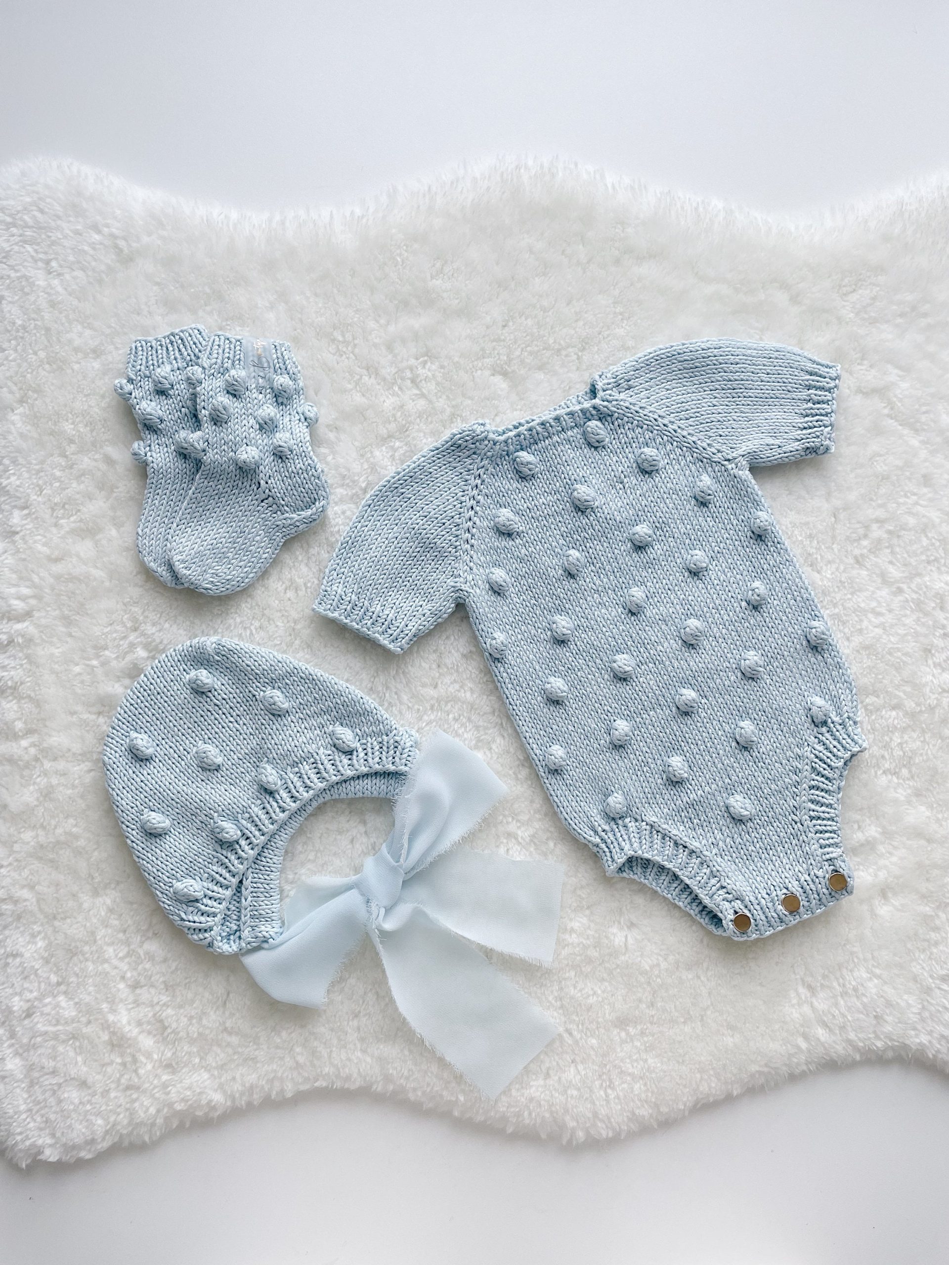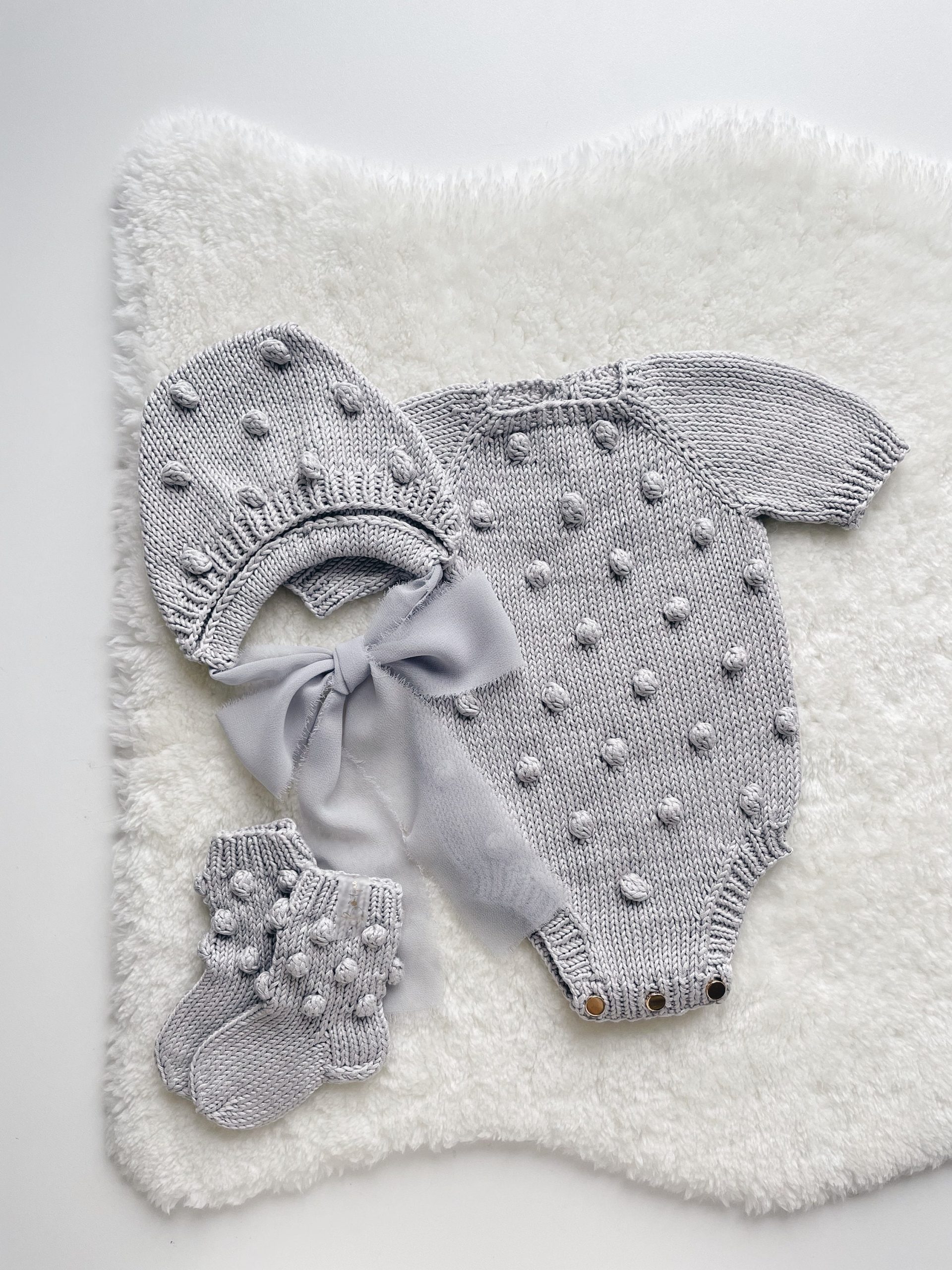 Merino Knit Baby Angel Outfit – Romper, Bonnet & Booties