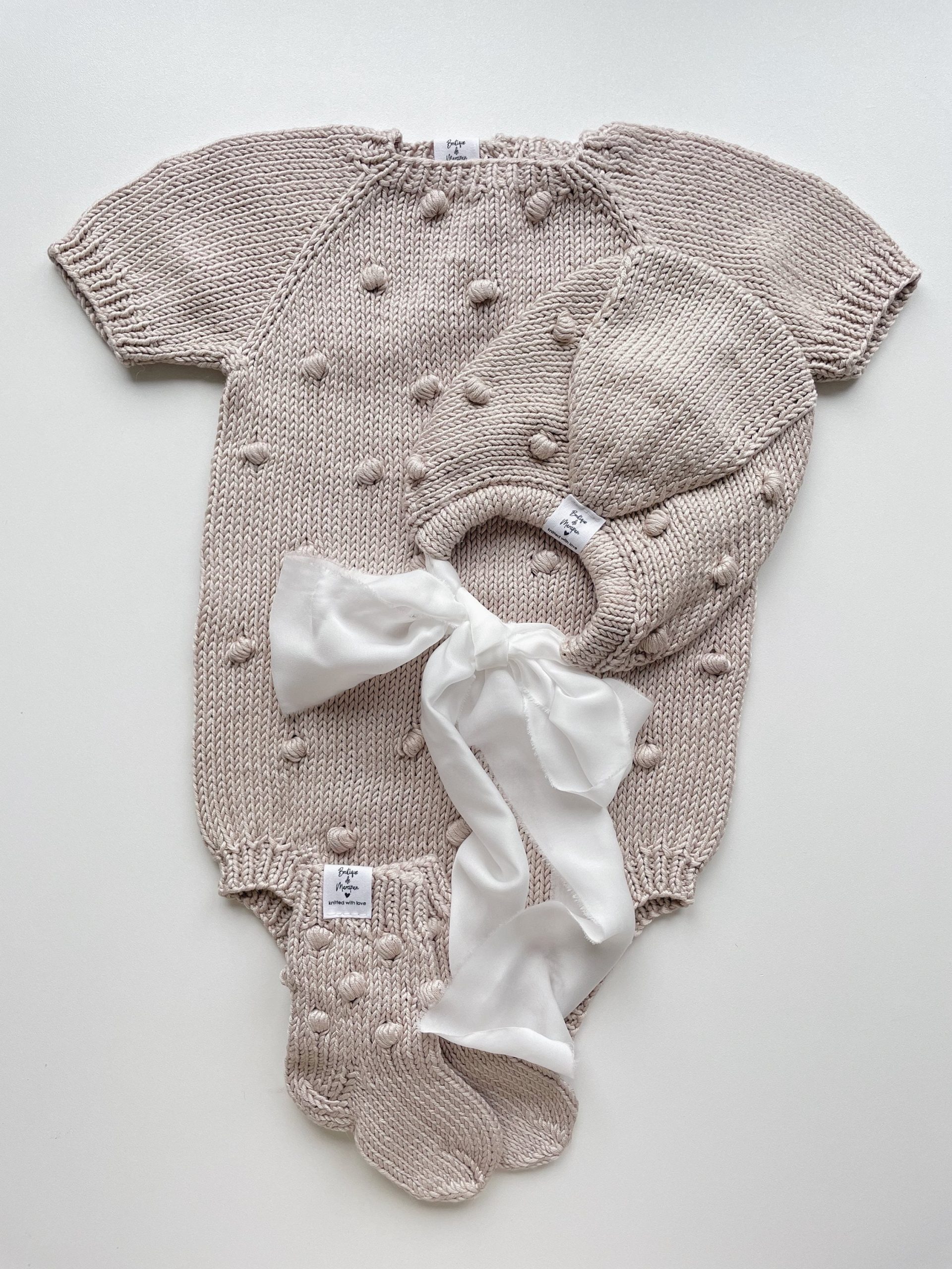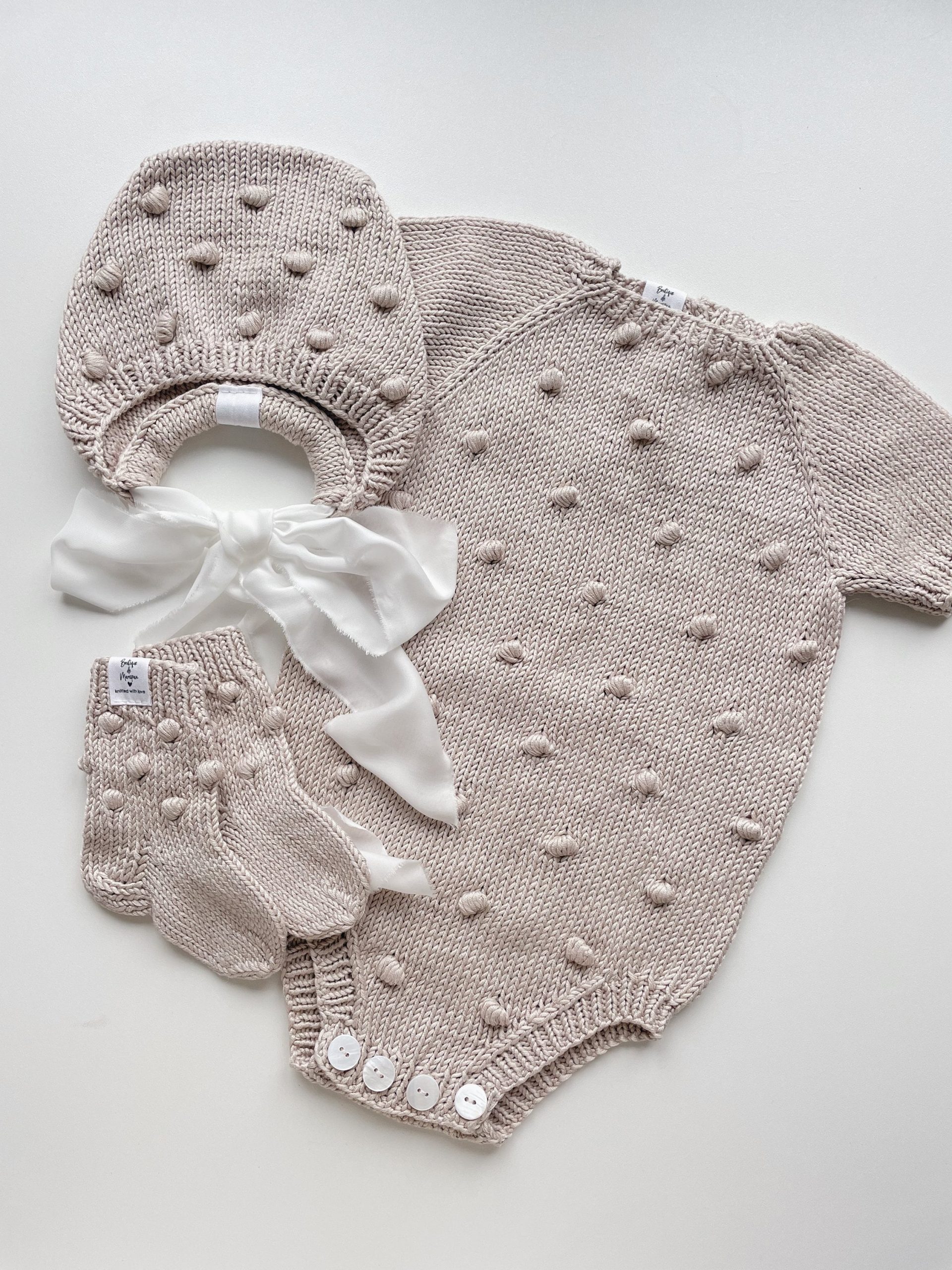 Cotton Baby Romper Set – Camel Knit Bonnet & Booties, Mink Pom Poms