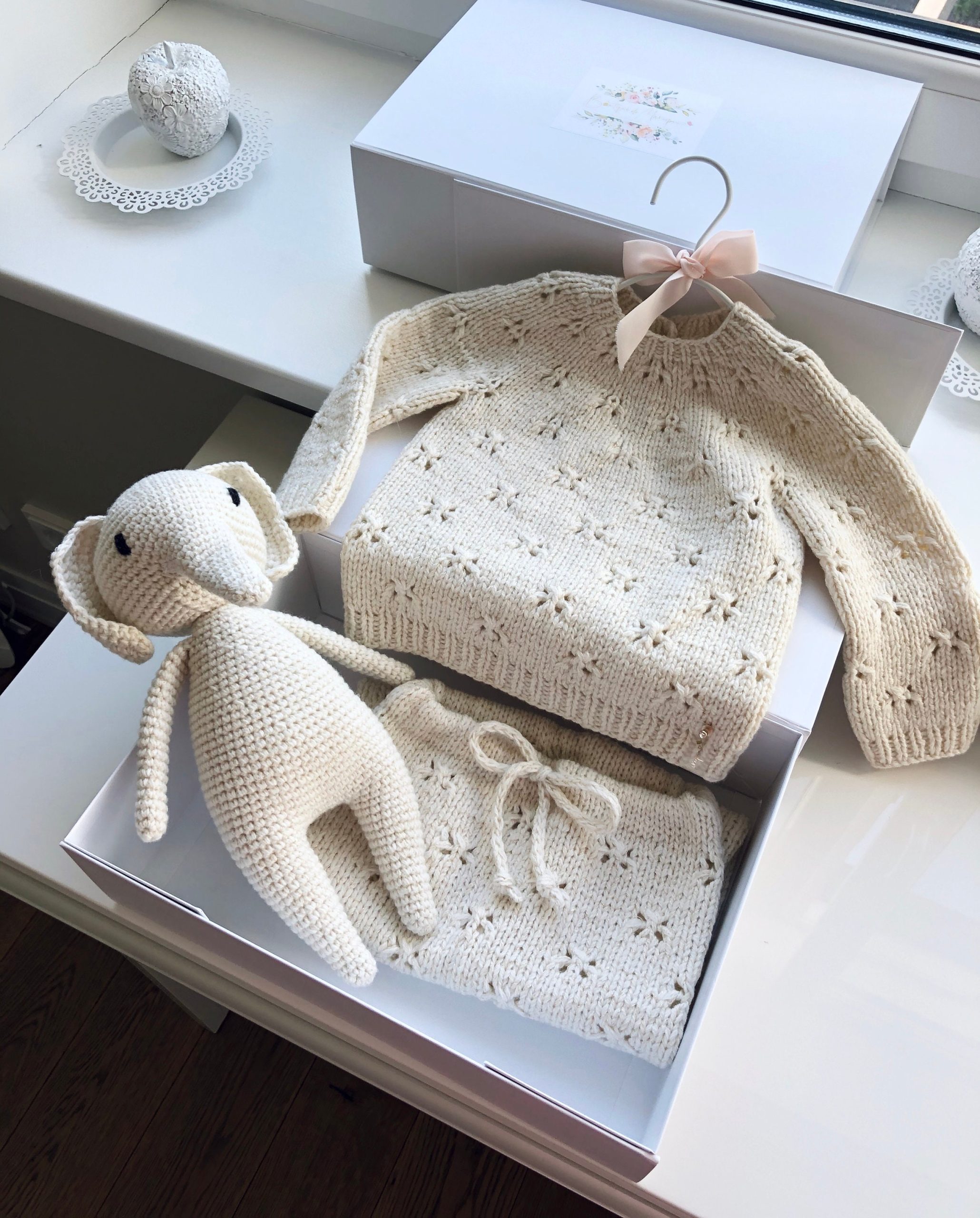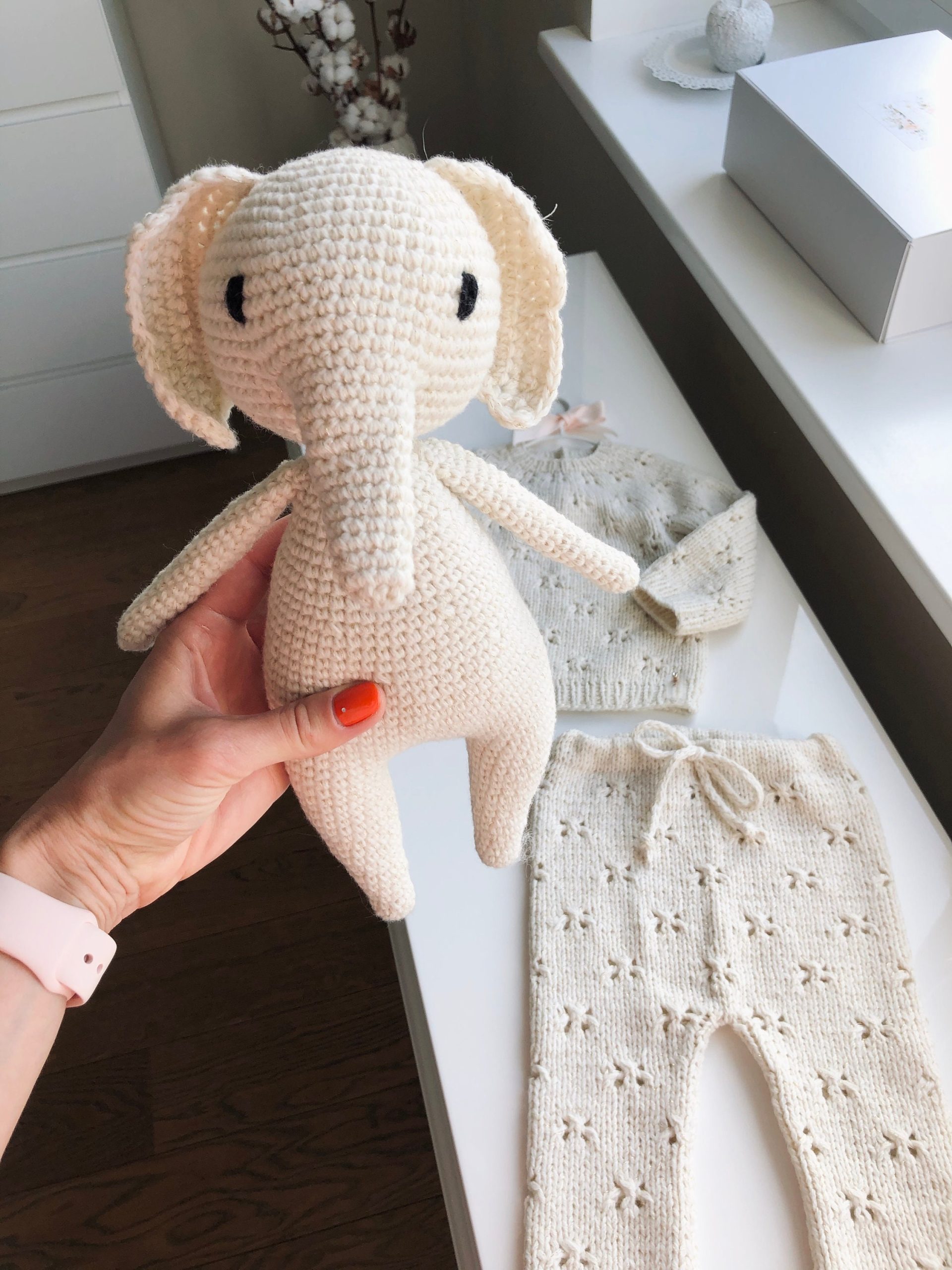 Cream Merino Wool Baby Outfit – Knit Sweater & Pants, Elephant Toy
