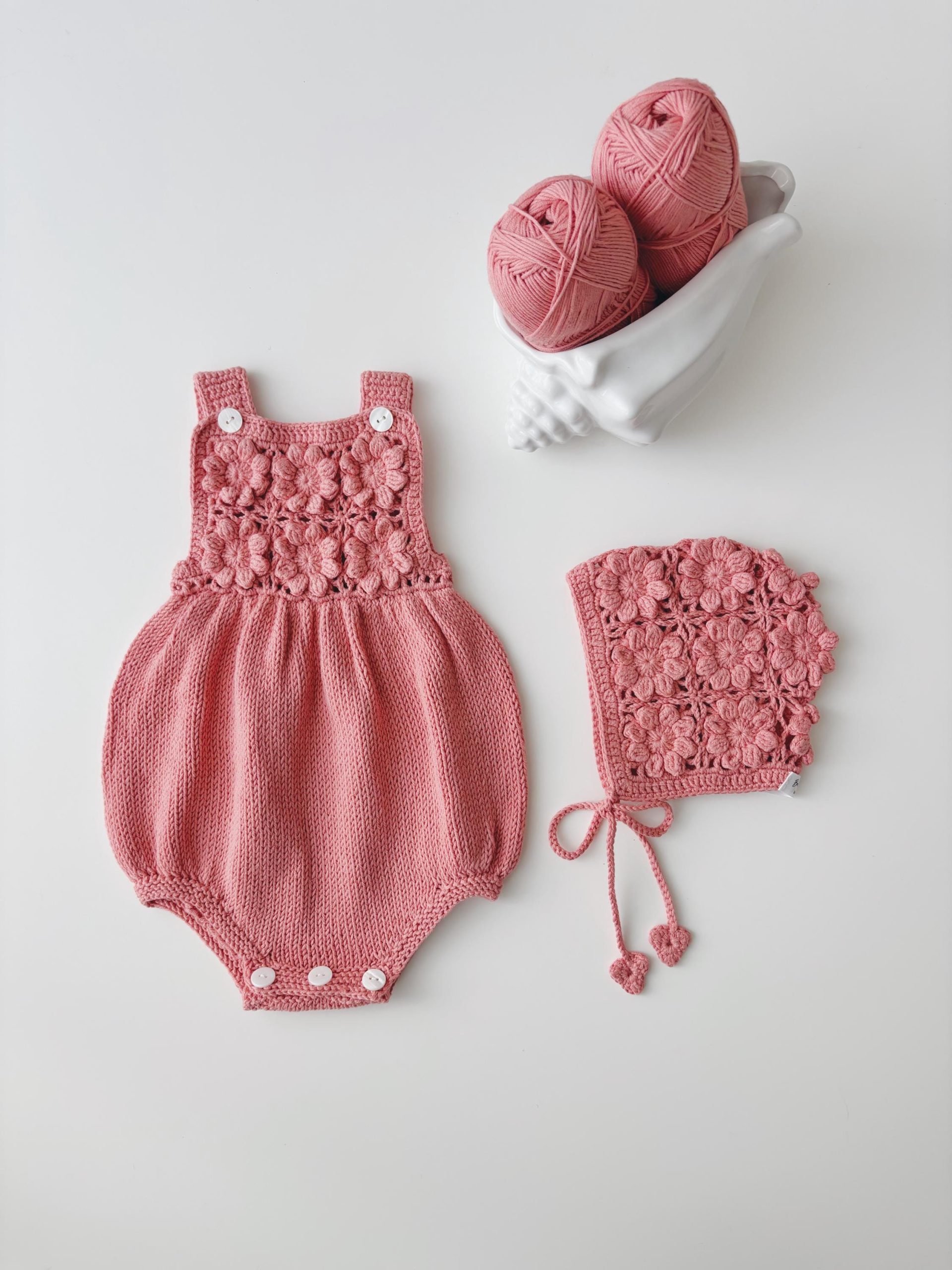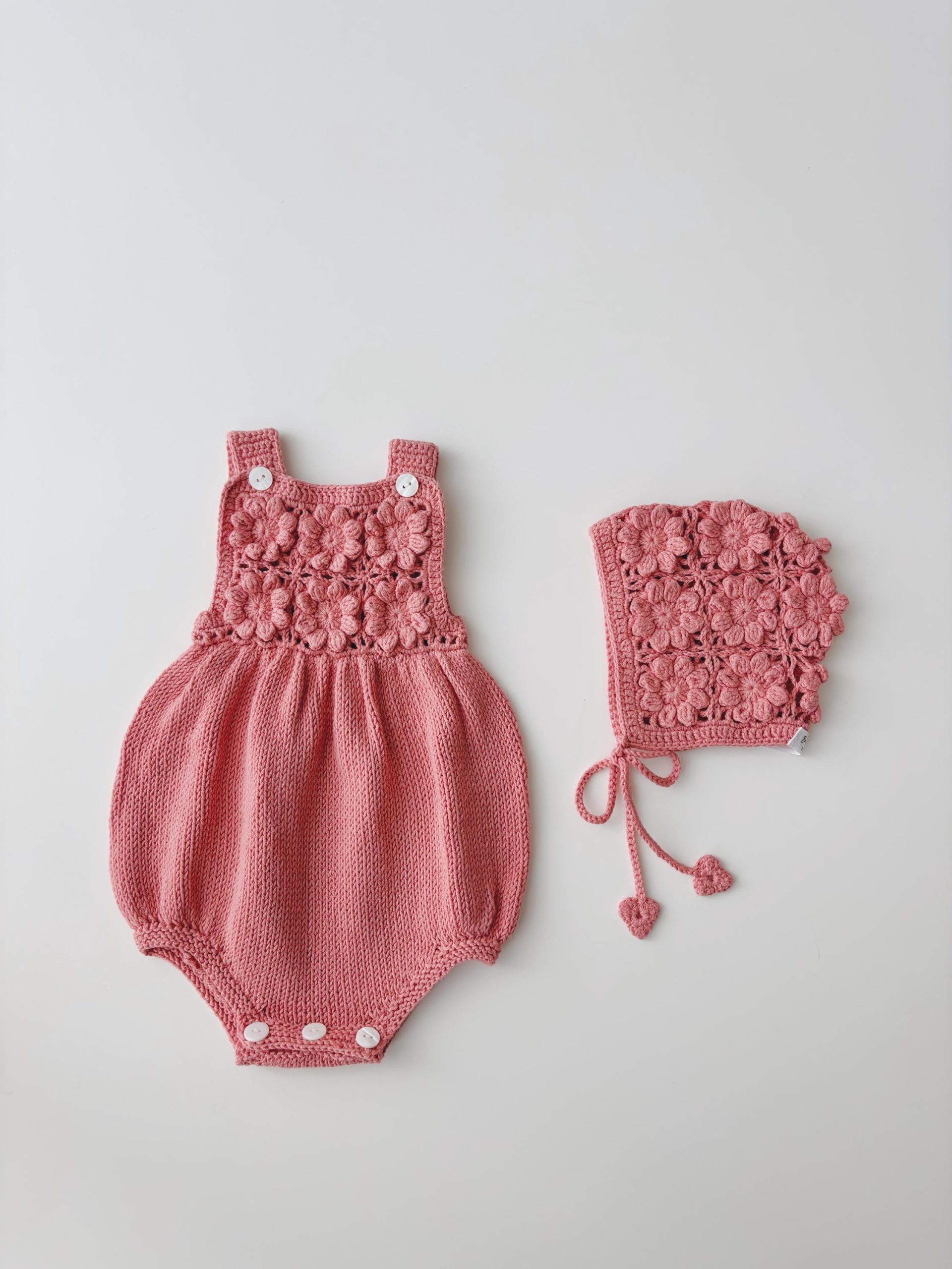Crochet Baby Romper and Bonnet Set – Coral Cotton Outfit