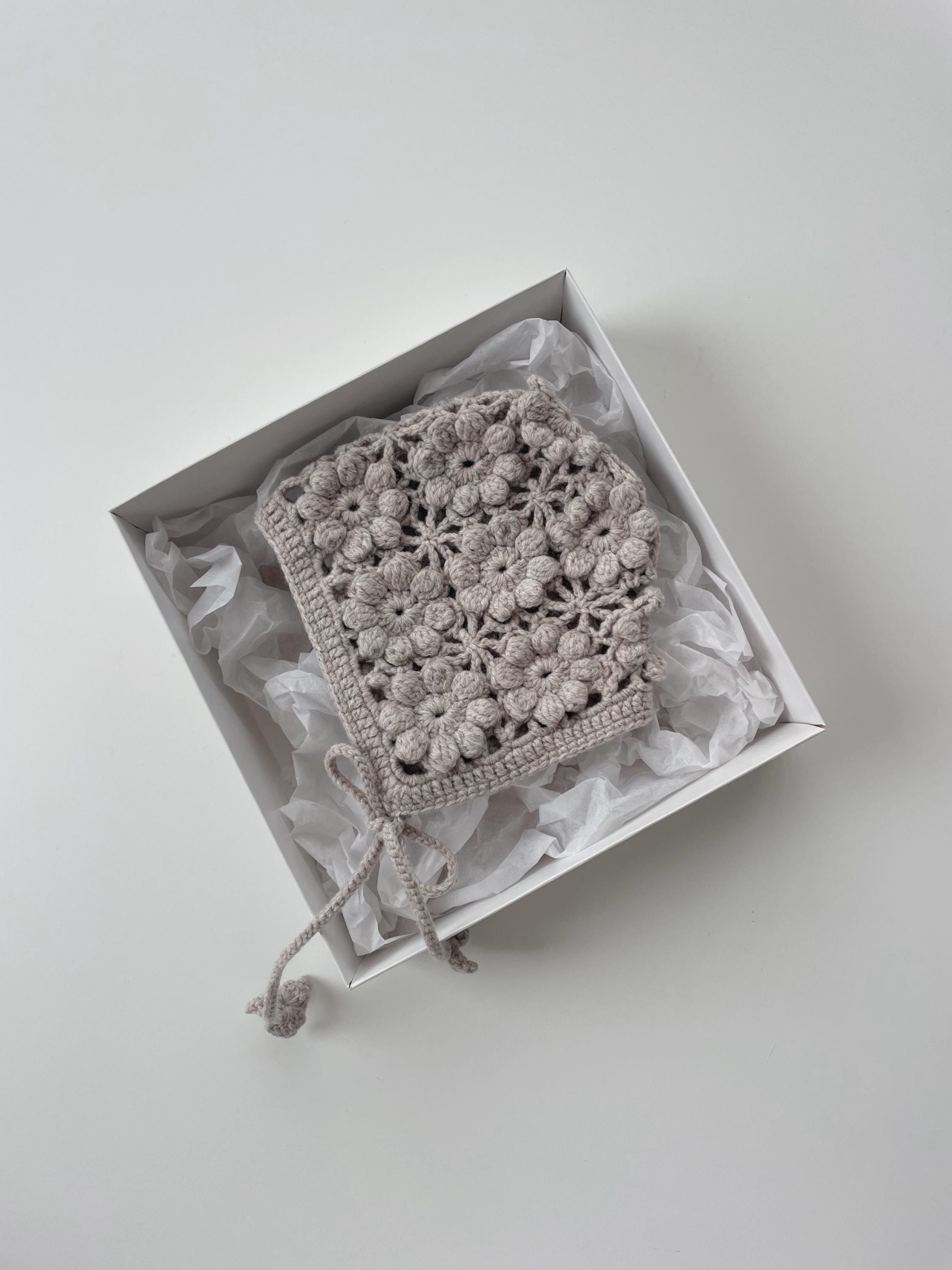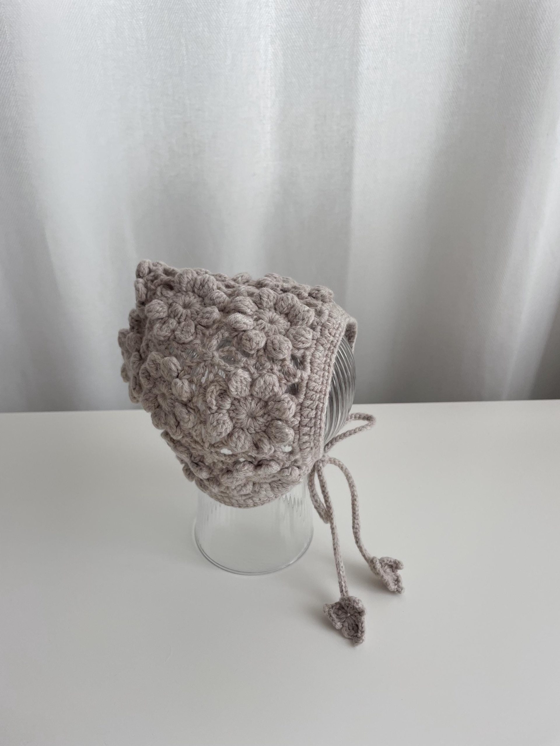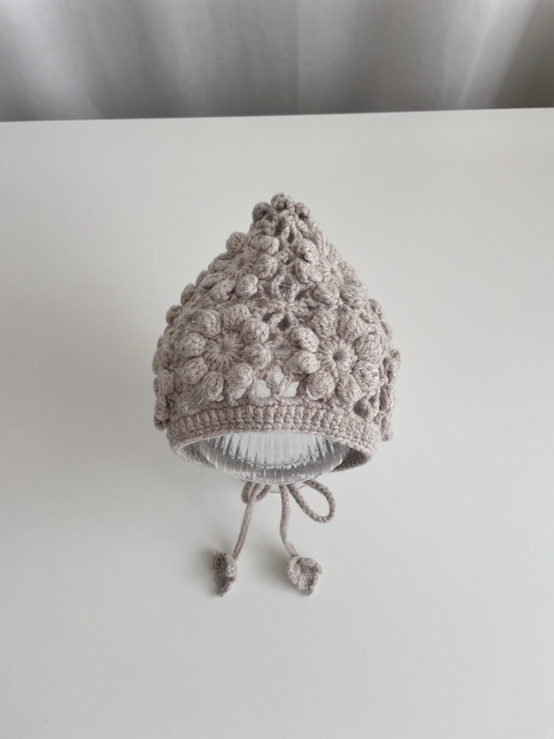 Baby girl popcorn bonnet – Alpaca yarn – Cream color