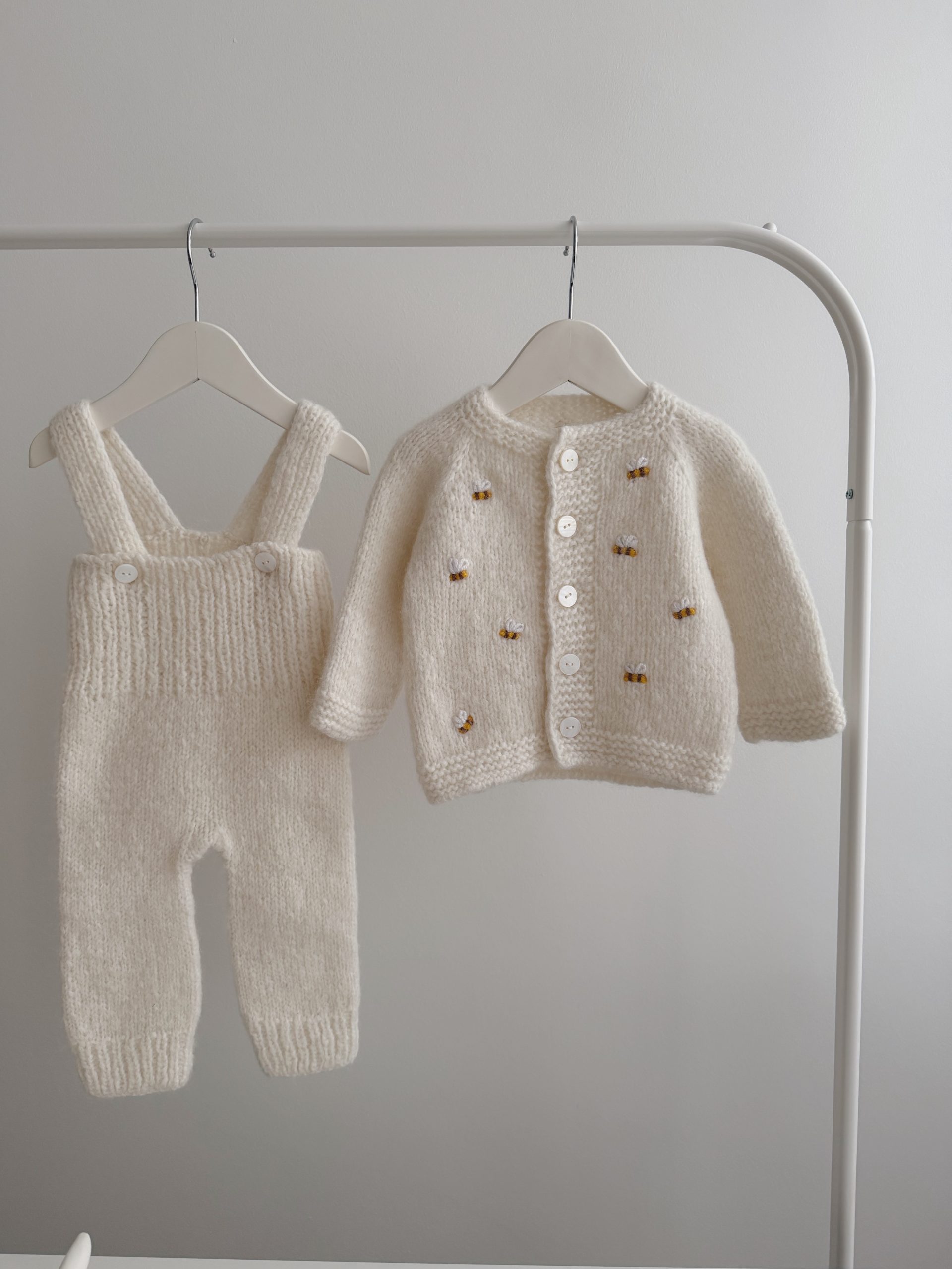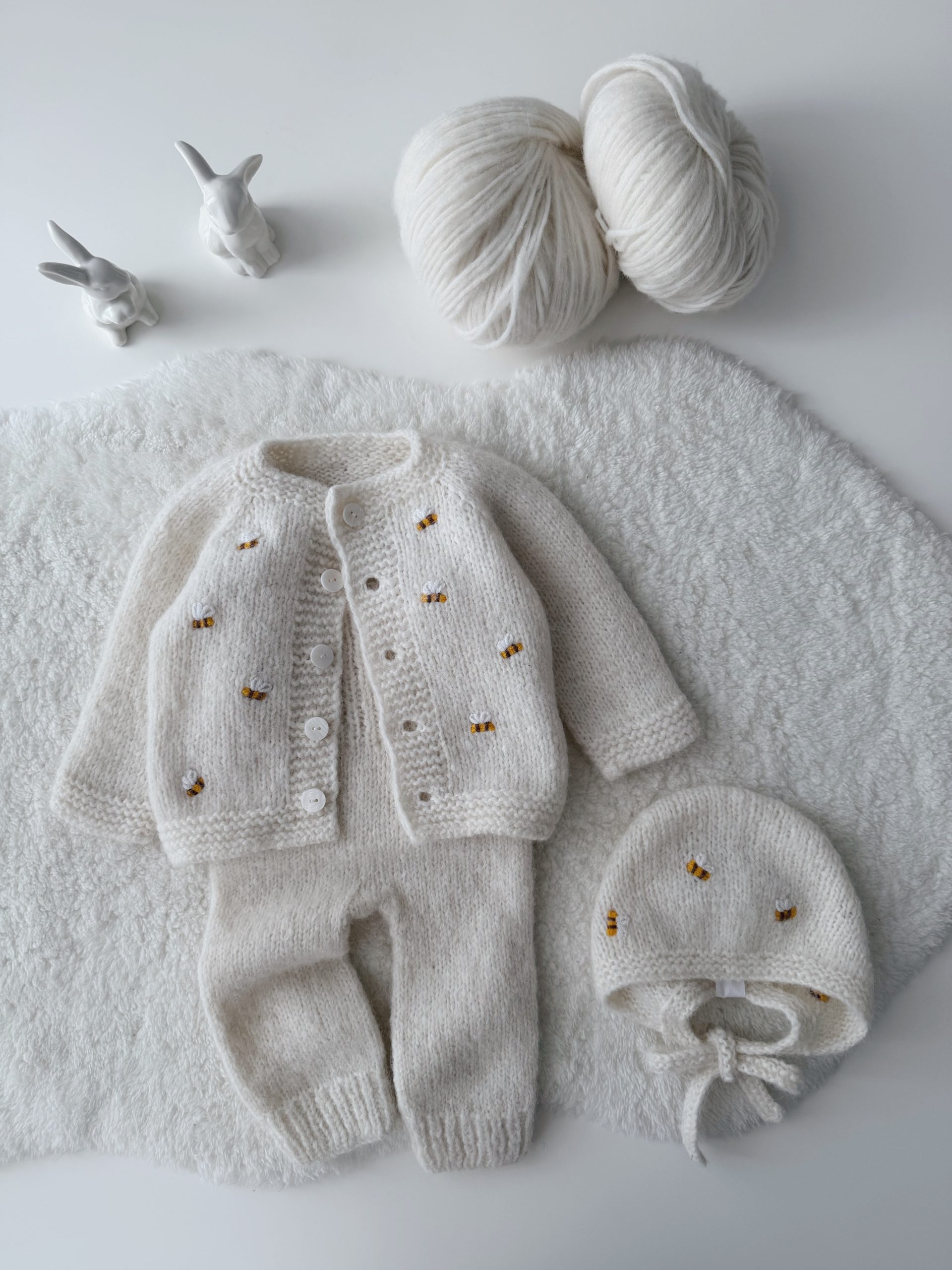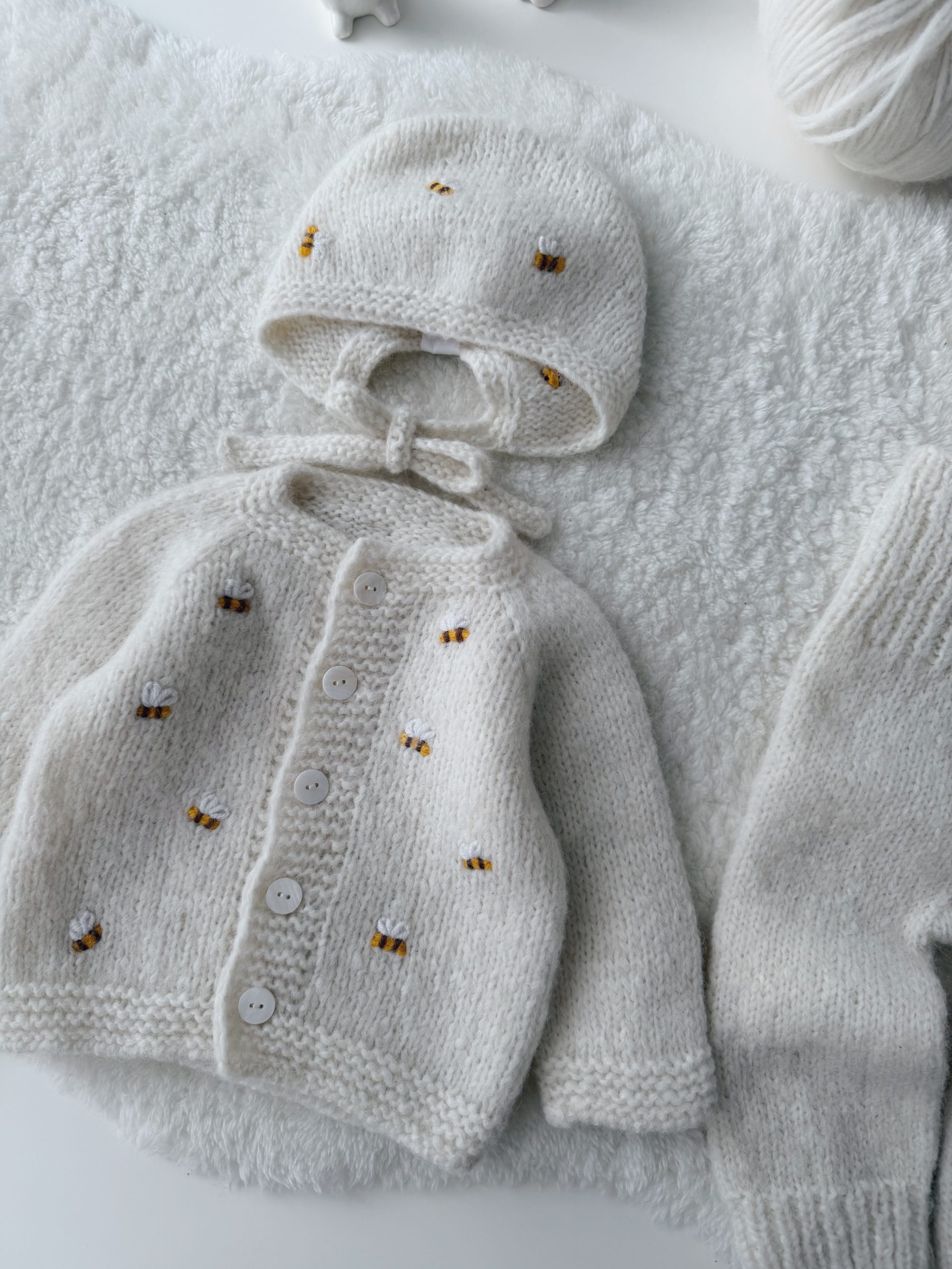 Knit Alpaca Baby Cardigan Romper & Bonnet Set – Cream outfit with bee embroidery