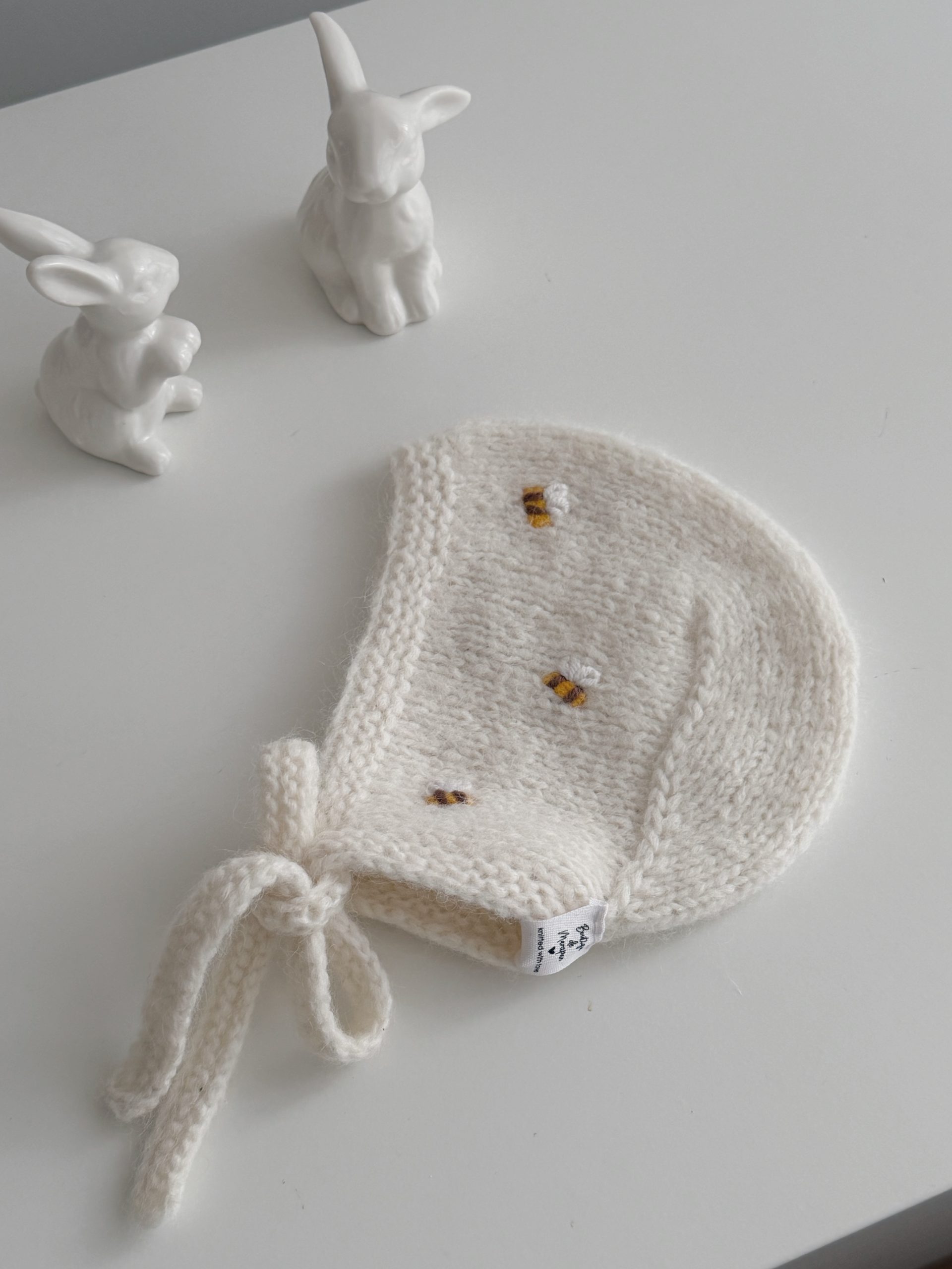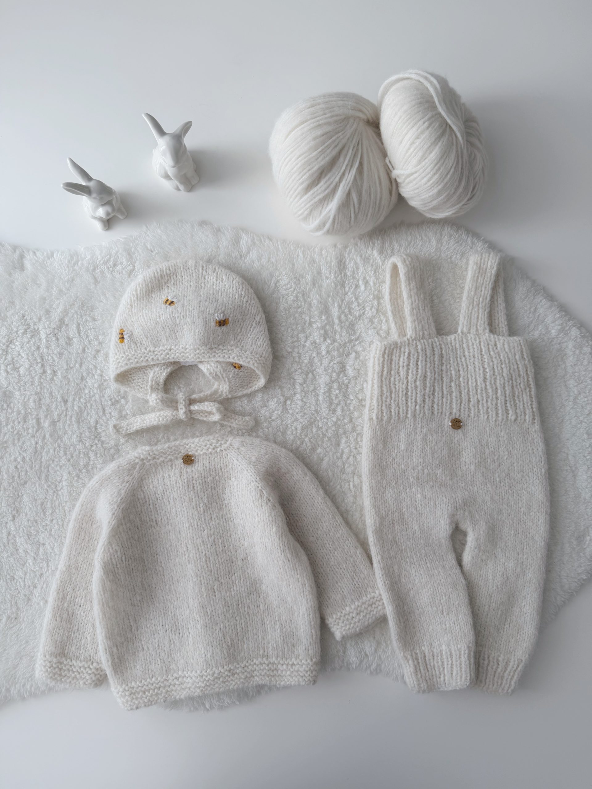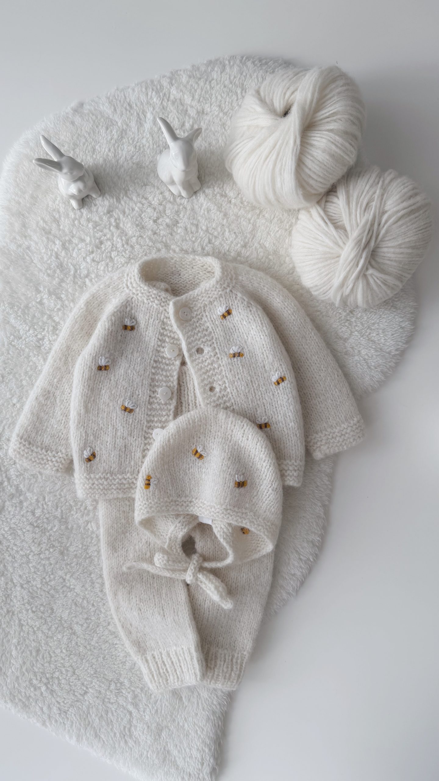 Knit Alpaca Baby Cardigan Romper & Bonnet Set – Cream outfit with bee embroidery