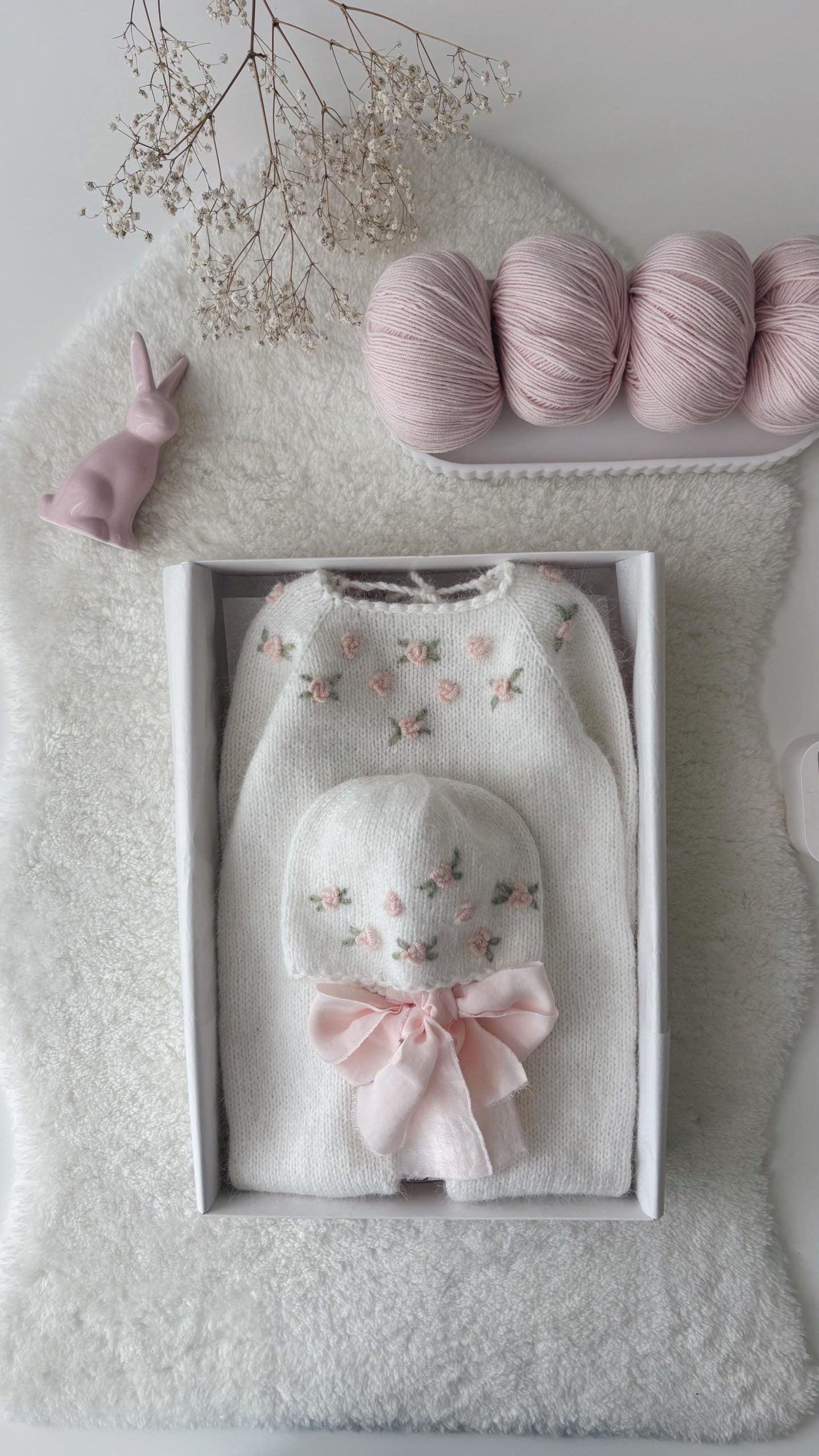 Embroidered Angora Baby Romper & Bonnet Set – Milky White Outfit