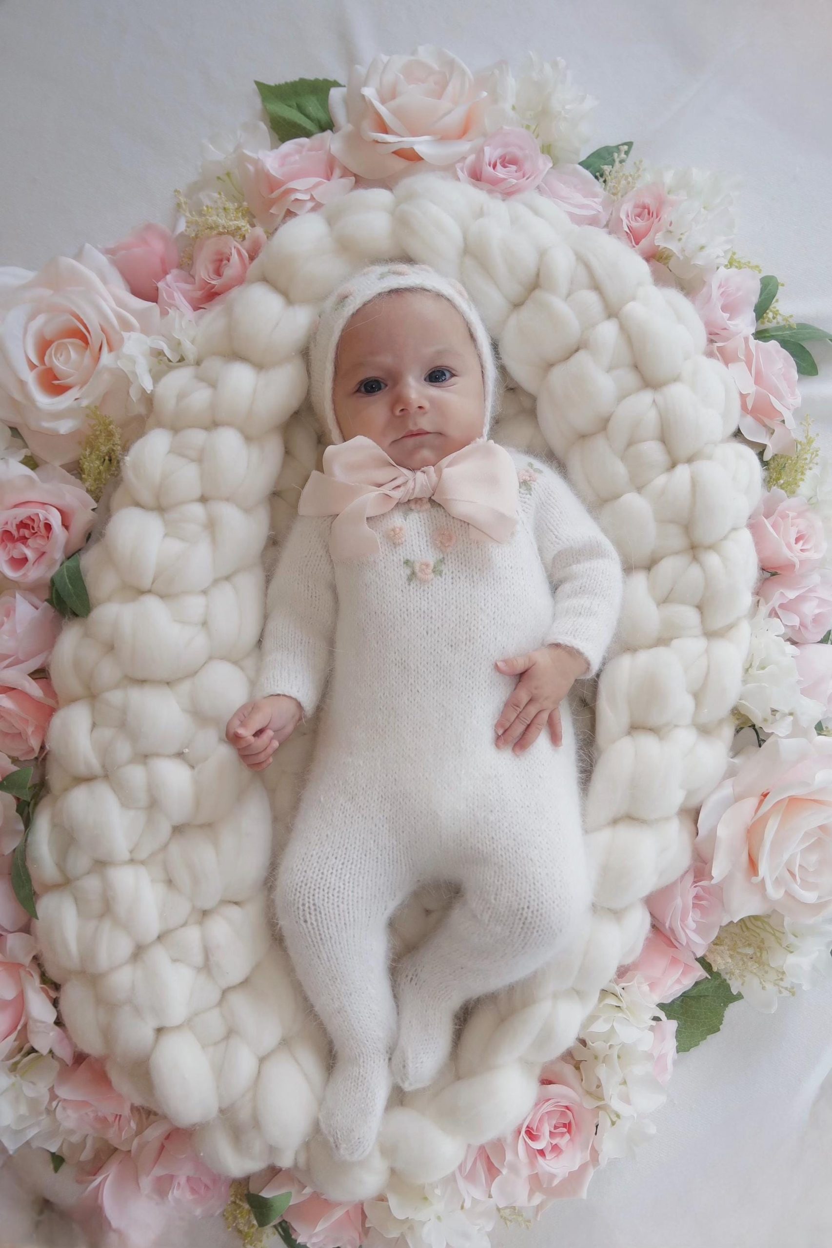 Knit Baby Alpaca Romper and Bonnet Set – Cream Photo Prop