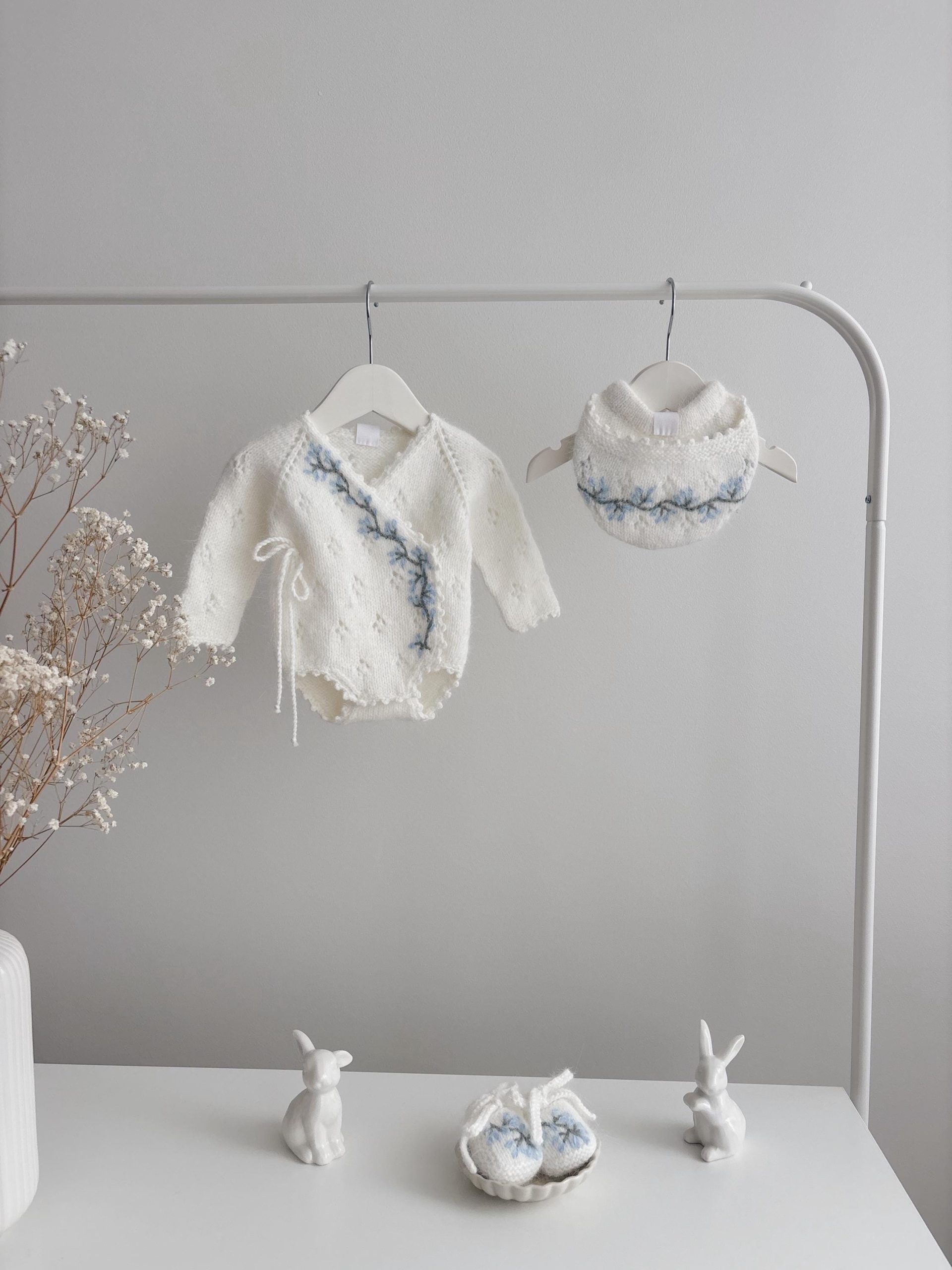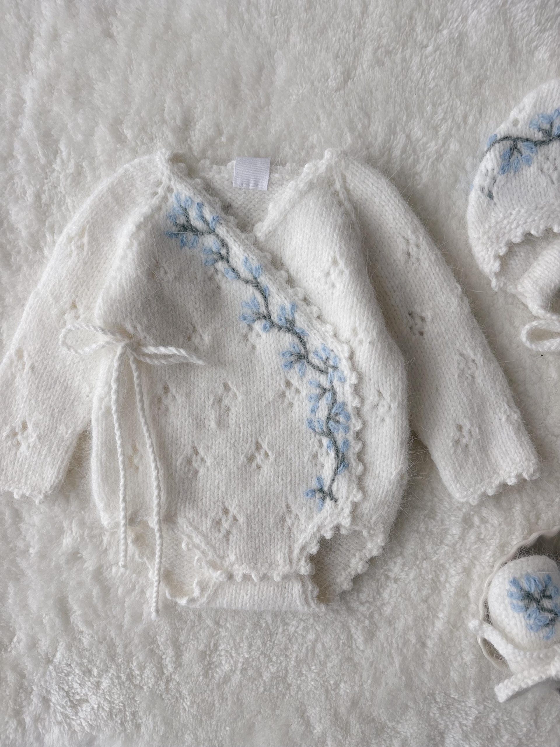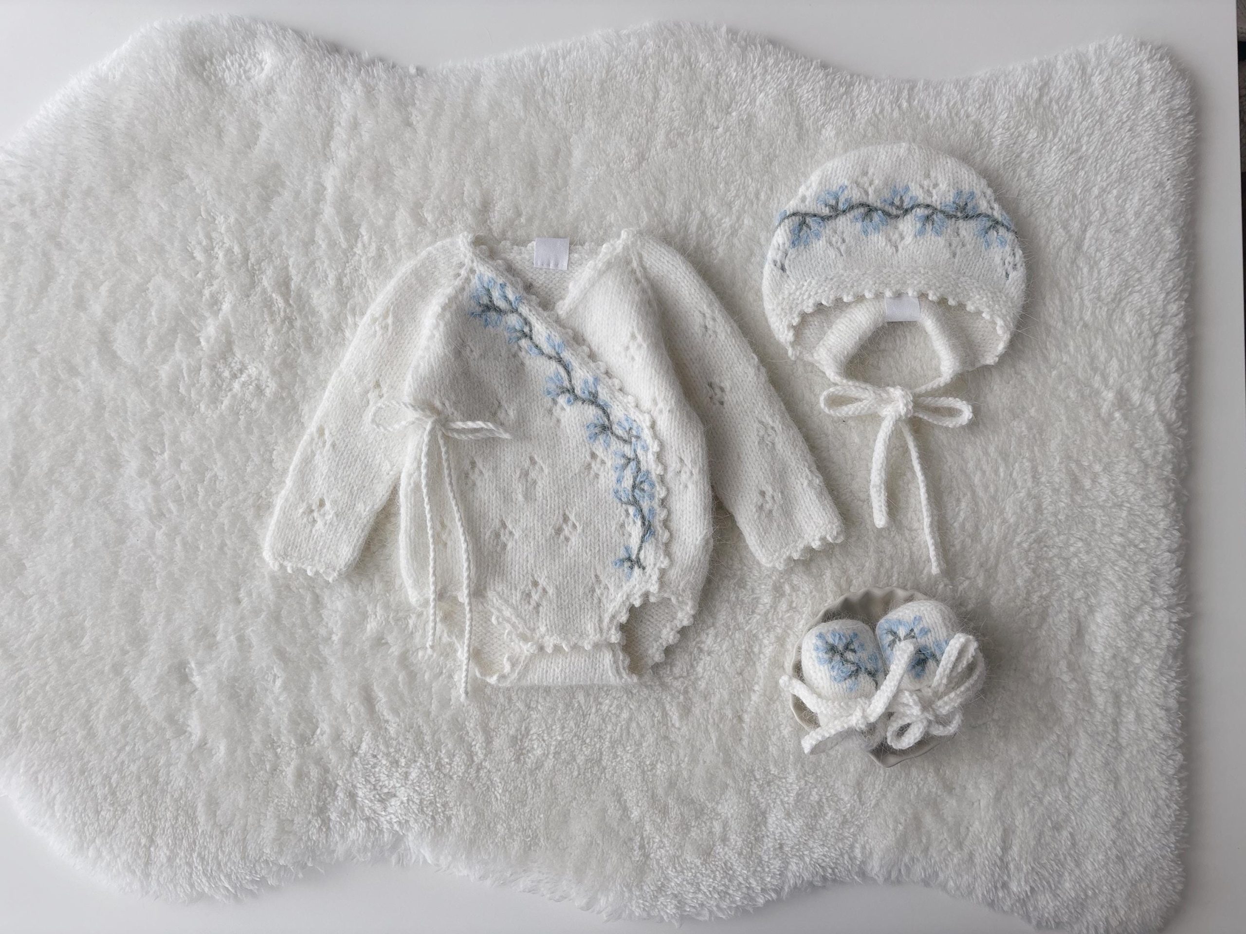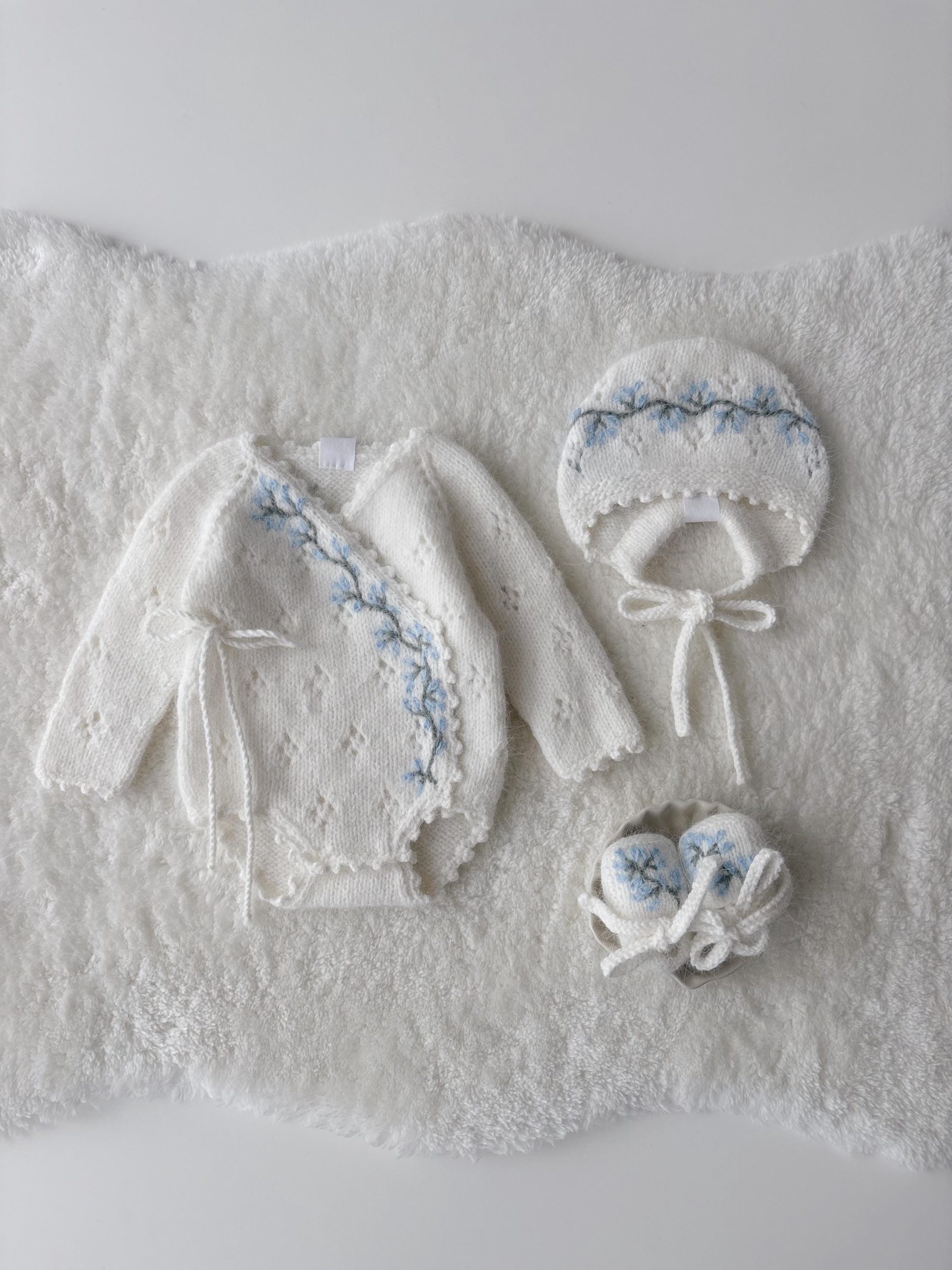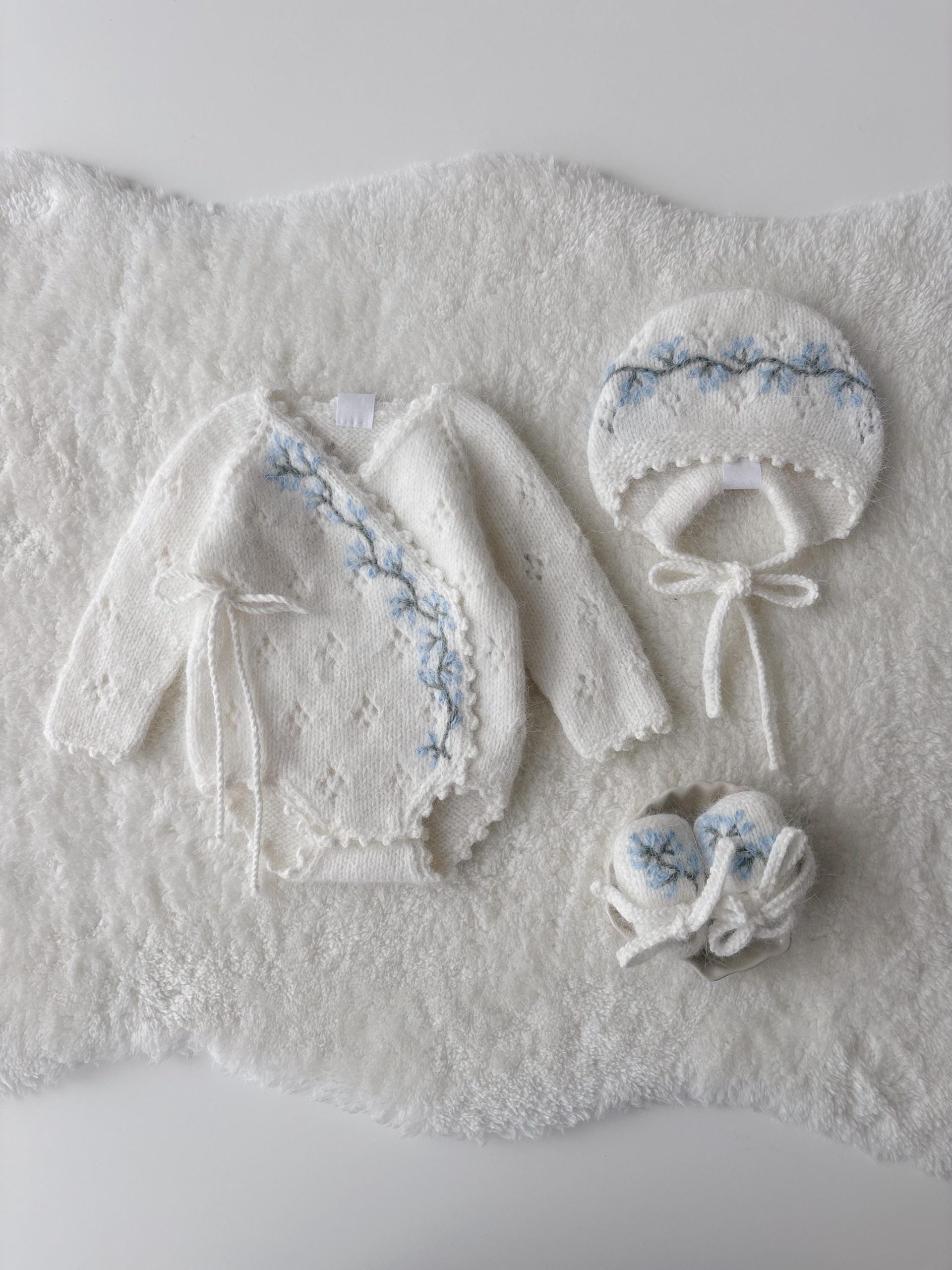 Merino Knit Baby Angel Outfit – Romper, Bonnet & Booties