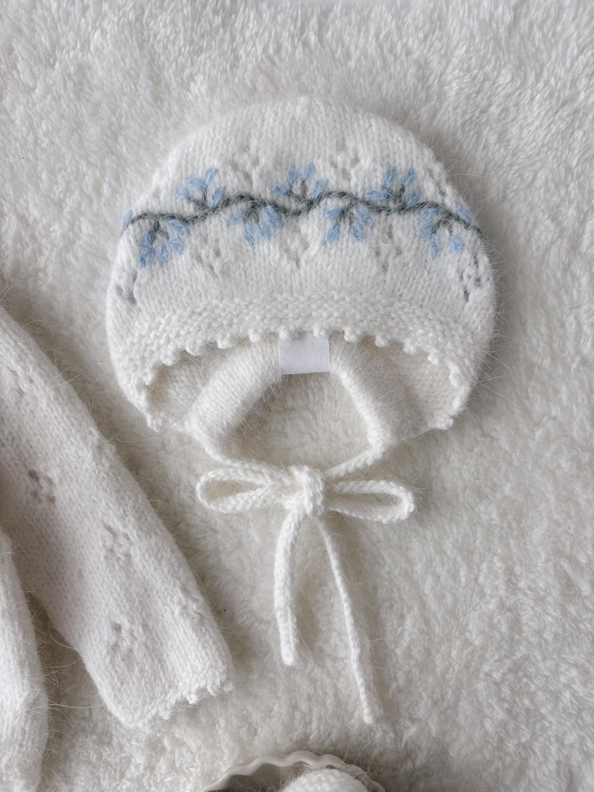 Embroidered Angora Baby Romper & Bonnet Set – Milky White Outfit