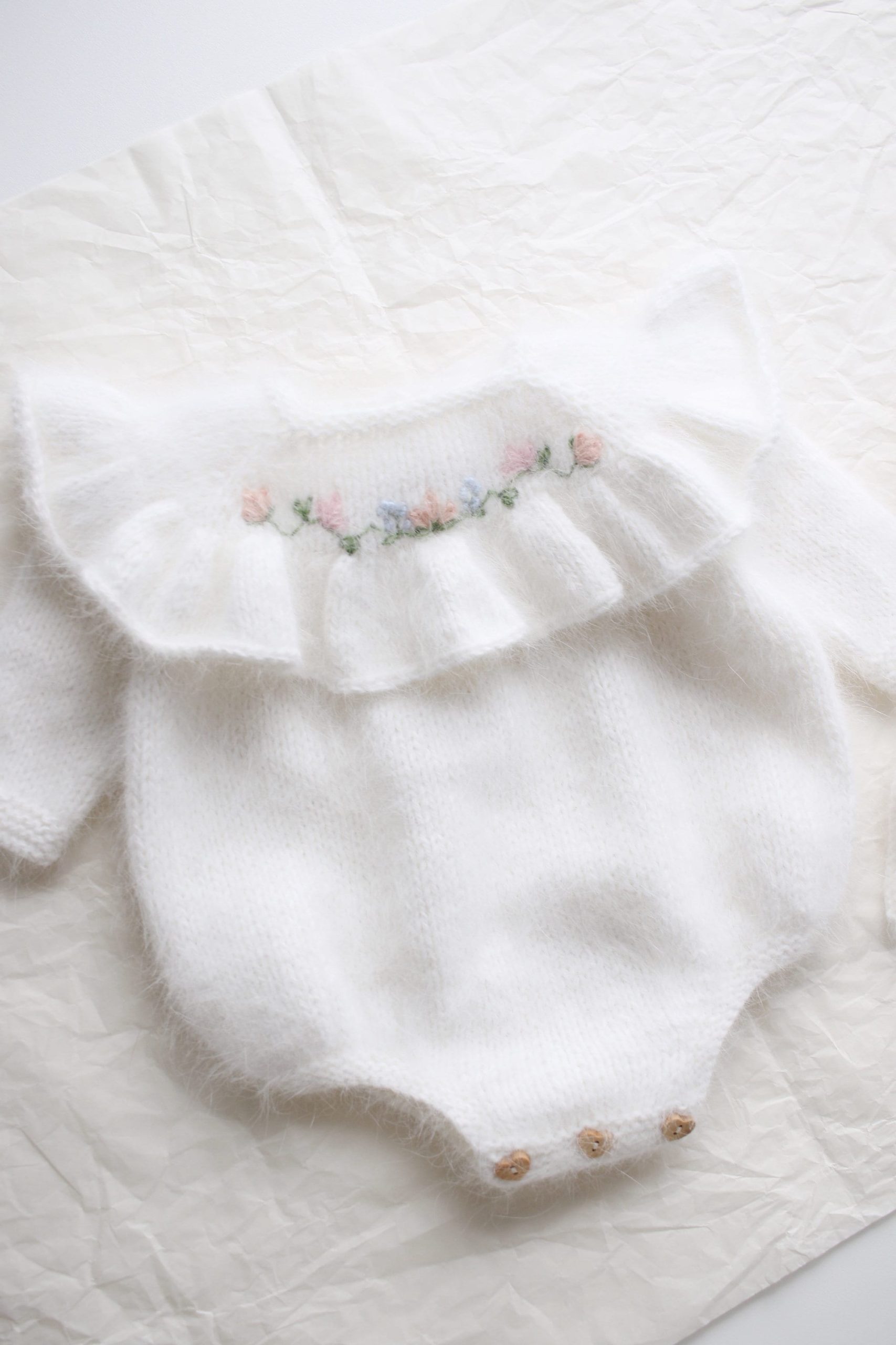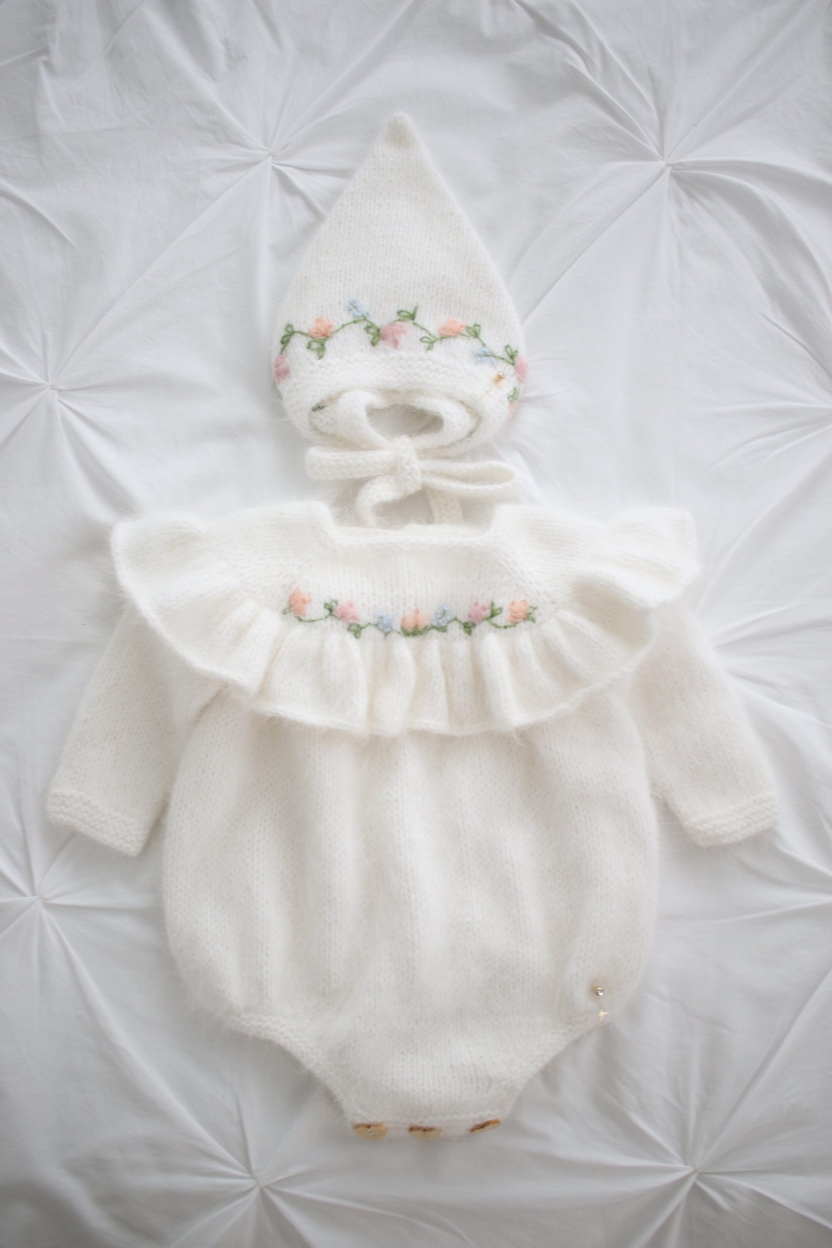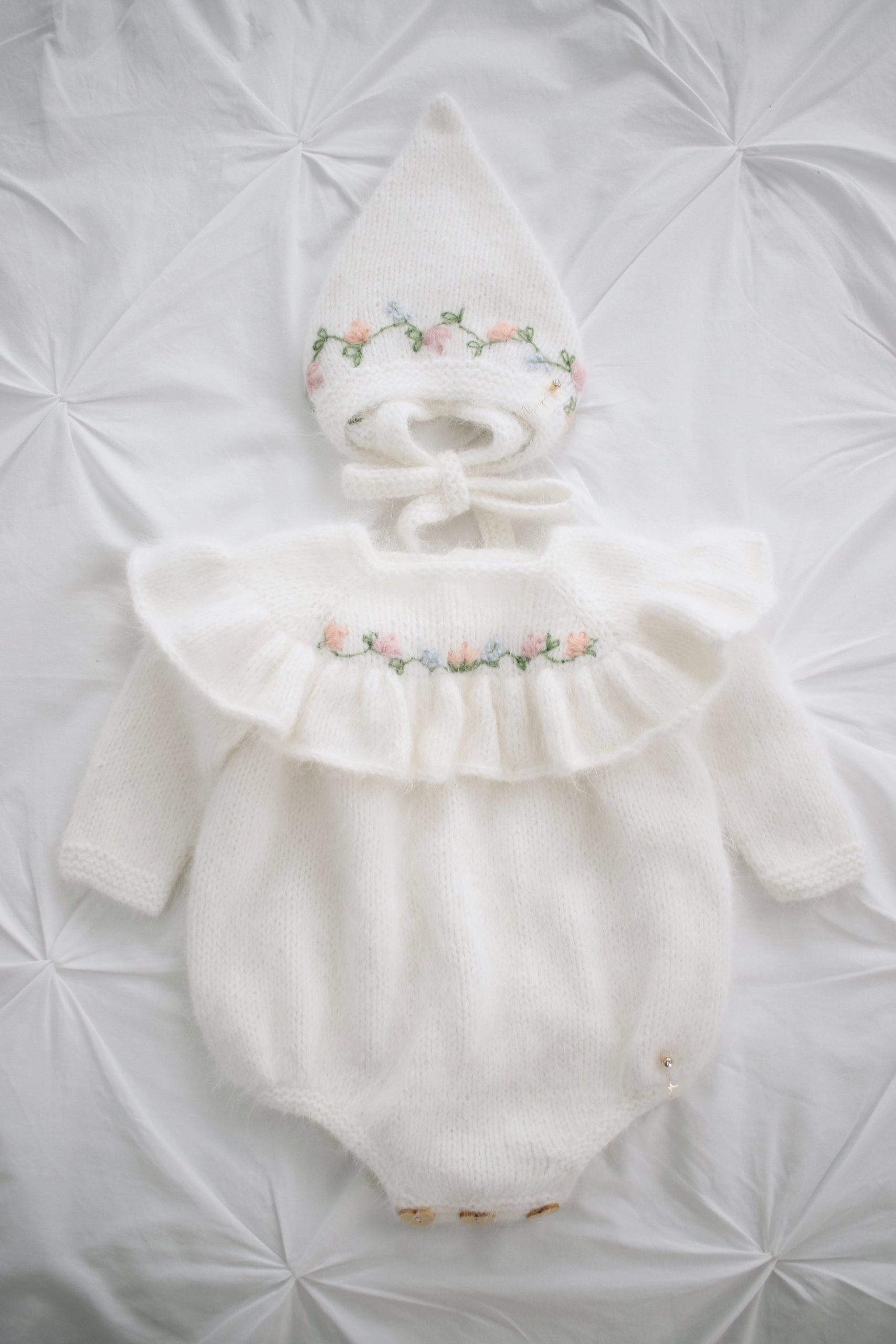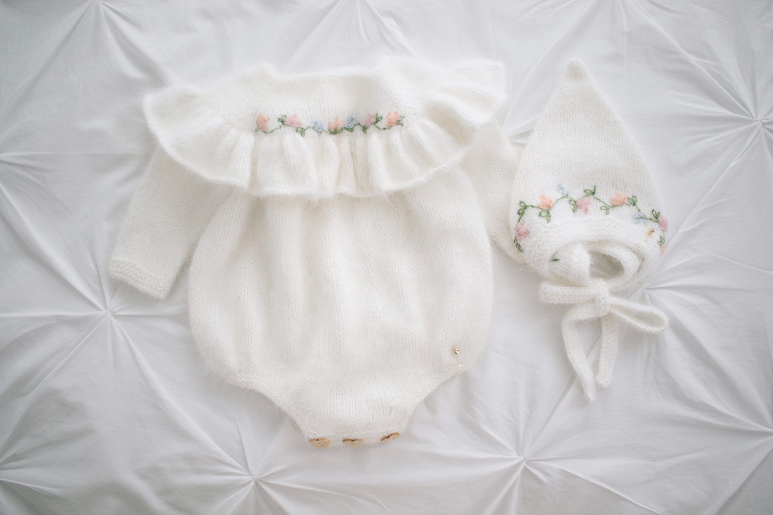 Embroidered Angora Ruffle Romper and Bonnet – Baby Photo Props